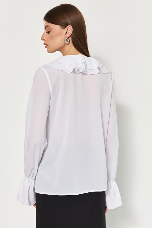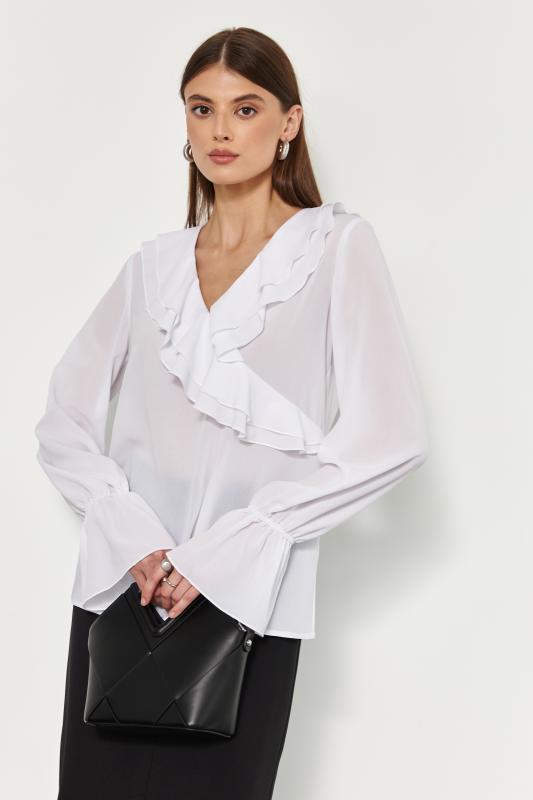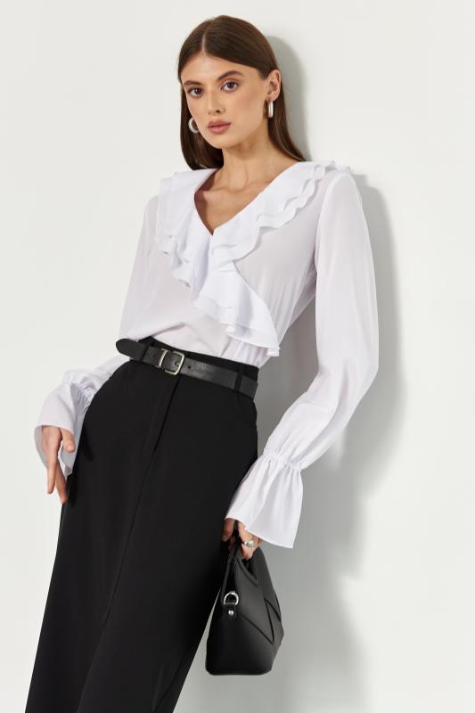 Модель свободного силуэта. По переду и спинке воланы. Застежка на воздушные петли и пуговицы. Воротник стойка с рюшей и завязками. Рукав втачной объемный с двойной манжетой на резинку.