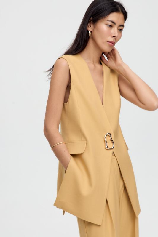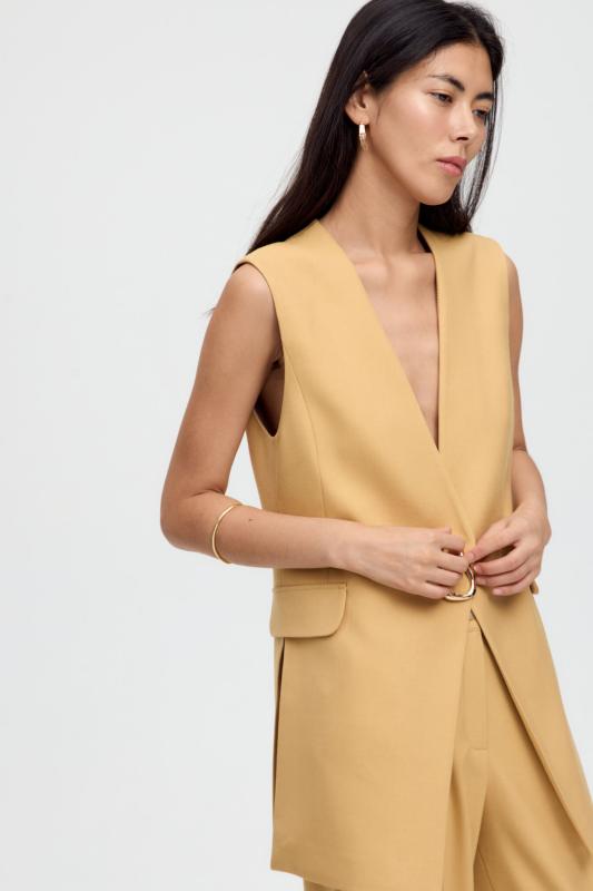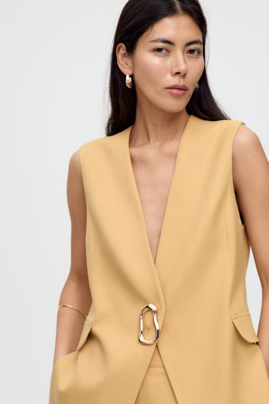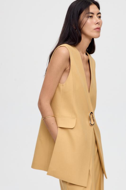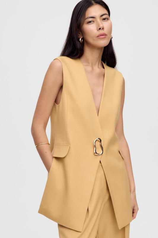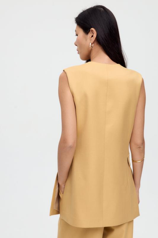Жилет однобортный свободного кроя на подкладе, с пиджачным воротником и застежкой на одну петлю и пуговицу. По переду карманы с клапаном, по спинке средний шов и шлица.