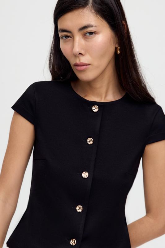 Блуза-жакет из костюмного полотна в ретро-стиле. Модель полуприлегающего силуэта, переходящая в баску. По переду застежка на воздушные петли и акцентные пуговицы. Рукав втачной. Изделие на поливискозном подкладе.