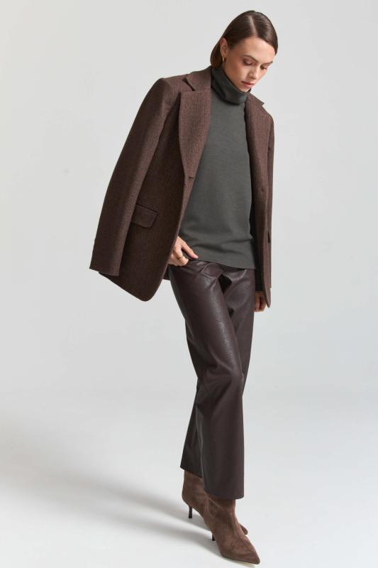 Брюки из фактурной эко кожи в благородном оттенке. Полуприлегающие прямые брюки, слегка зауженные к низу, на притачном поясе со шлевками. По переду карманы, застёжка-гульфик и имитация карманов. По спинке резинка для комфортной посадки.