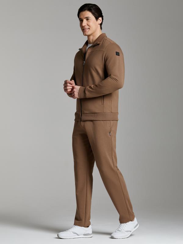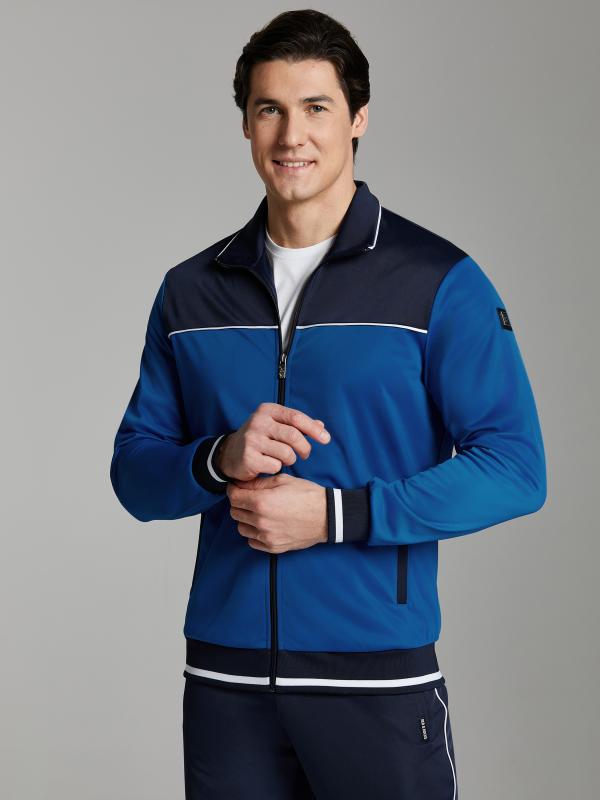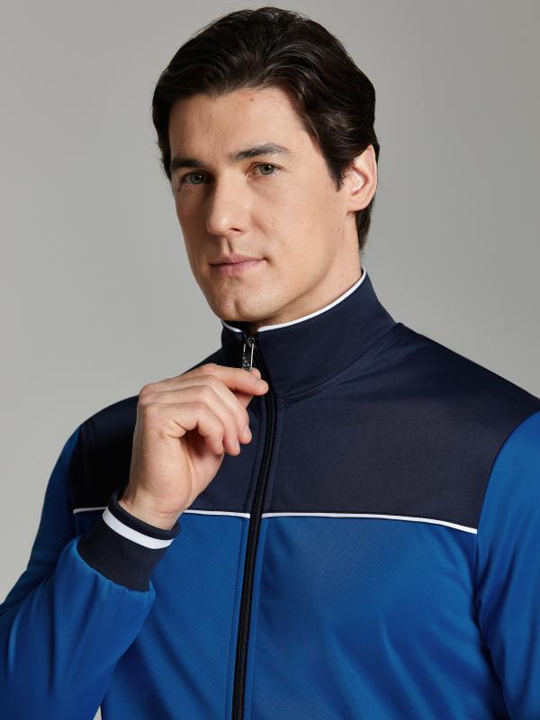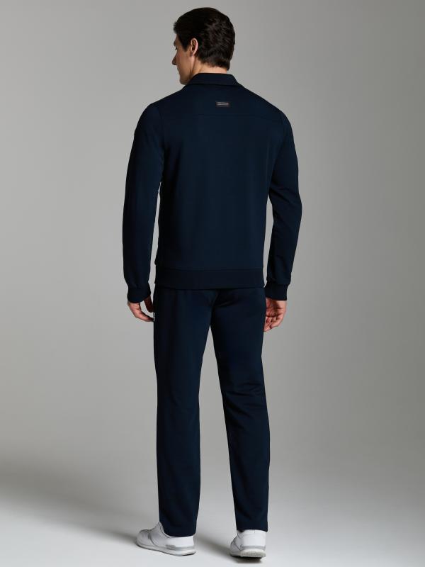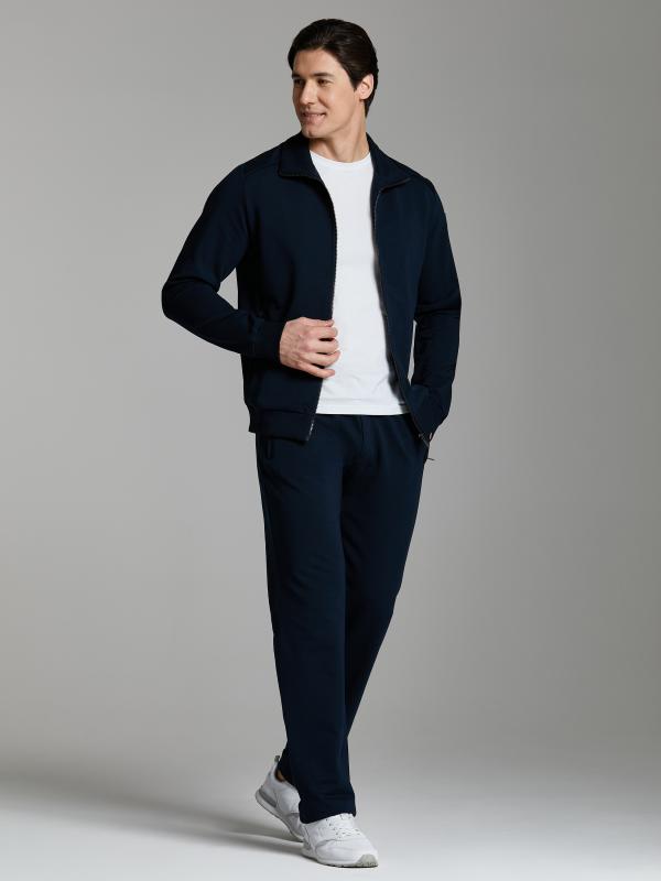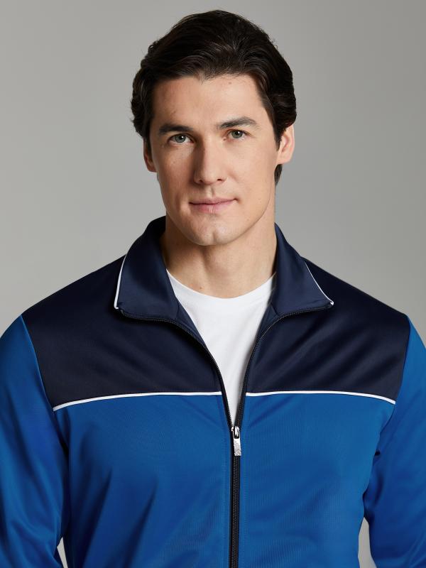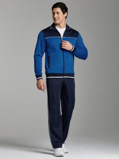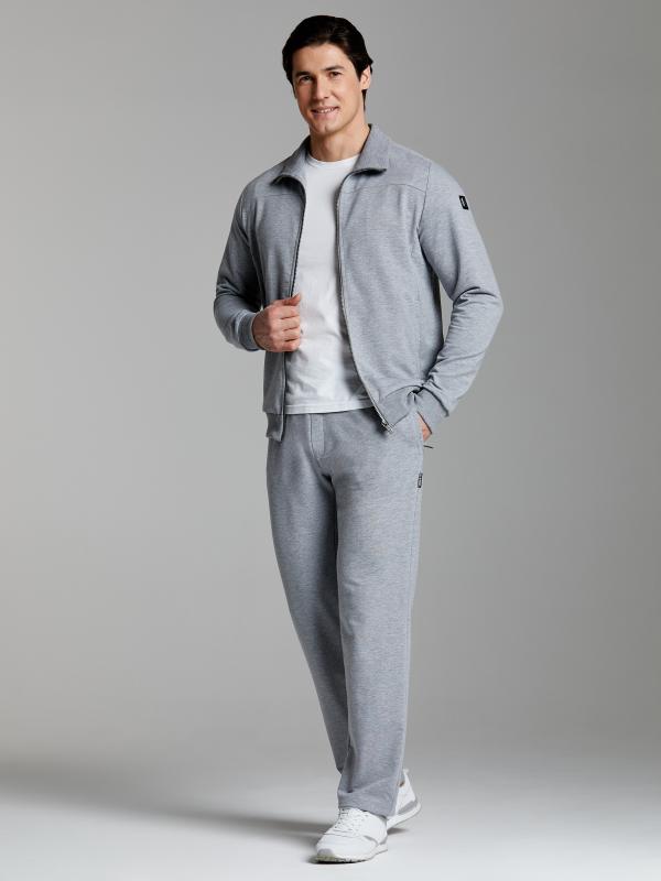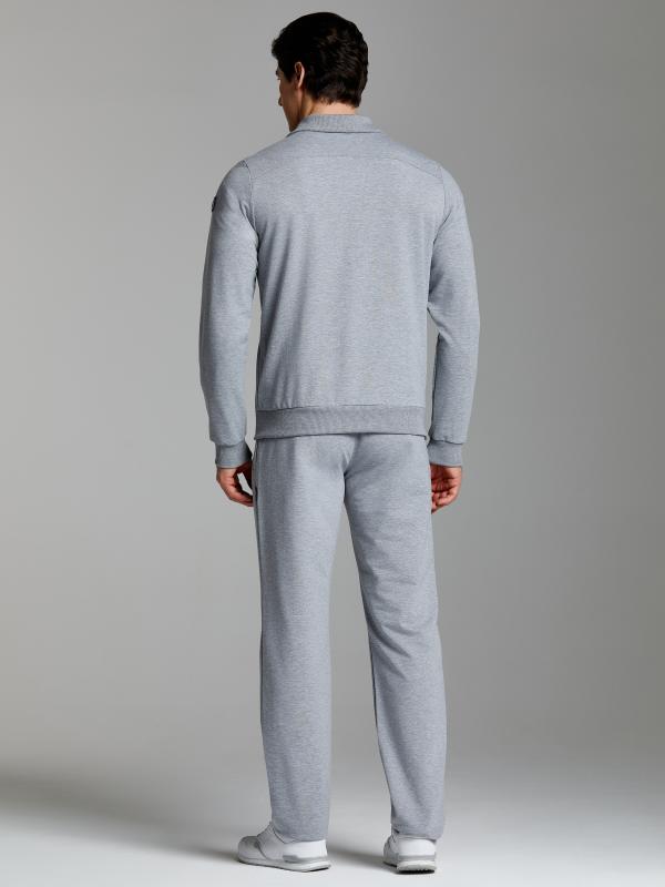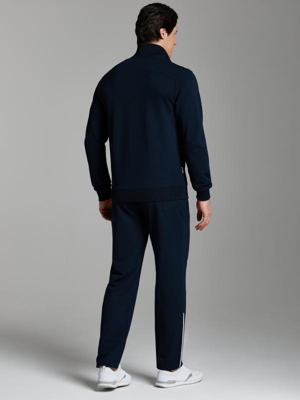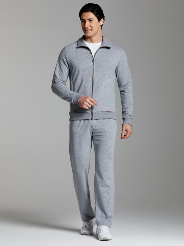 .Мужской спортивный костюм из хлопкового трикотажного полотна с эластаном. Костюм базового прямого силуэта состоит из куртки и брюк. Куртка на поясе с воротником – стойкой, застегивается на молнию. Удобные боковые карманы с молниями расположены в швах боковых вставок. Рукава втачные, низ рукава собран на трикотажную манжету. Дополнительно защищает от ветра воротник-стойка. Карманы брюк прорезные, застегиваются на молнии. На задней половинке брюк справа дополнительный накладной карман. Брюки прямого силуэта, слегка заужены книзу. Пояс брюк по линии талии с эластичной резинкой, дополнительно регулируется шнуром. Слева под кокеткой на куртке и на заднем кармане брюк – нашивка с фирменным логотипом