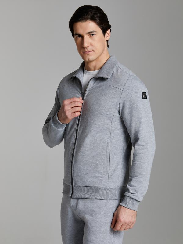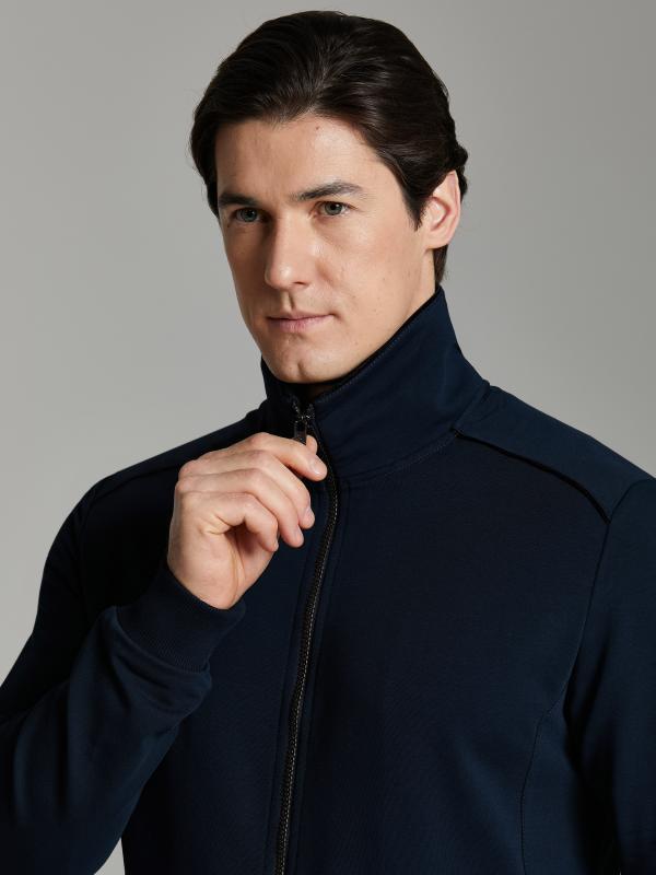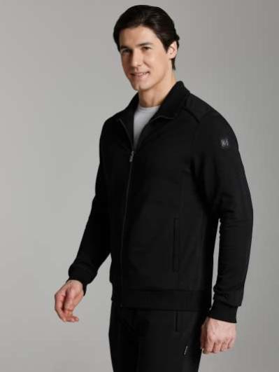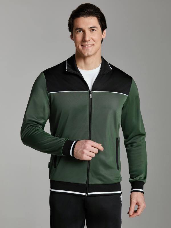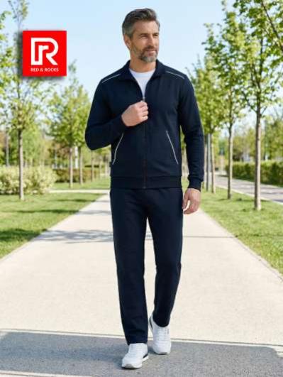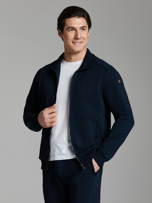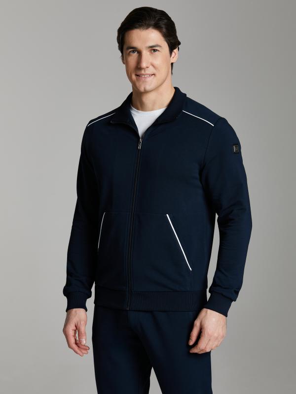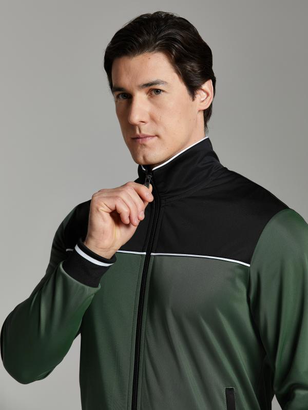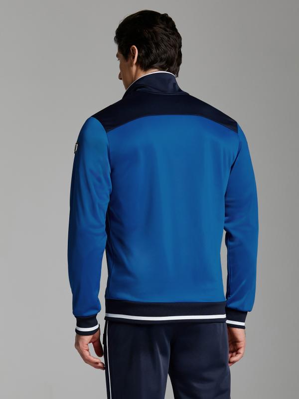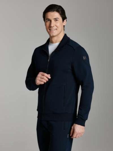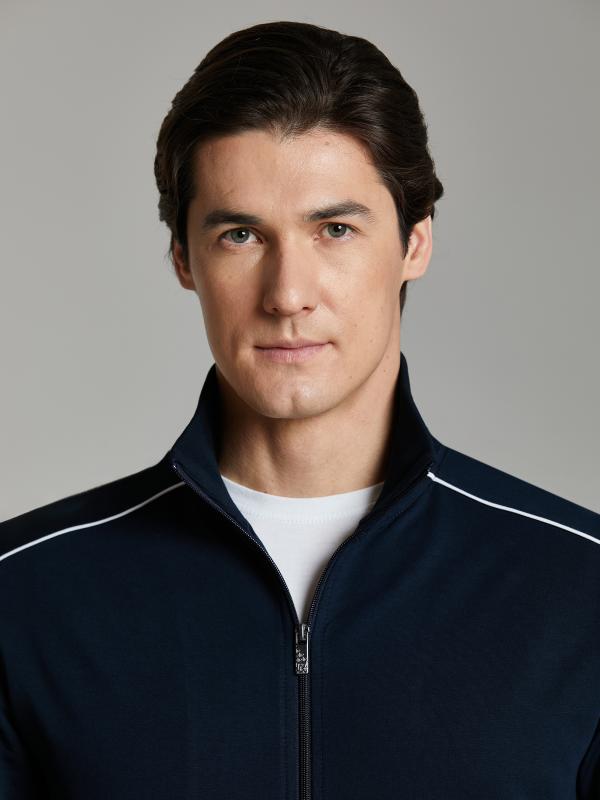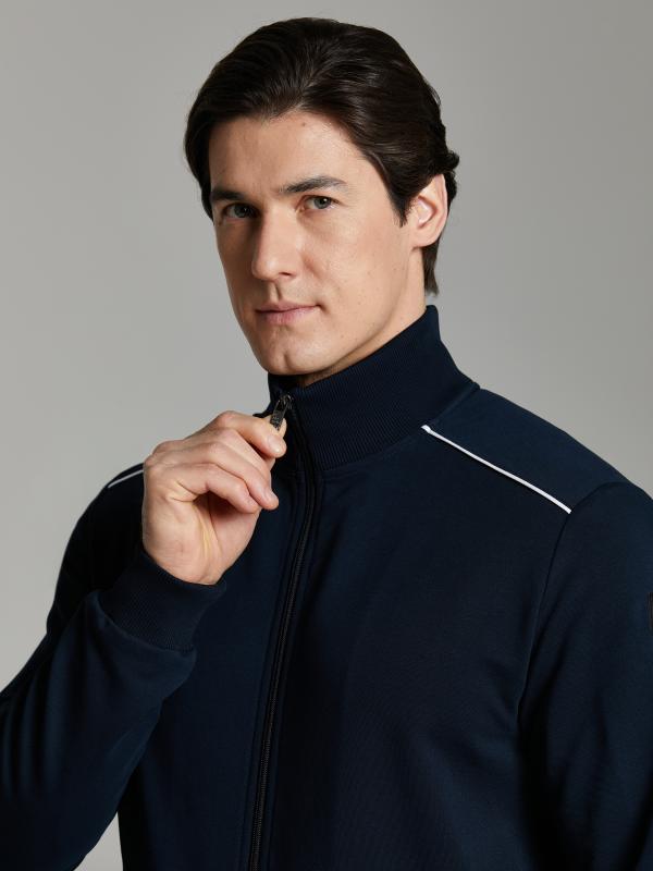 .Мужской спортивный костюм из хлопкового трикотажного полотна с эластаном. Костюм базового прямого силуэта состоит из куртки и брюк. Куртка на поясе с воротником – стойкой, застегивается на молнию. Удобные боковые карманы с молниями расположены в швах боковых вставок. Рукава втачные, низ рукава собран на трикотажную манжету. Дополнительно защищает от ветра воротник-стойка. Карманы брюк прорезные, застегиваются на молнии. На задней половинке брюк справа дополнительный накладной карман. Брюки прямого силуэта, слегка заужены книзу. Пояс брюк по линии талии с эластичной резинкой, дополнительно регулируется шнуром. Слева под кокеткой на куртке и на заднем кармане брюк – нашивка с фирменным логотипом