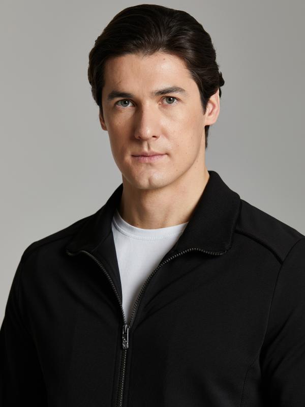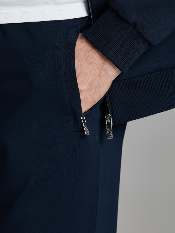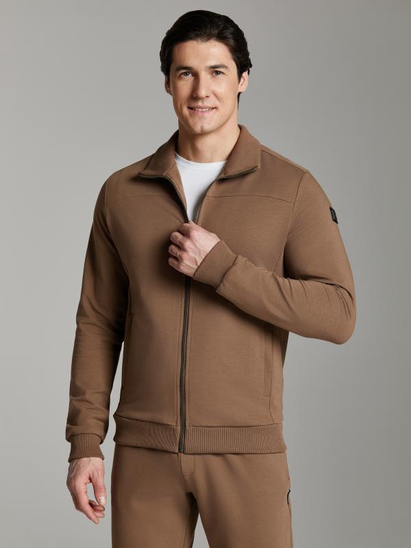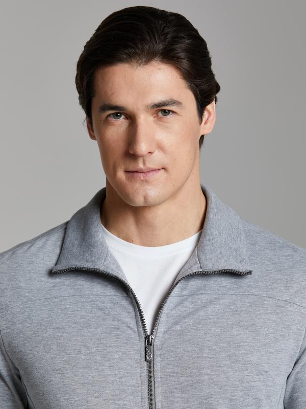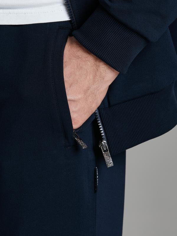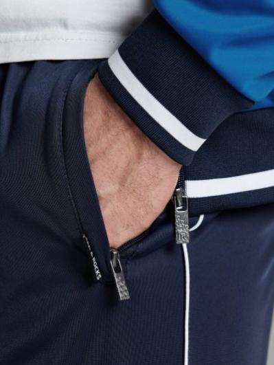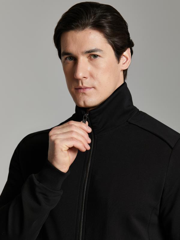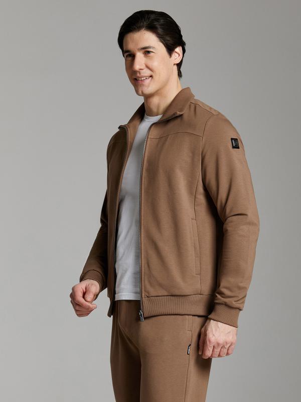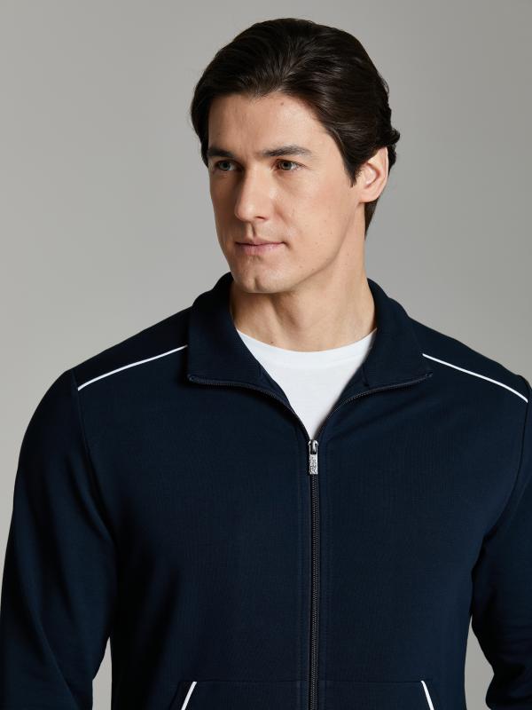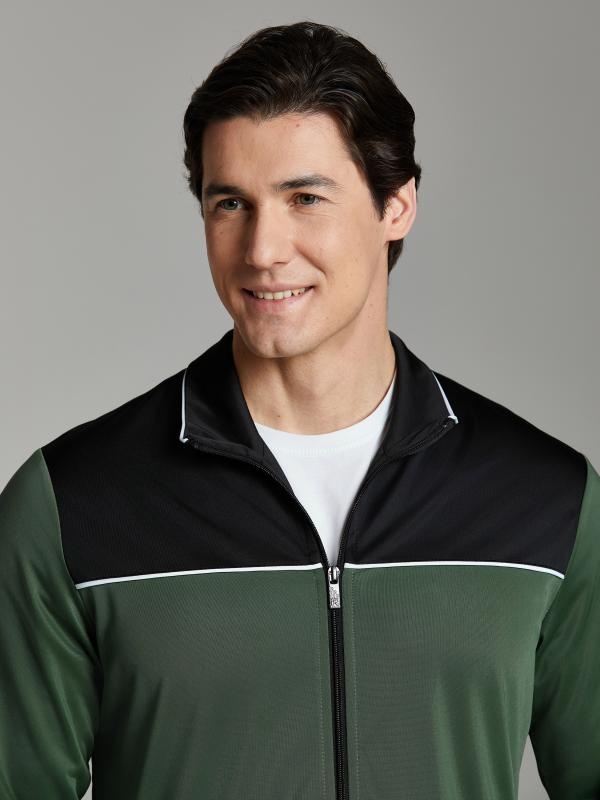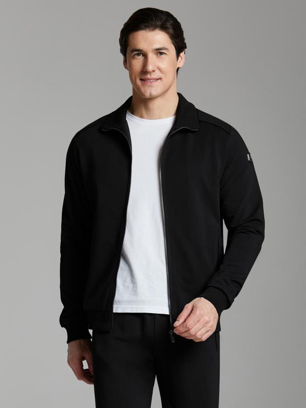 .Мужской спортивный костюм из хлопкового трикотажного полотна с эластаном. Костюм базового прямого силуэта состоит из куртки и брюк. Куртка на поясе с воротником – стойкой, застегивается на молнию. Удобные боковые карманы с молниями расположены в швах боковых вставок. Рукава втачные, низ рукава собран на трикотажную манжету. Дополнительно защищает от ветра воротник-стойка. Карманы брюк прорезные, застегиваются на молнии. На задней половинке брюк справа дополнительный накладной карман. Брюки прямого силуэта, слегка заужены книзу. Пояс брюк по линии талии с эластичной резинкой, дополнительно регулируется шнуром. Слева под кокеткой на куртке и на заднем кармане брюк – нашивка с фирменным логотипом