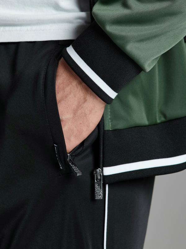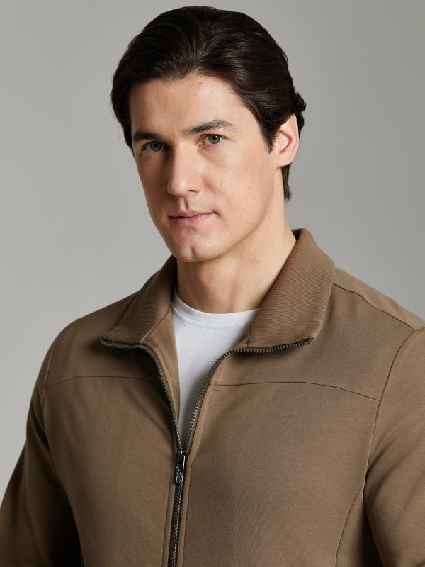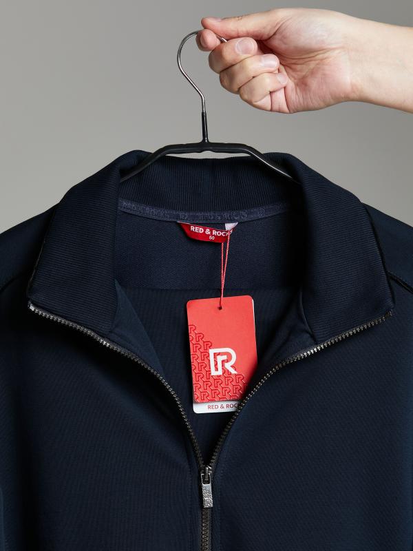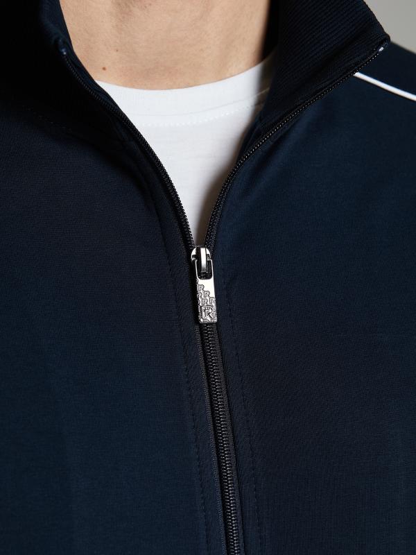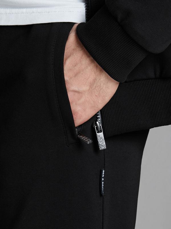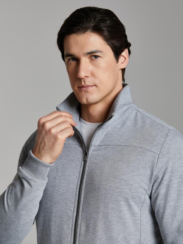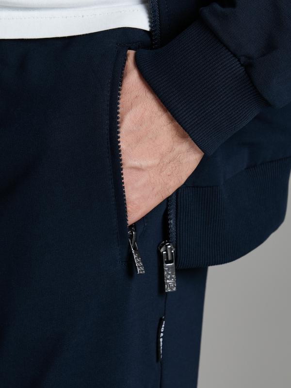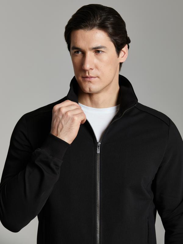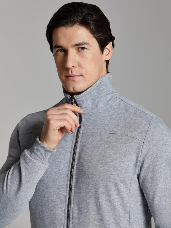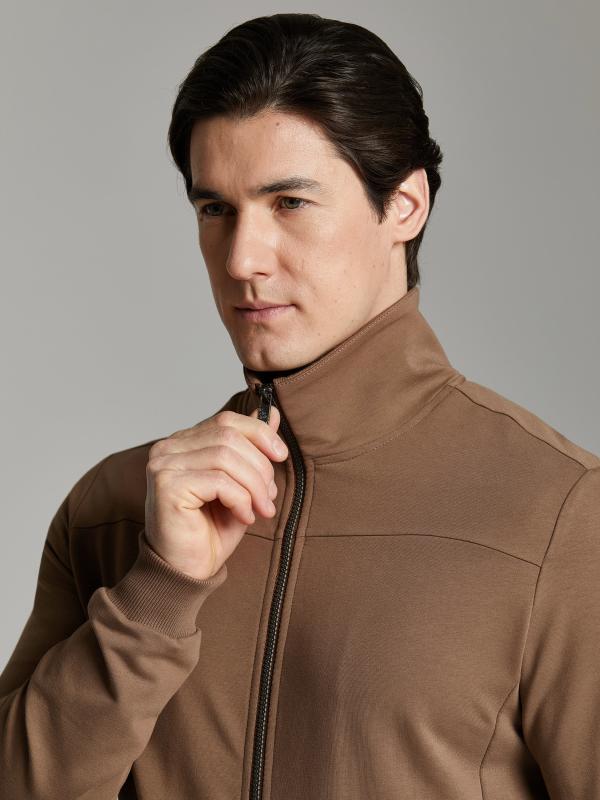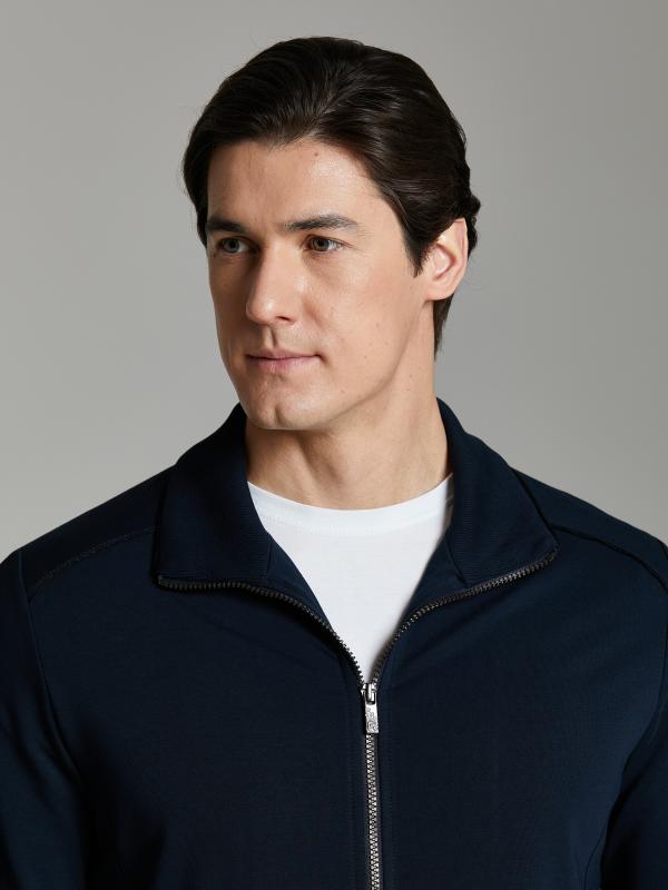 .Мужской спортивный костюм из хлопкового трикотажного полотна с эластаном. Костюм базового прямого силуэта состоит из куртки и брюк. Куртка на поясе с воротником – стойкой, застегивается на молнию. Удобные боковые карманы с молниями расположены в швах боковых вставок. Рукава втачные, низ рукава собран на трикотажную манжету. Дополнительно защищает от ветра воротник-стойка. Карманы брюк прорезные, застегиваются на молнии. На задней половинке брюк справа дополнительный накладной карман. Брюки прямого силуэта, слегка заужены книзу. Пояс брюк по линии талии с эластичной резинкой, дополнительно регулируется шнуром. Слева под кокеткой на куртке и на заднем кармане брюк – нашивка с фирменным логотипом