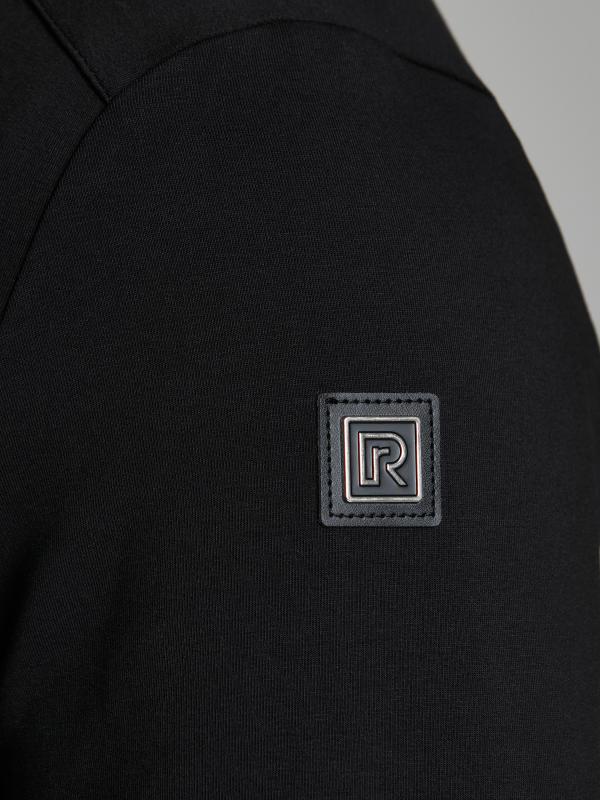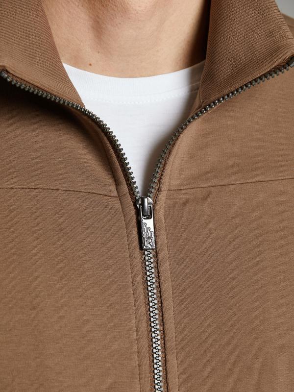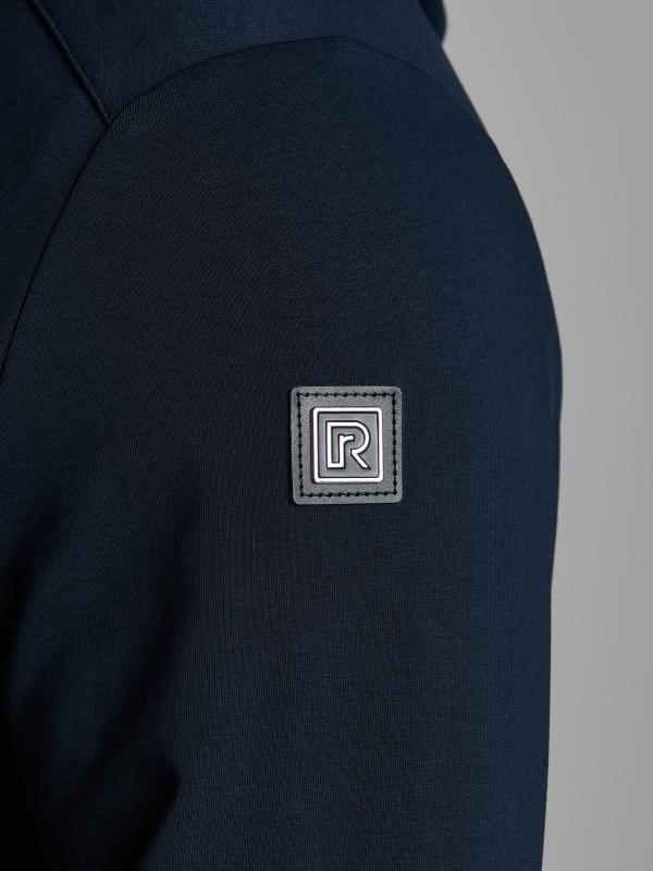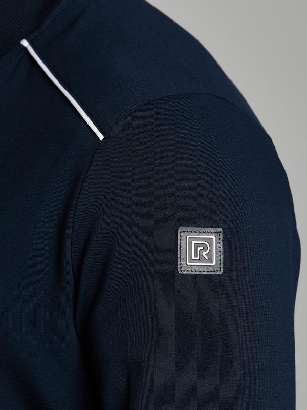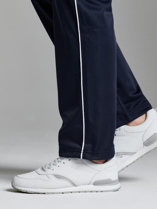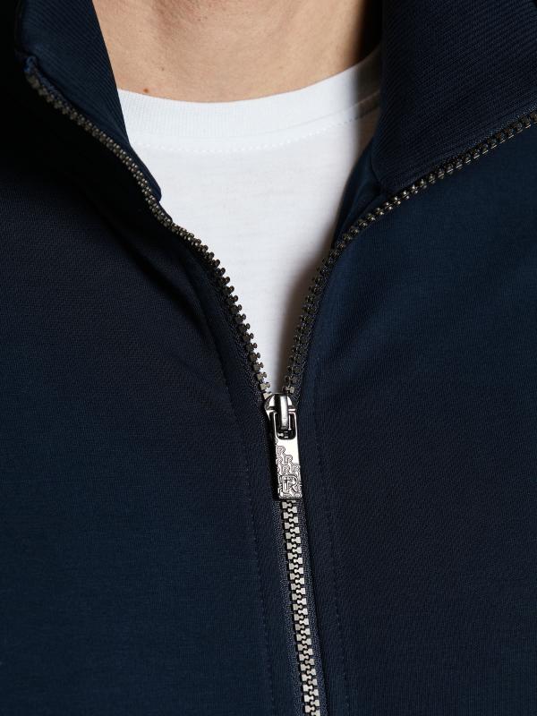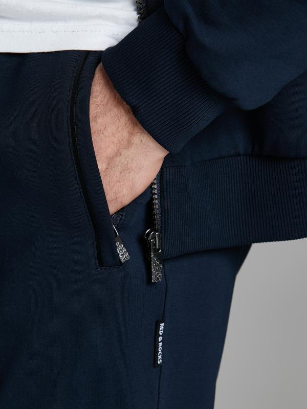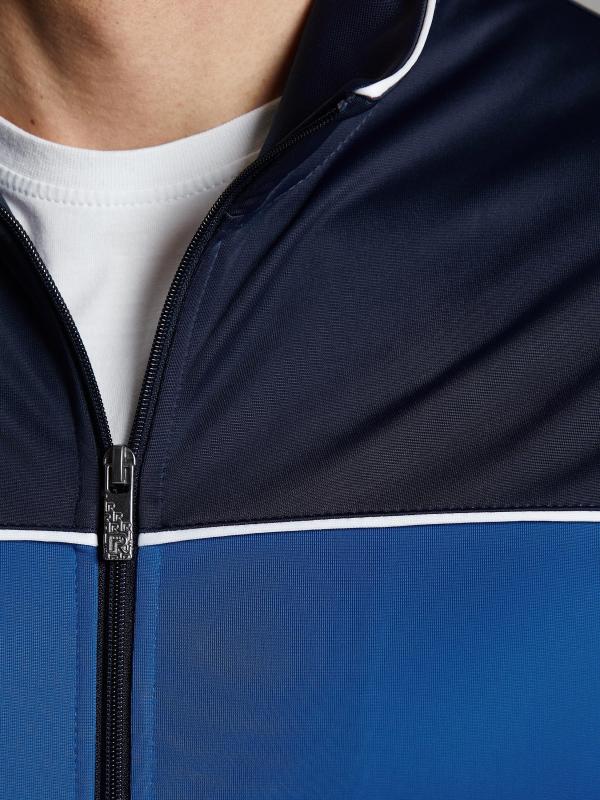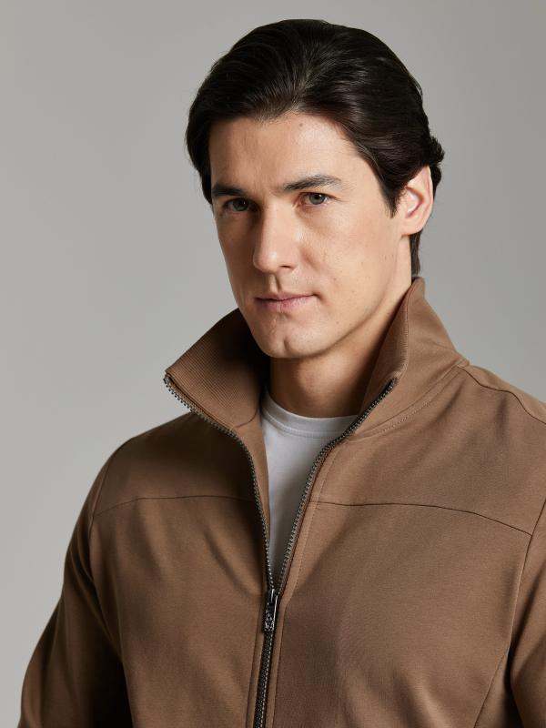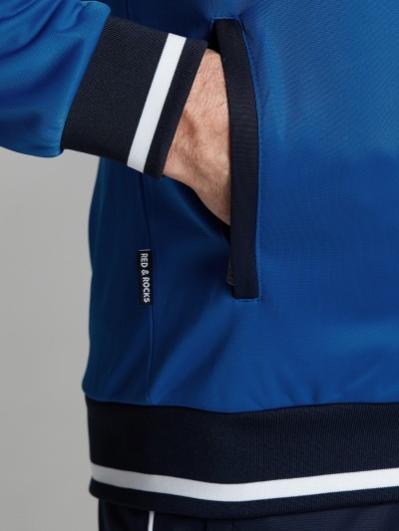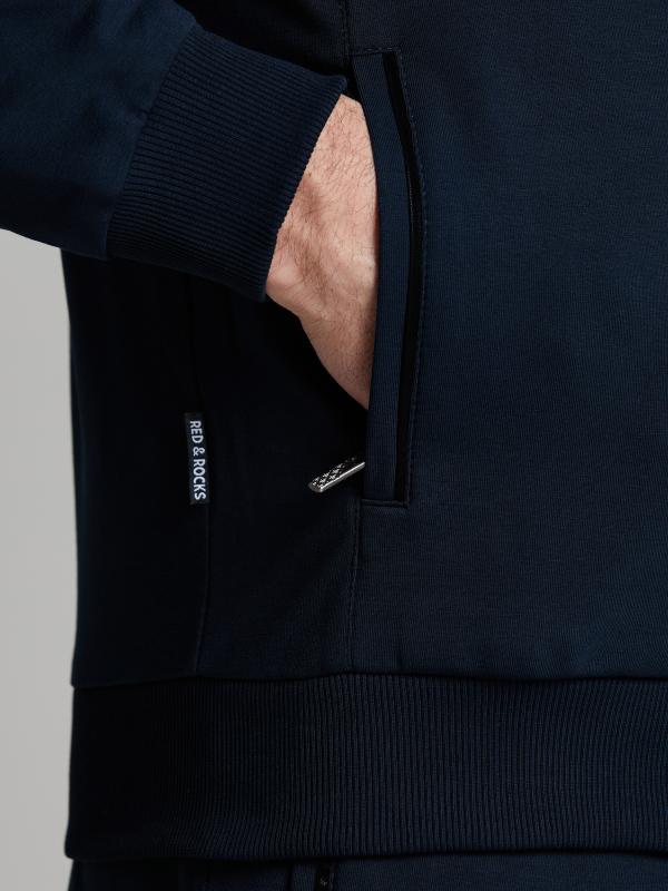 .Мужской спортивный костюм из хлопкового трикотажного полотна с эластаном. Костюм базового прямого силуэта состоит из куртки и брюк. Куртка на поясе с воротником – стойкой, застегивается на молнию. Удобные боковые карманы с молниями расположены в швах боковых вставок. Рукава втачные, низ рукава собран на трикотажную манжету. Дополнительно защищает от ветра воротник-стойка. Карманы брюк прорезные, застегиваются на молнии. На задней половинке брюк справа дополнительный накладной карман. Брюки прямого силуэта, слегка заужены книзу. Пояс брюк по линии талии с эластичной резинкой, дополнительно регулируется шнуром. Слева под кокеткой на куртке и на заднем кармане брюк – нашивка с фирменным логотипом
