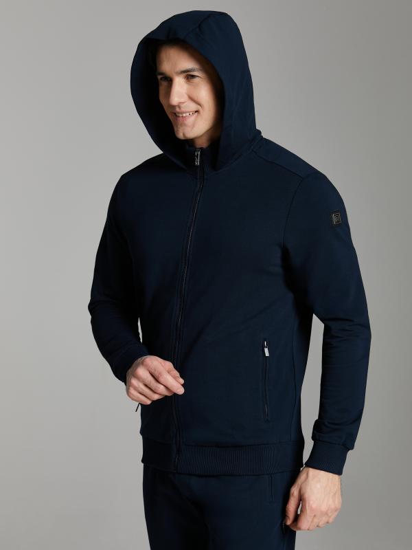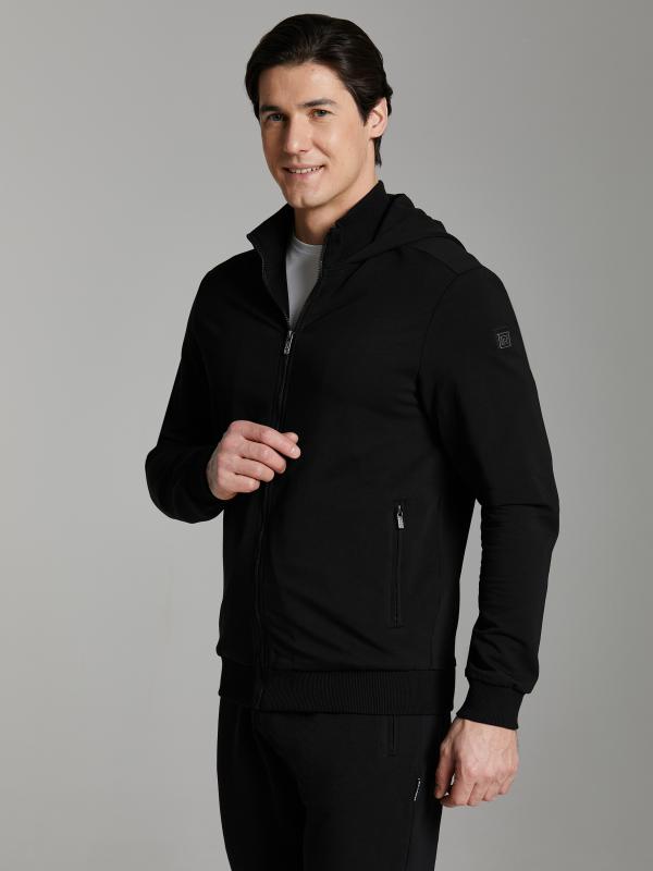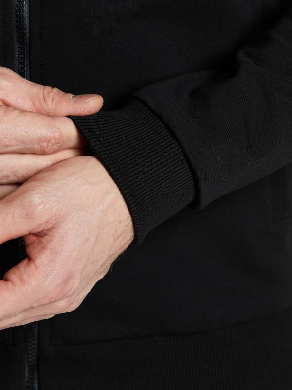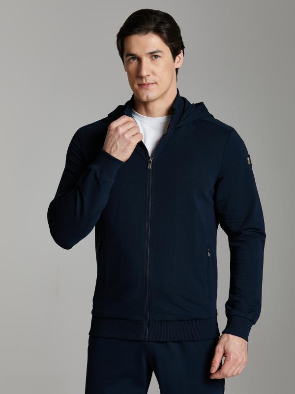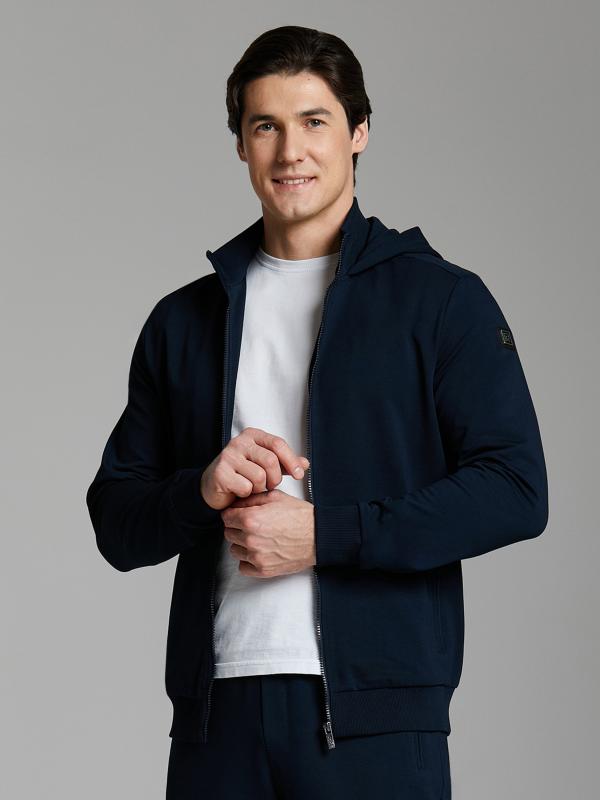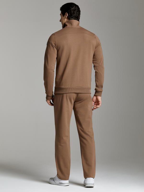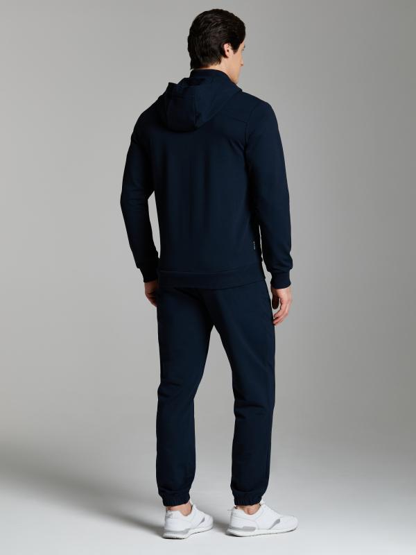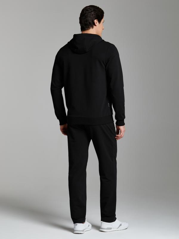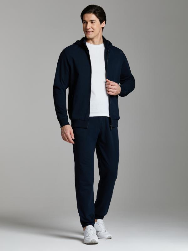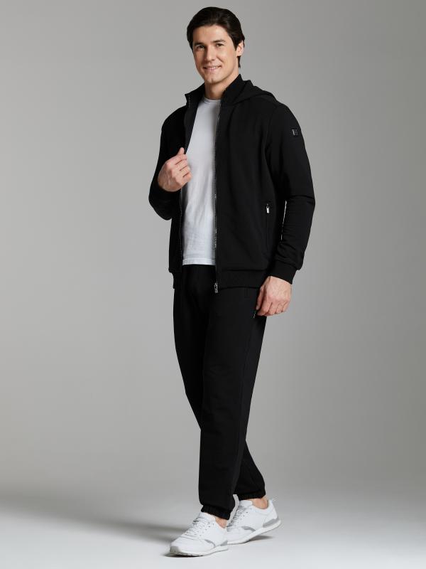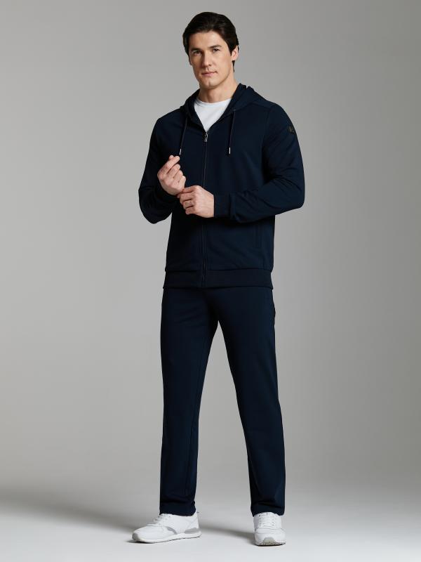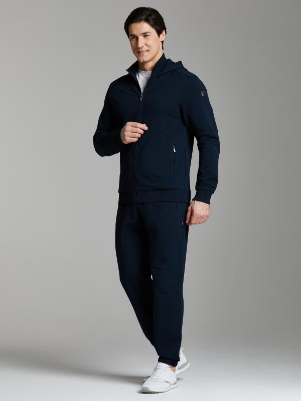 Мужской спортивный костюм из хлопкового трикотажного полотна с эластаном. Костюм базового прямого силуэта состоит из куртки и брюк. Куртка на поясе с капюшоном и воротником, застегивается на молнию. Удобные прорезные боковые карманы с молниями. Рукава втачные, низ рукава собран на трикотажную манжету. Высокая эластичная стойка совмещена с капюшоном, который служит для дополнительной защиты от холодного ветра. Карманы брюк прорезные, застегиваются на молнии. На задней половинке брюк справа дополнительный прорезной карман, так же снабженный застежкой молнией. Брюки прямого силуэта, заужены книзу манжетами. Пояс брюк по линии талии с эластичной резинкой, дополнительно регулируется шнуром. Слева на плечевой части рукава – шеврон с фирменным логотипом.