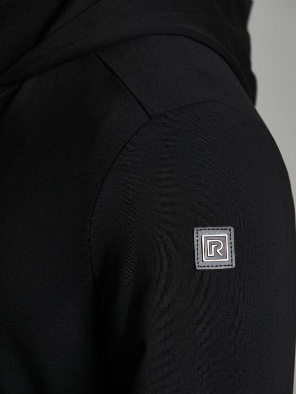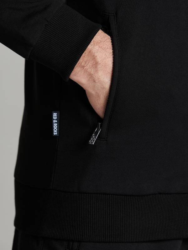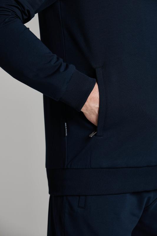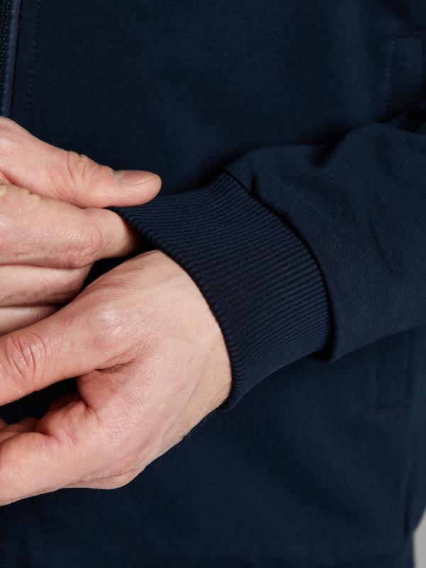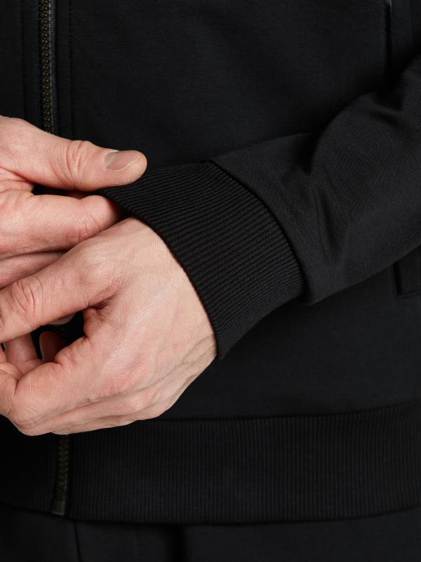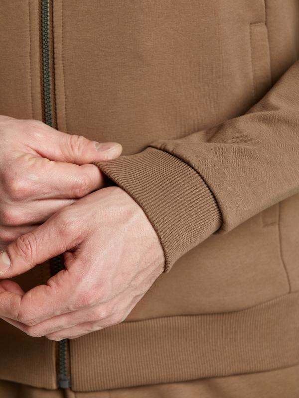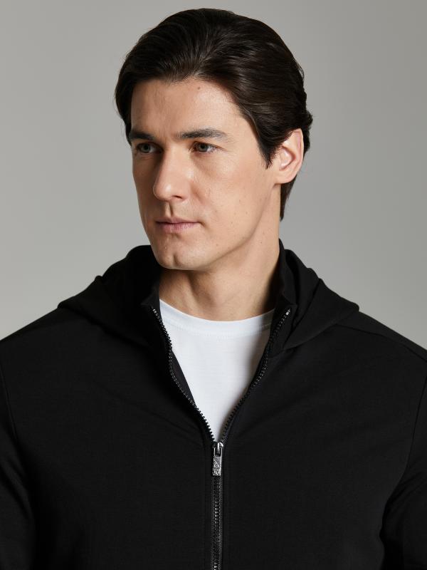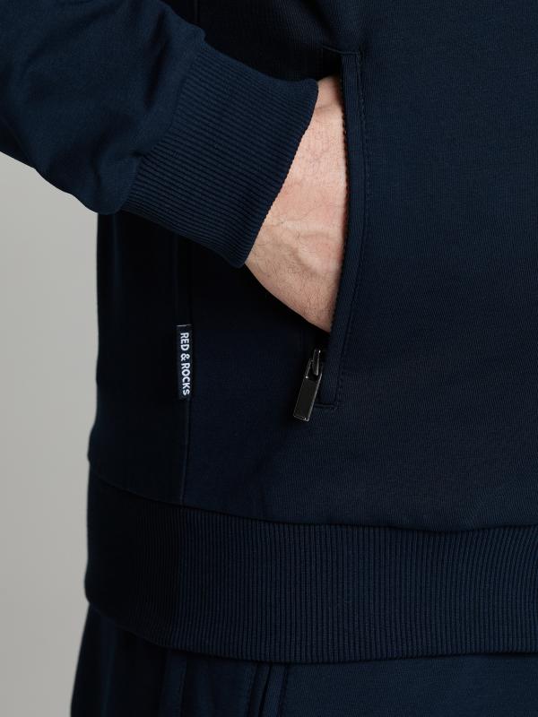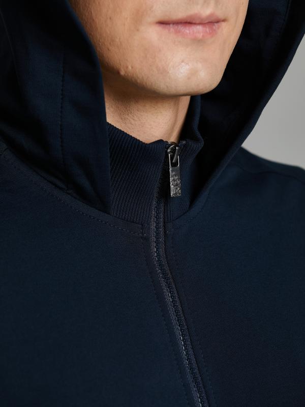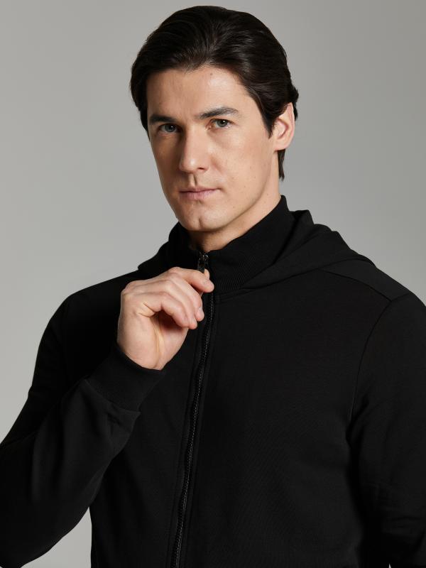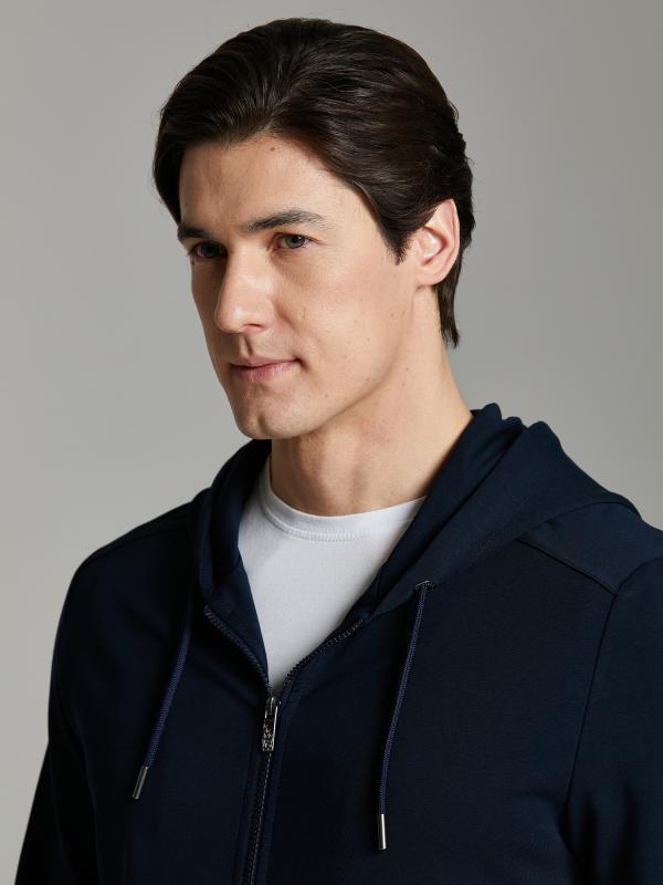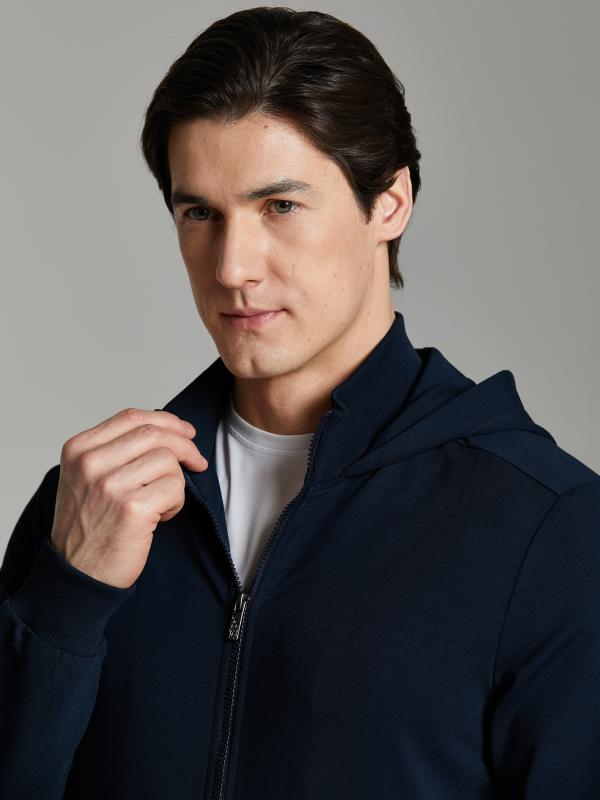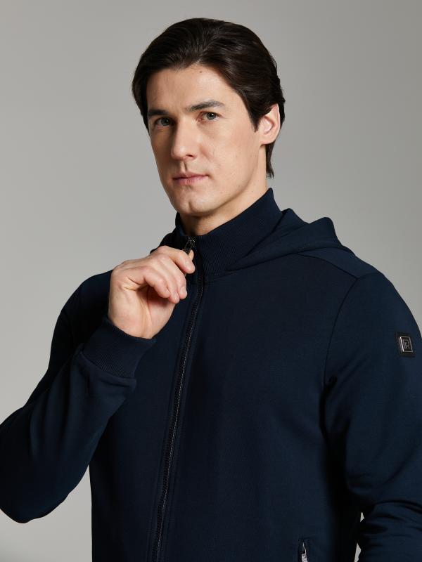 Мужской спортивный костюм из хлопкового трикотажного полотна с эластаном. Костюм базового прямого силуэта состоит из куртки и брюк. Куртка на поясе с капюшоном и воротником, застегивается на молнию. Удобные прорезные боковые карманы с молниями. Рукава втачные, низ рукава собран на трикотажную манжету. Высокая эластичная стойка совмещена с капюшоном, который служит для дополнительной защиты от холодного ветра. Карманы брюк прорезные, застегиваются на молнии. На задней половинке брюк справа дополнительный прорезной карман, так же снабженный застежкой молнией. Брюки прямого силуэта, заужены книзу манжетами. Пояс брюк по линии талии с эластичной резинкой, дополнительно регулируется шнуром. Слева на плечевой части рукава – шеврон с фирменным логотипом.