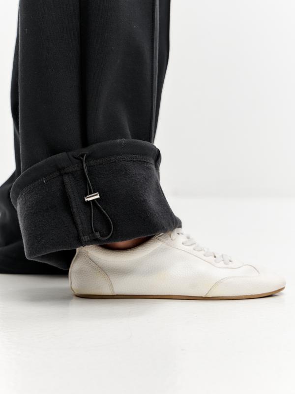 Женские артикул 22L-RR-1872 черного цвета брюки палаццо изготовлены из хлопкового трикотажного полотна с изнаночным начесом. Широкие брючины можно трансформировать, собрав низ на эластичный шнур с помощью фиксатора. Удобные наклонные карманы выполнены в боковых подрезах. Пояс брюк широкий, по линии талии собран на эластичную резинку, длина пояса дополнительно регулируется шнуром.