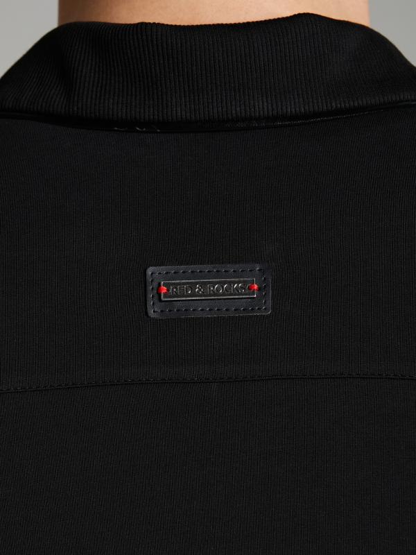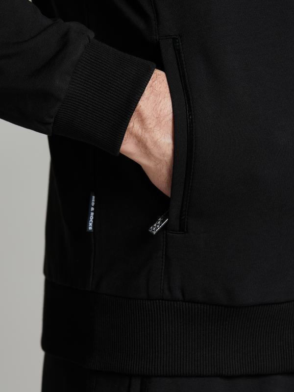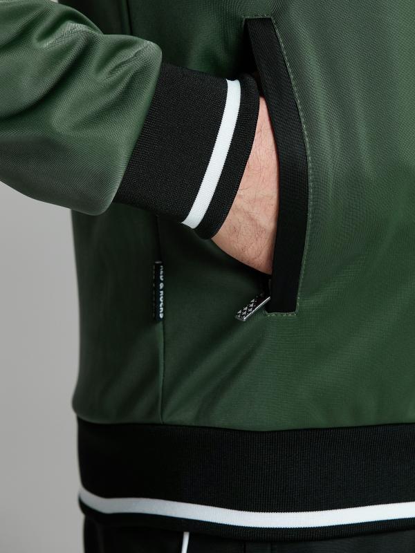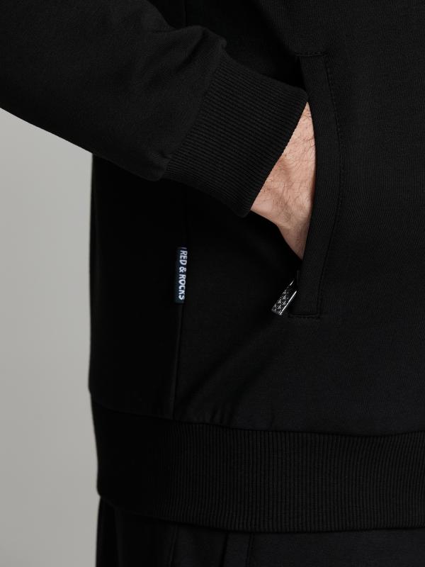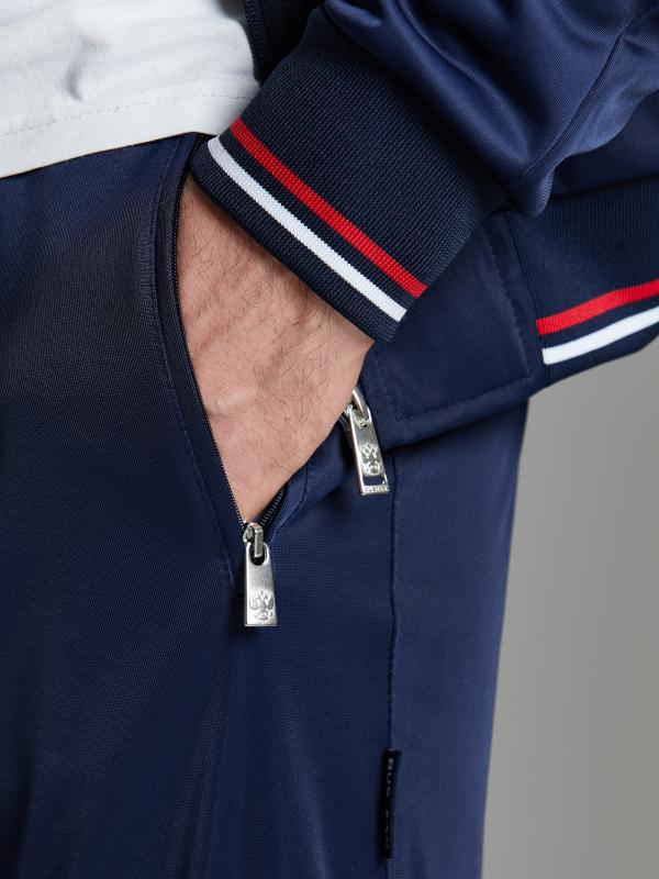 на молнии. По рукавам куртки и боковым швам брюк настрочены по два параллельных лампаса красного цвета. Посадку по фигуре обеспечивает эластичная трикотажная рибана по воротнику-бомбер, поясу и рукавам куртки. На левой полочке выполнена вышивка "