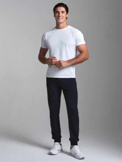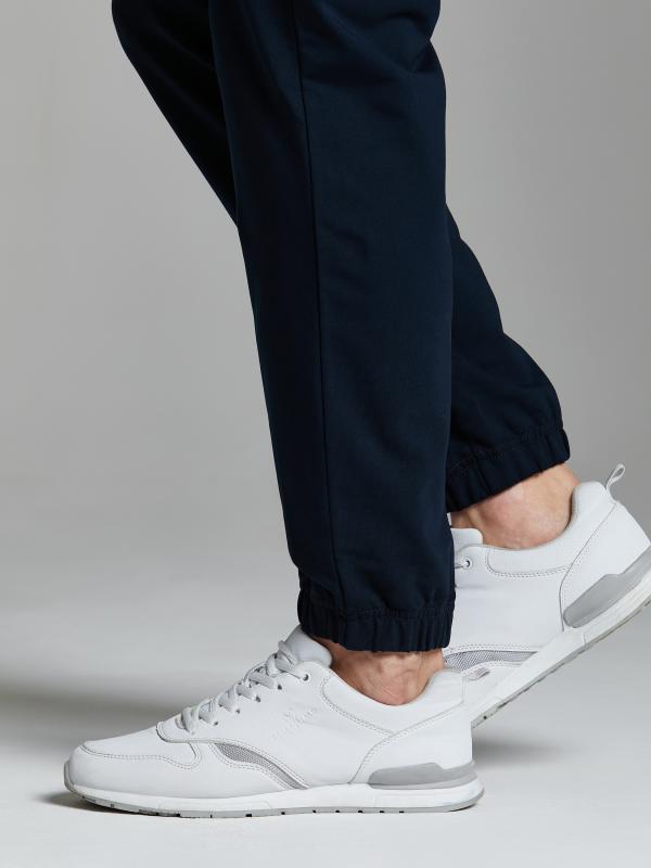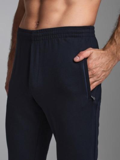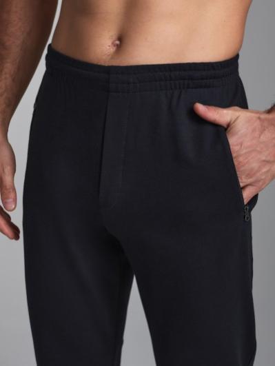 Брюки мужские из хлопкового трикотажного полотна зауженные книзу трикотажными манжетами. На передних половинках карманы на молнии. Пояс по талии регулируется шнуром.