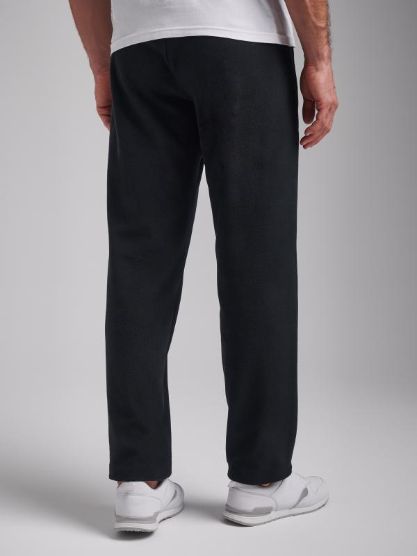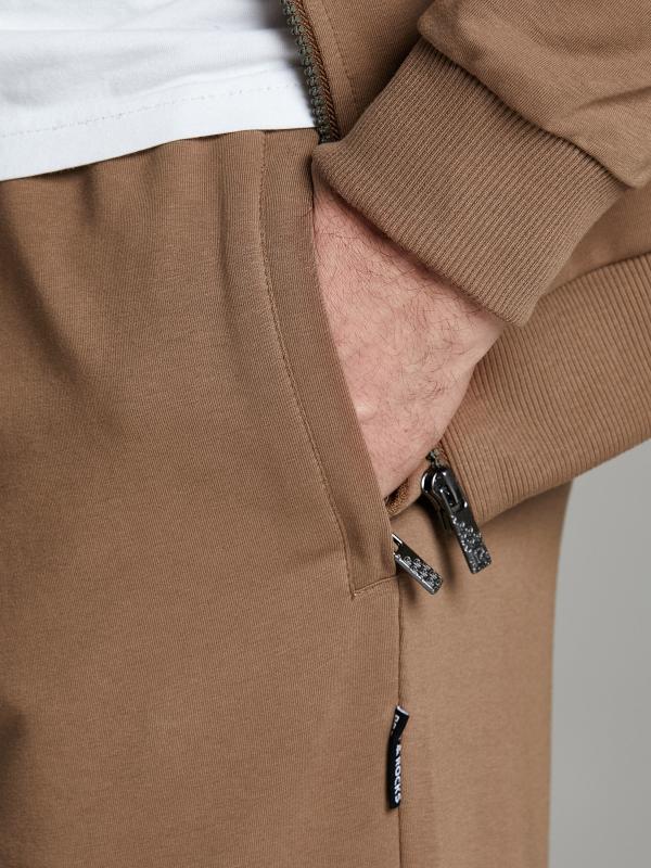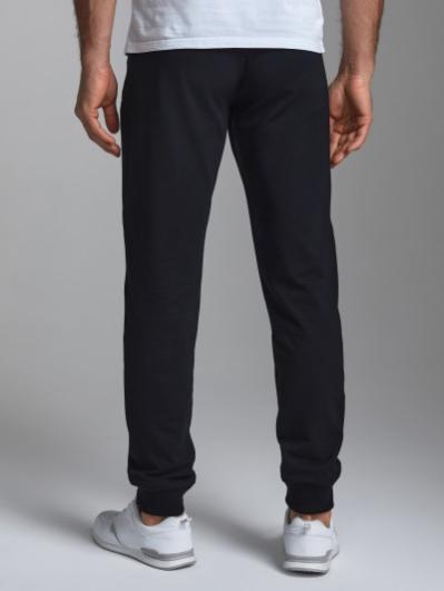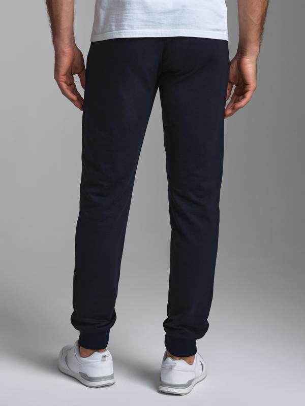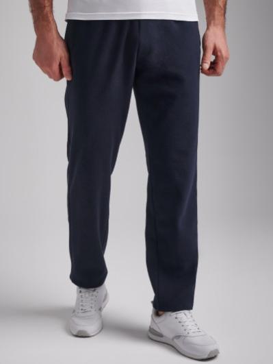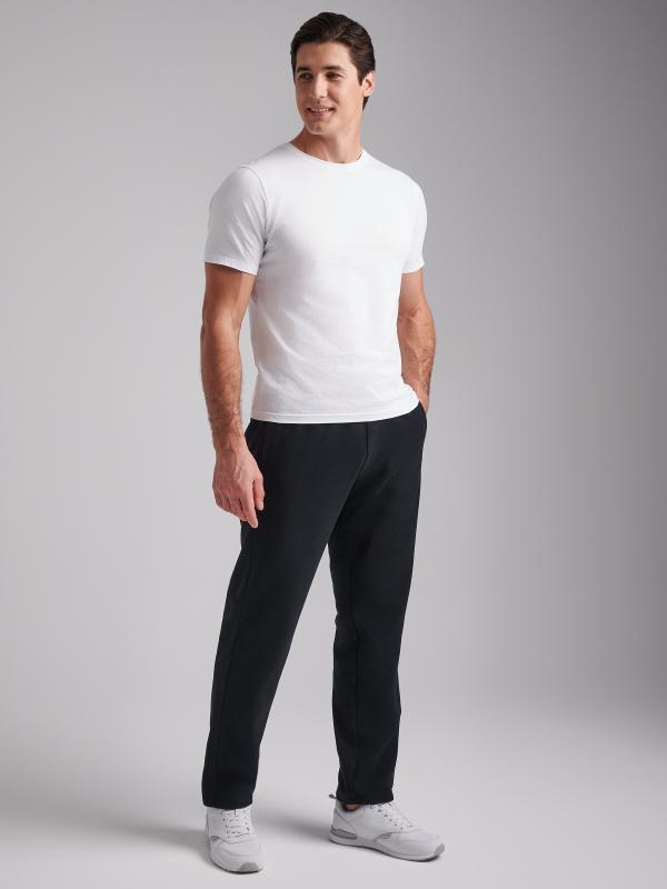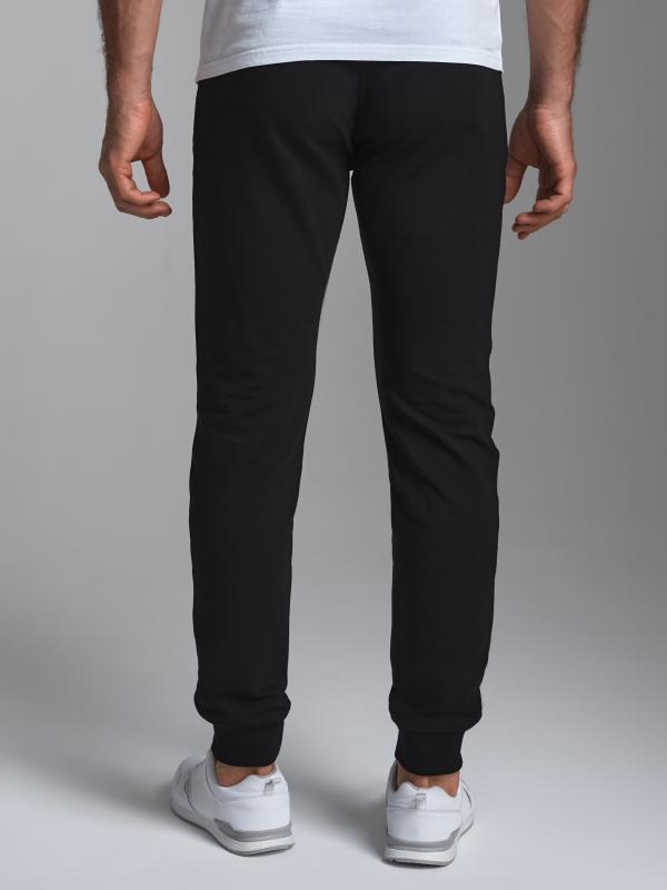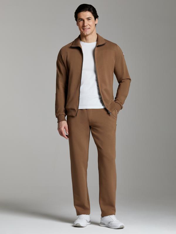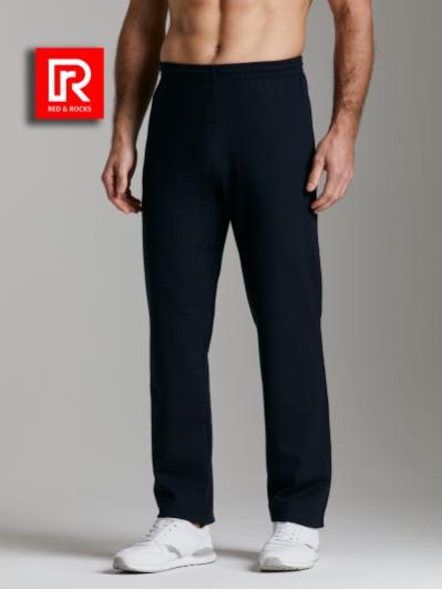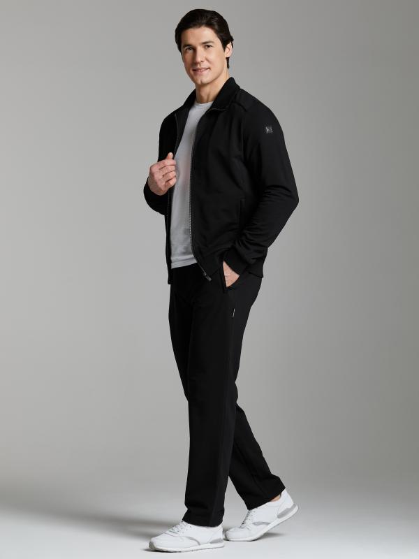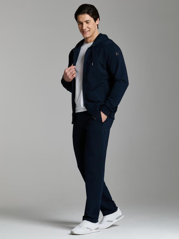 Брюки мужские прямого силуэта из плотного и мягкого хлопкового трикотажного полотна с изнаночным начесом. Карманы с планками, застегиваются на молнии. Под левым карманом настрочен шеврон с фирменным логотипом. Пояс с широкой резинкой, по талии дополнительно регулируется шнурком.