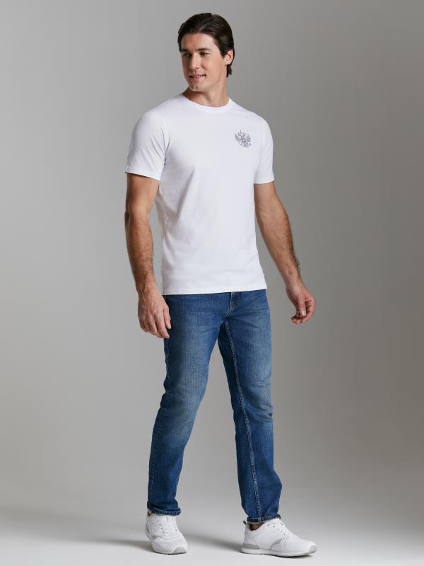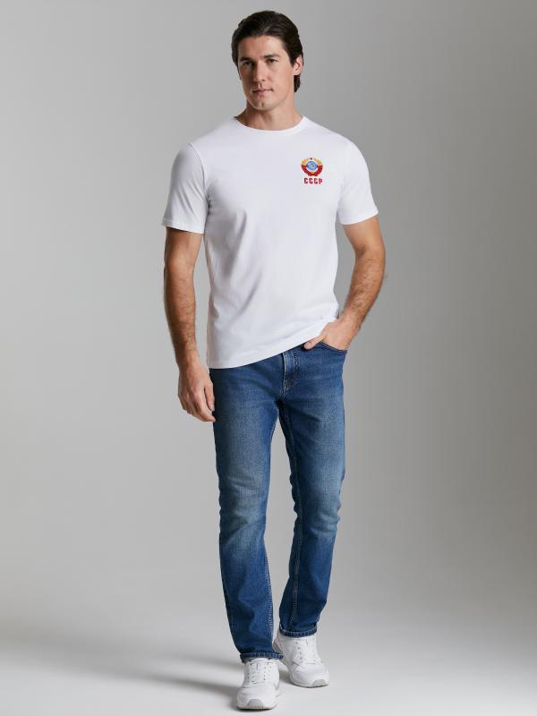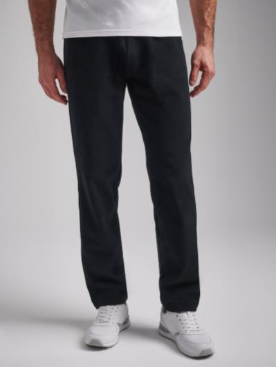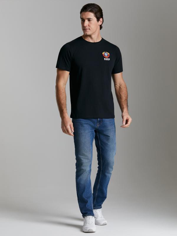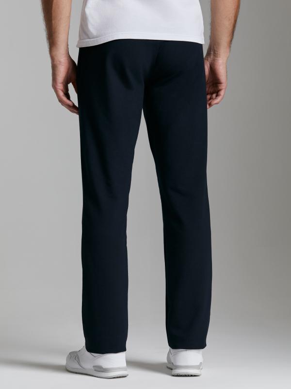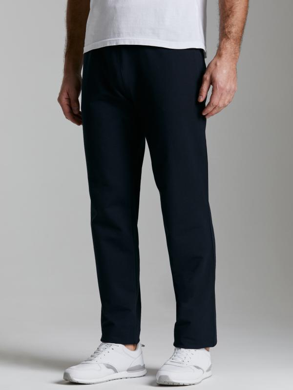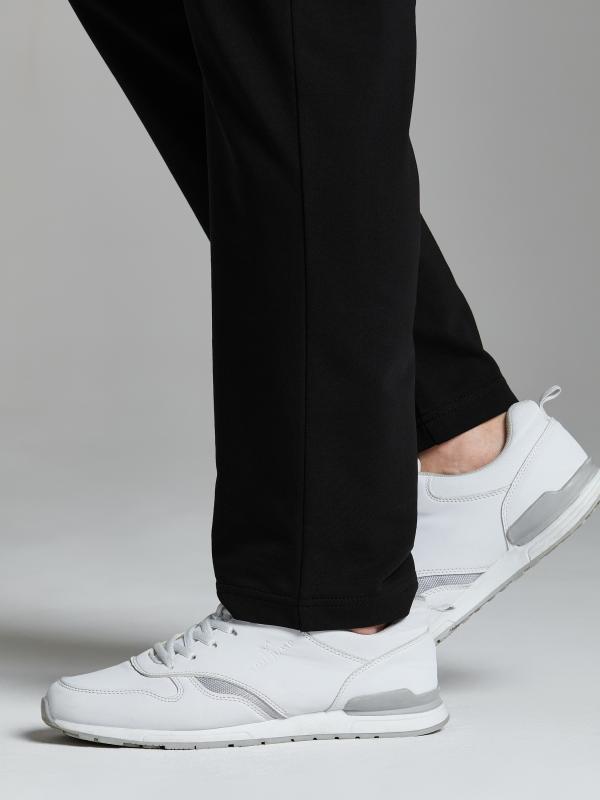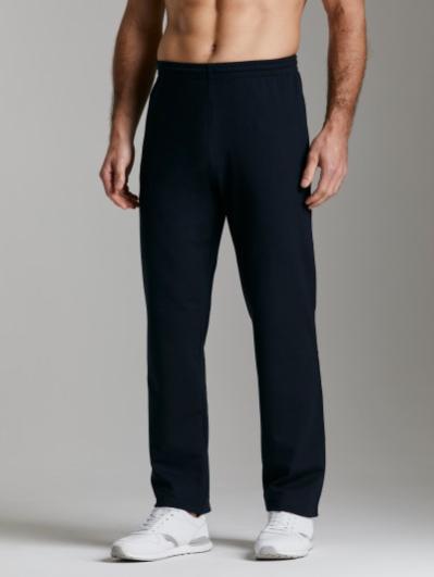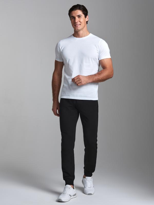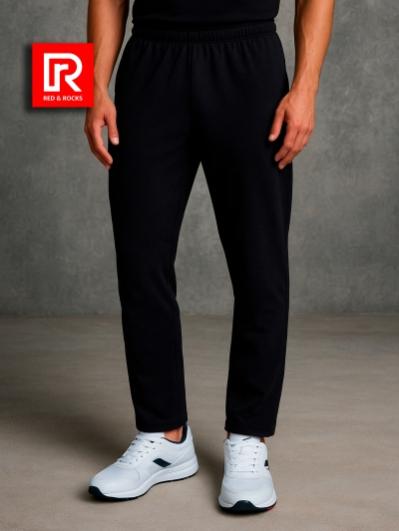 Брюки мужские прямого силуэта из плотного и мягкого хлопкового трикотажного полотна с изнаночным начесом. Карманы с планками, застегиваются на молнии. Под левым карманом настрочен шеврон с фирменным логотипом. Пояс с широкой резинкой, по талии дополнительно регулируется шнурком.