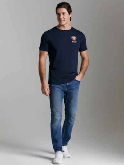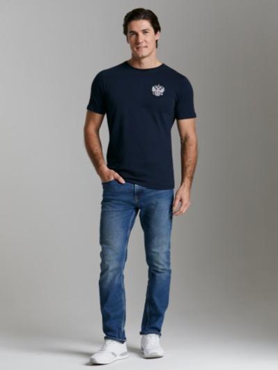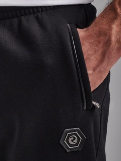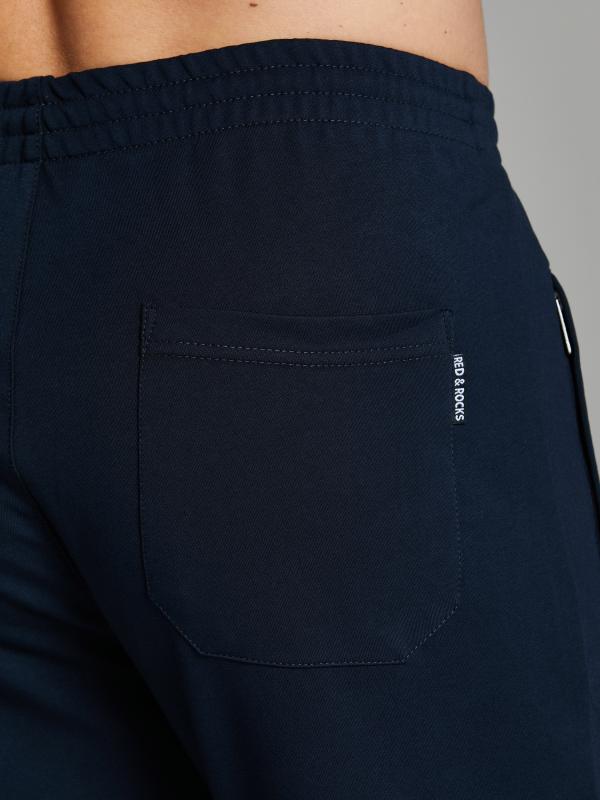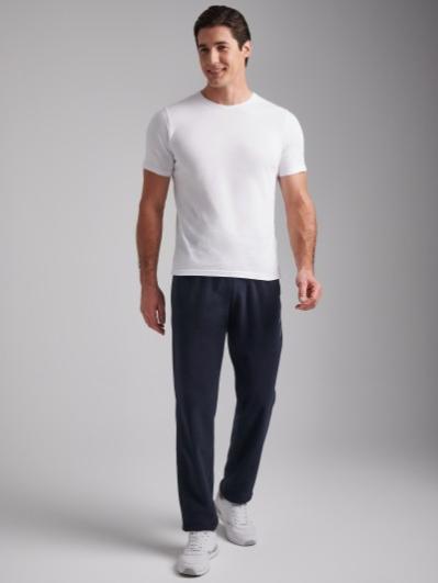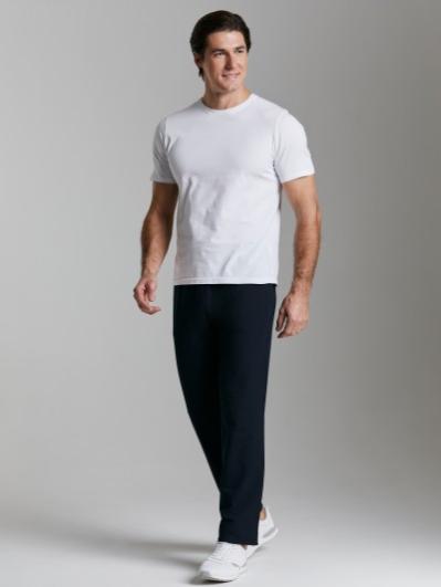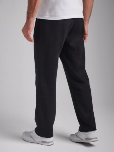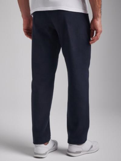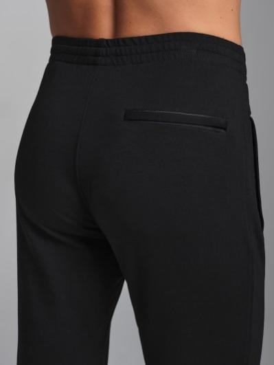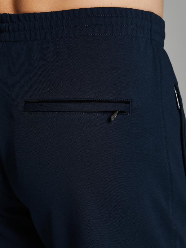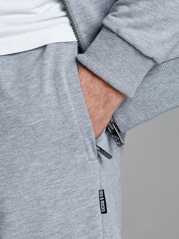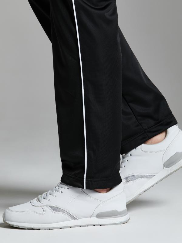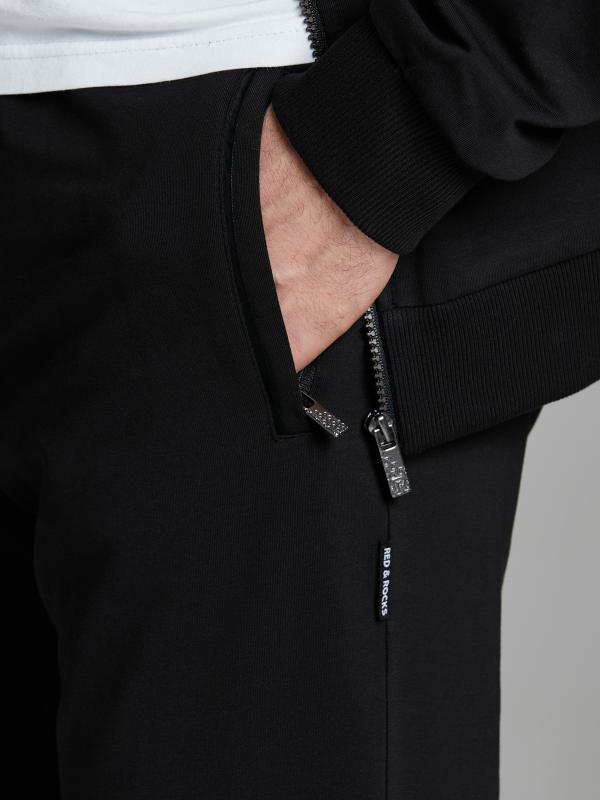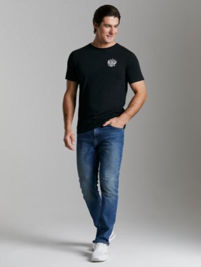 Брюки мужские прямого силуэта из плотного и мягкого хлопкового трикотажного полотна с изнаночным начесом. Карманы с планками, застегиваются на молнии. Под левым карманом настрочен шеврон с фирменным логотипом. Пояс с широкой резинкой, по талии дополнительно регулируется шнурком.