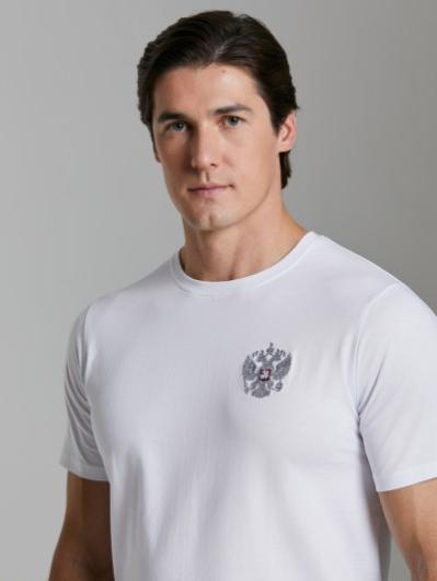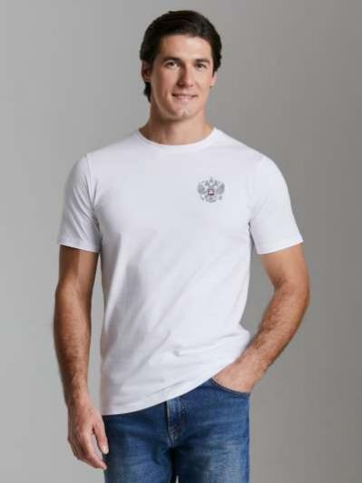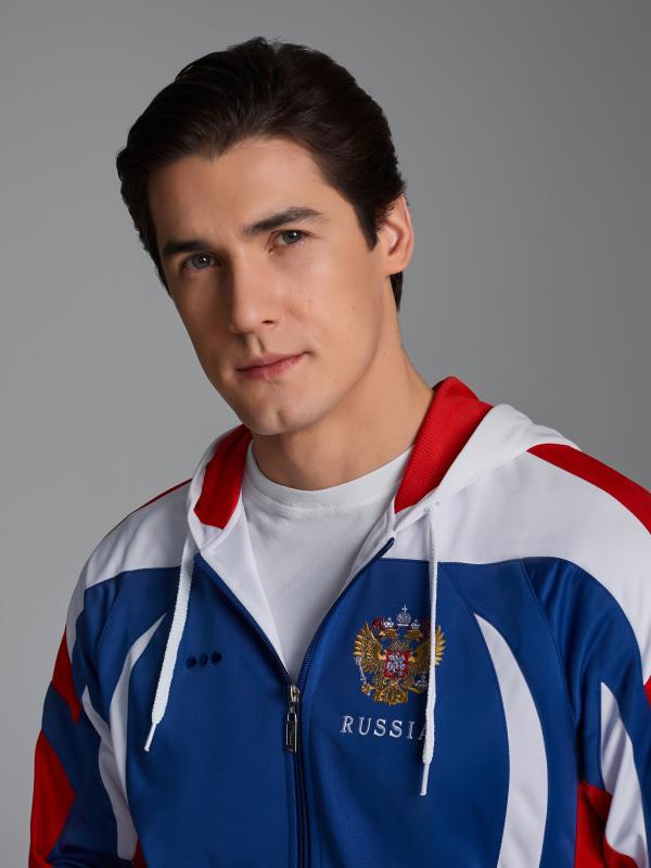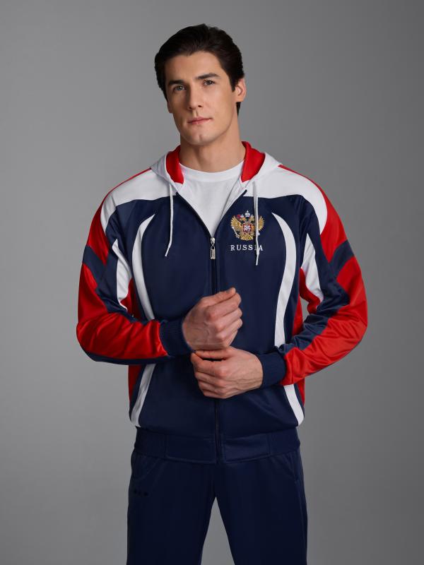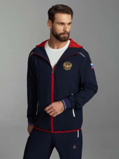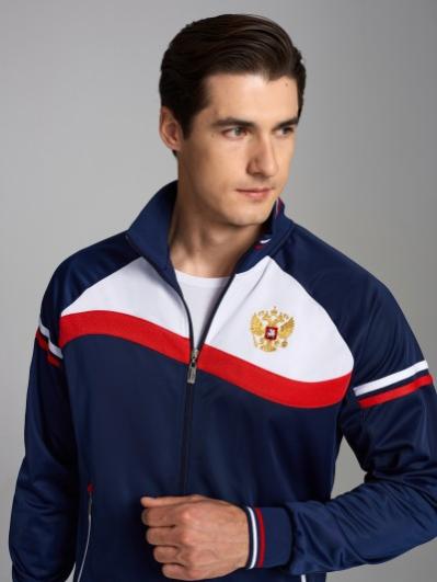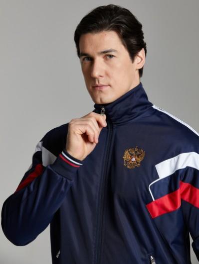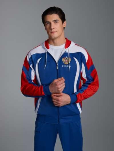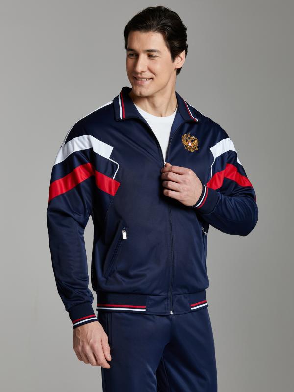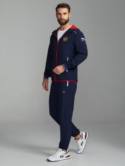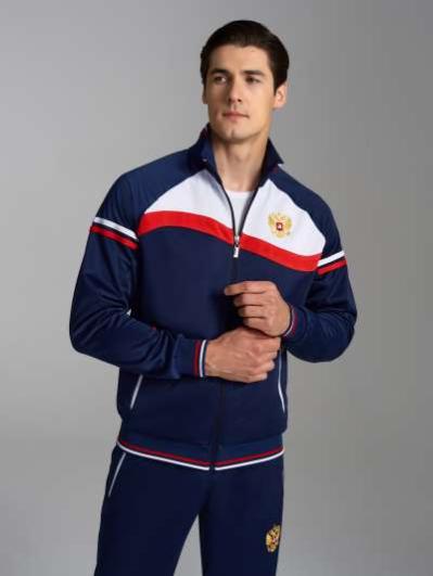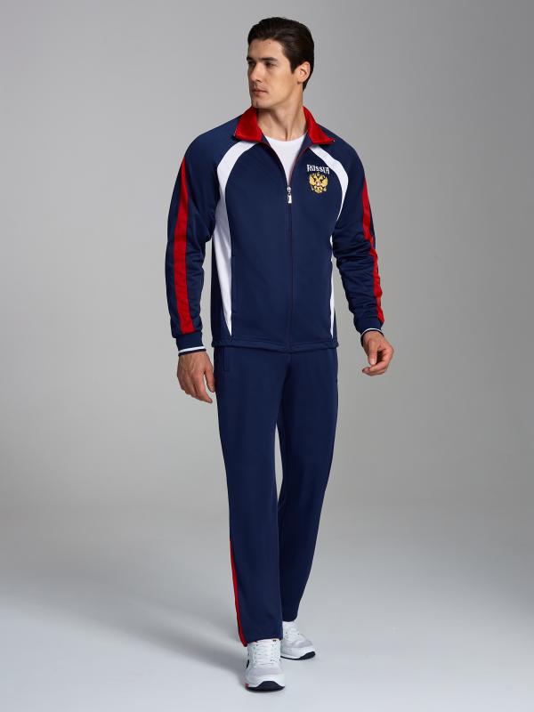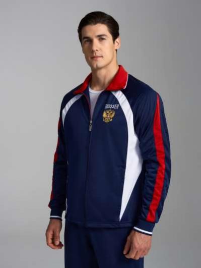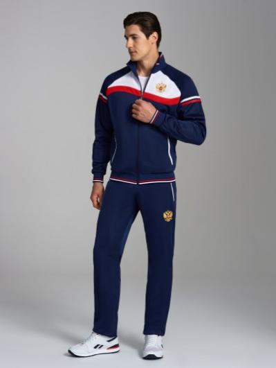 с российской символикой. Карманы куртки и брюк прорезные с молниями. Куртка свободного силуэта, застегивается на молнию. Посадку по фигуре обеспечивает эластичная трикотажная рибана пояса куртки. На плечах яркие вставки из контрастной ткани.Слева на груди вышивка - герб России..Воротник-стойка. Брюки прямого силуэта. На левой брючине - контрастные вставки в цвет российского флага. Пояс брюк на широкой резинке, по линии талии дополнительно регулируется шнурком.
