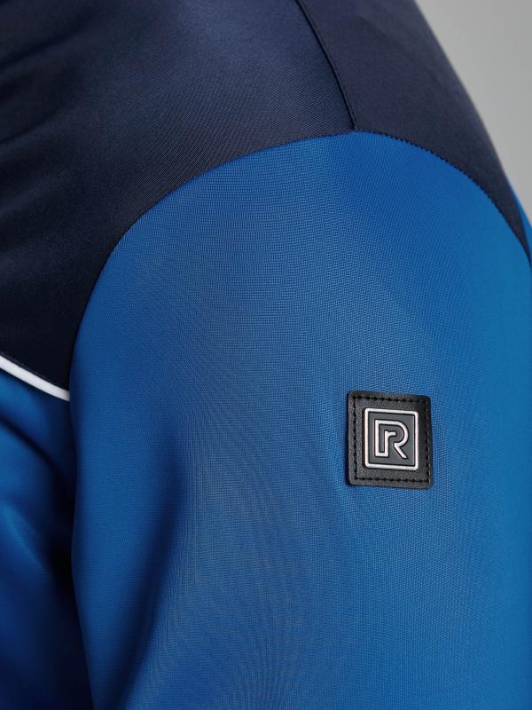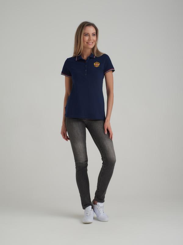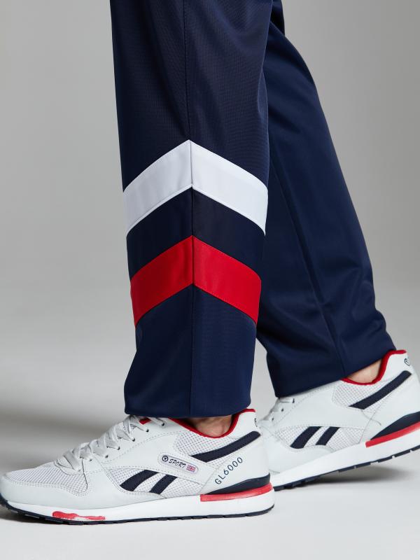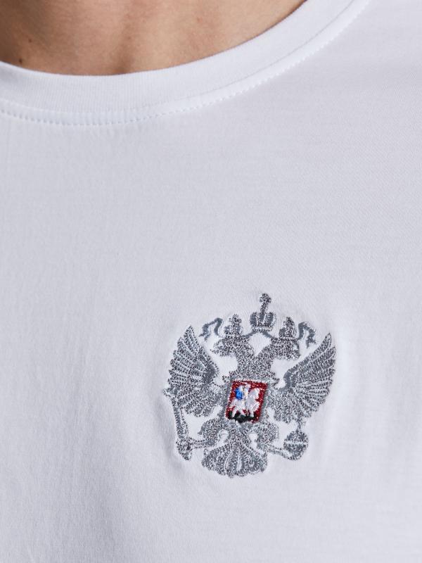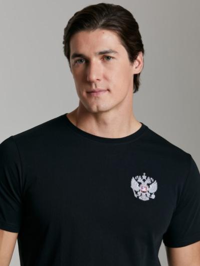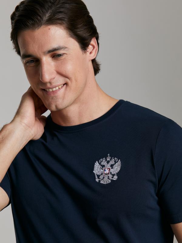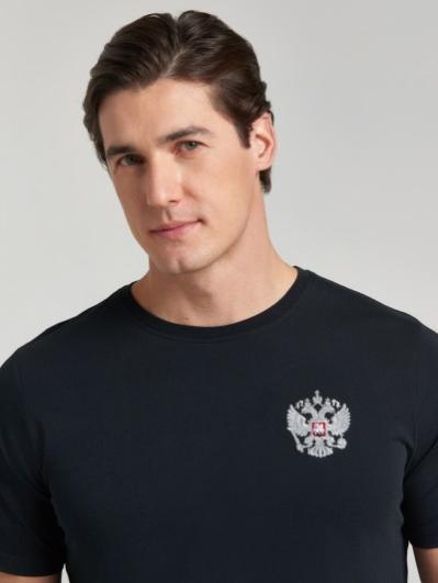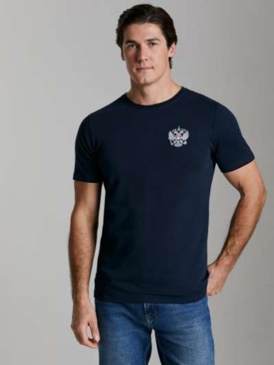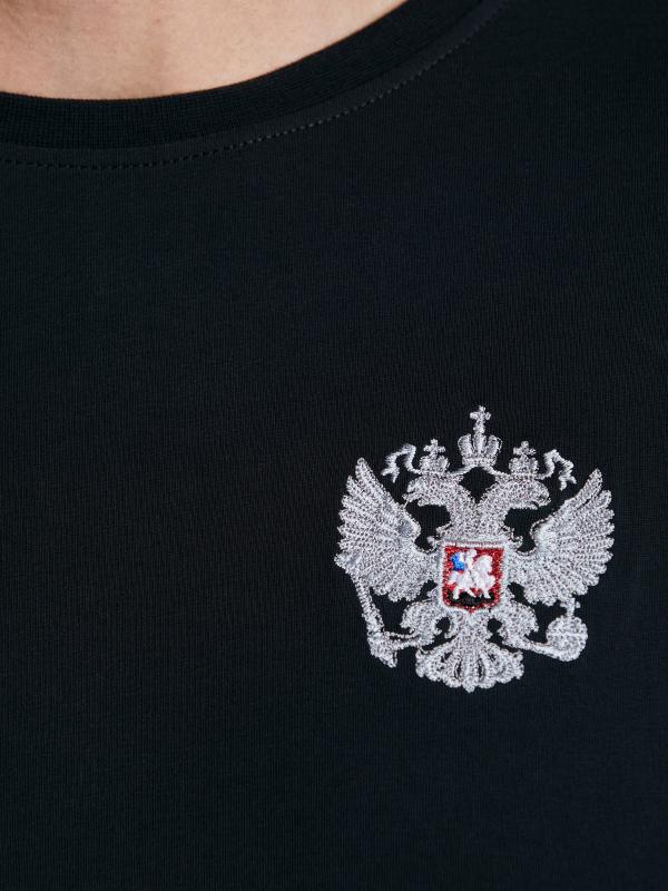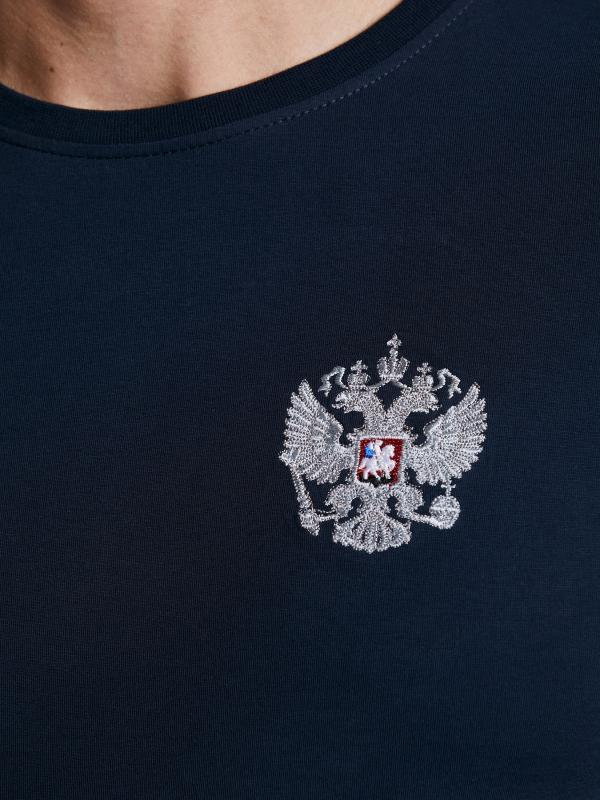 с российской символикой. Карманы куртки и брюк прорезные с молниями. Куртка свободного силуэта, застегивается на молнию. Посадку по фигуре обеспечивает эластичная трикотажная рибана пояса куртки. На плечах яркие вставки из контрастной ткани.Слева на груди вышивка - герб России..Воротник-стойка. Брюки прямого силуэта. На левой брючине - контрастные вставки в цвет российского флага. Пояс брюк на широкой резинке, по линии талии дополнительно регулируется шнурком.