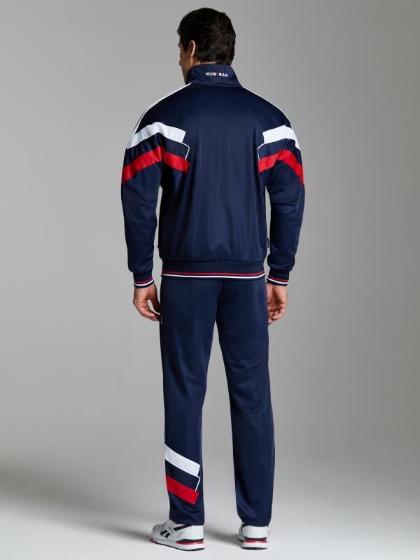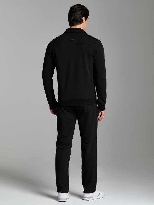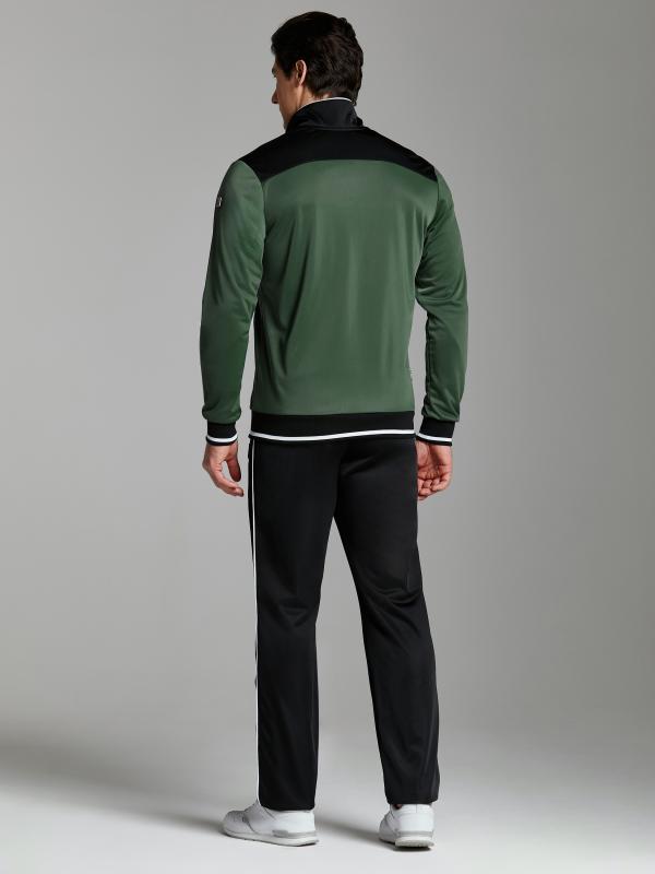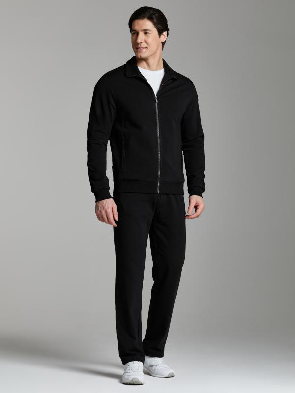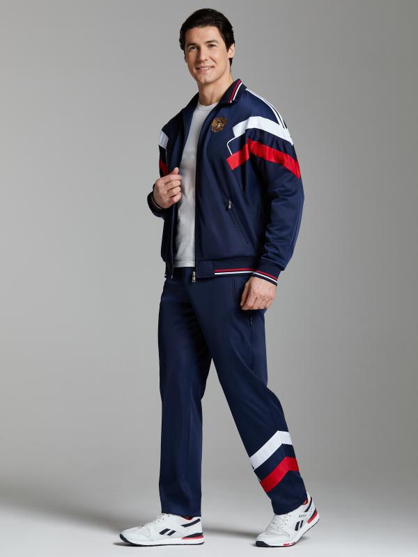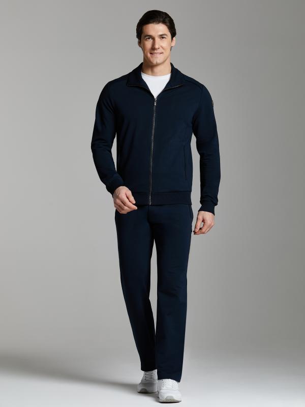 Мужской спортивный костюм из хлопкового трикотажного полотна с эластаном. Костюм базового прямого силуэта состоит из куртки и брюк. Куртка на поясе с воротником, застегивается на молнию. Удобные прорезные боковые карманы с молниями расположены в подрезах боковых вставок. Рукава втачные, низ рукава собран на трикотажную манжету. Верхний край стойки воротника, кокетки и планки закрывающие молнии карманов отделаны черным блестящим кантом. Карманы брюк прорезные, застегиваются на молнии. На задней половинке брюк справа дополнительный прорезной карман, так же снабженный застежкой молнией. Брюки прямого силуэта. Пояс брюк по линии талии с эластичной резинкой, дополнительно регулируется шнуром. Левая плечевая часть рукава и кокетка на спине украшены металлическими шевронами с фирменным логотипом.