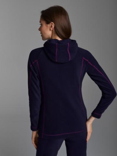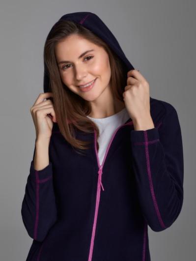 Толстовка женская из флиса с капюшоном, застегивается на молнию. Силуэт изделия – полуприлегающий. Рукава покроя реглан. Рельефы и кокетки толстовки подчеркнуты контрастной отстрочкой. Карманы куртки прорезные, с планками на молниях.