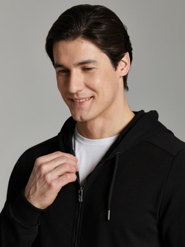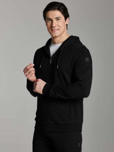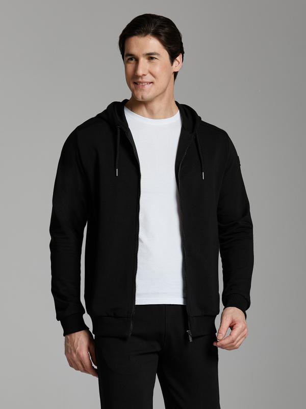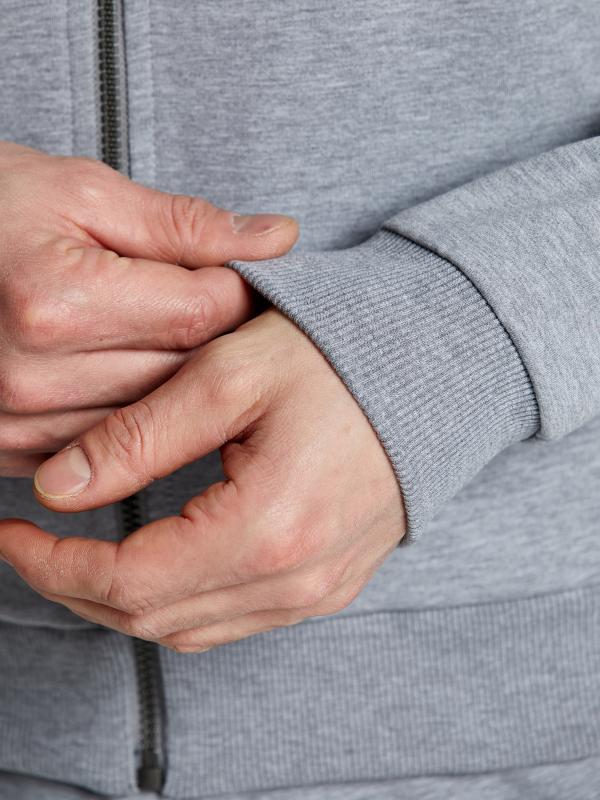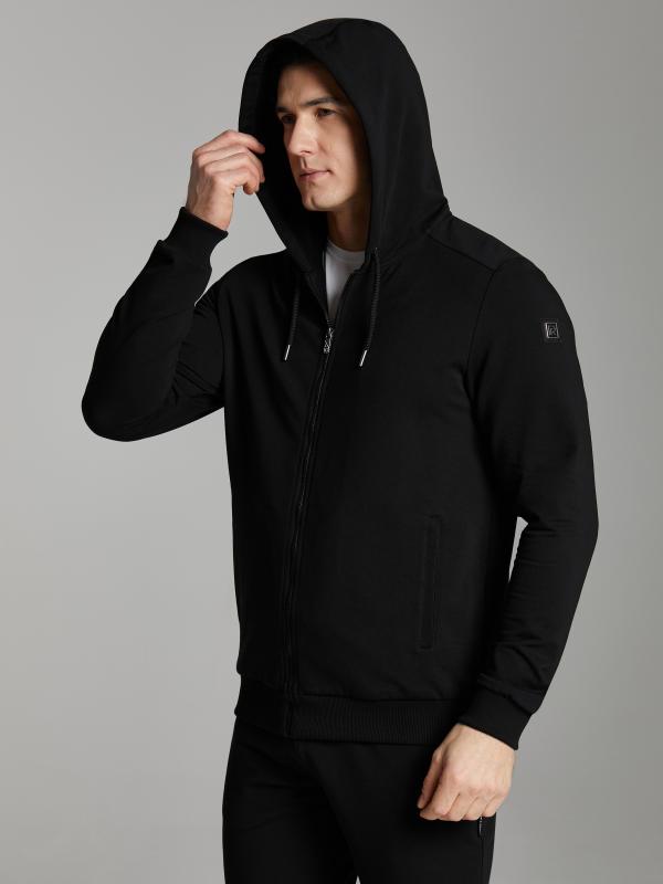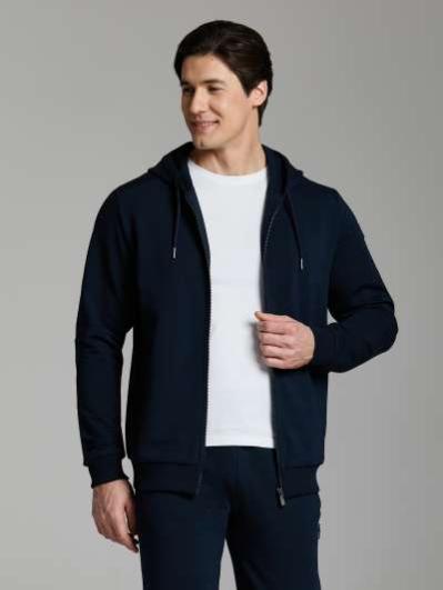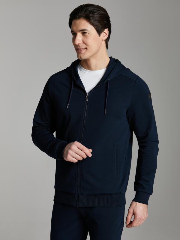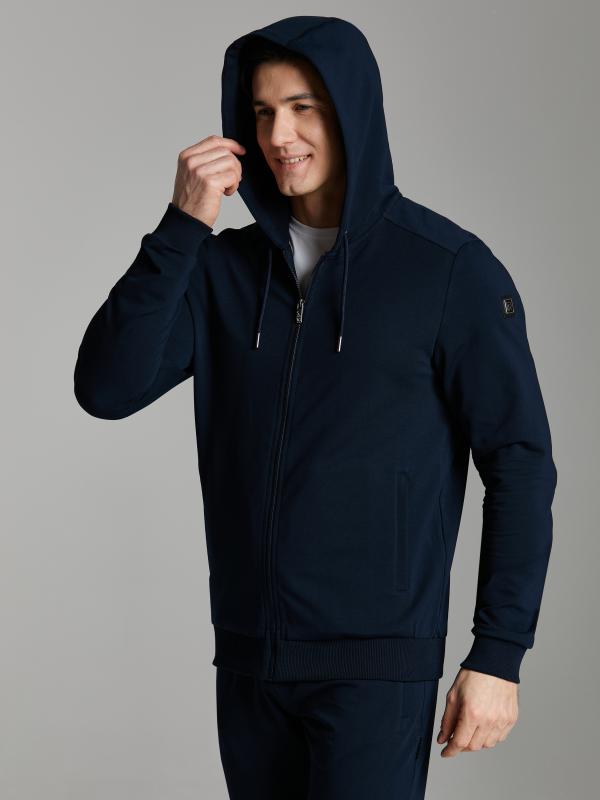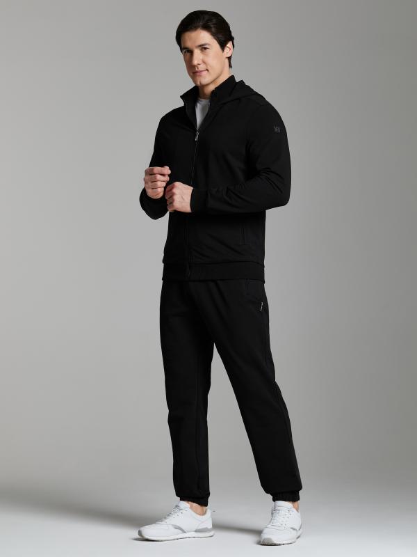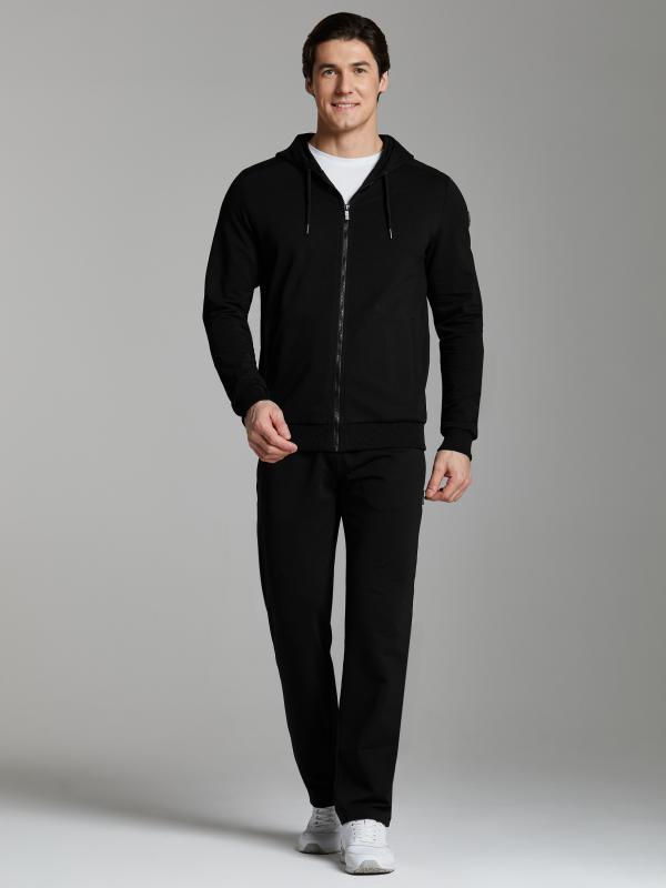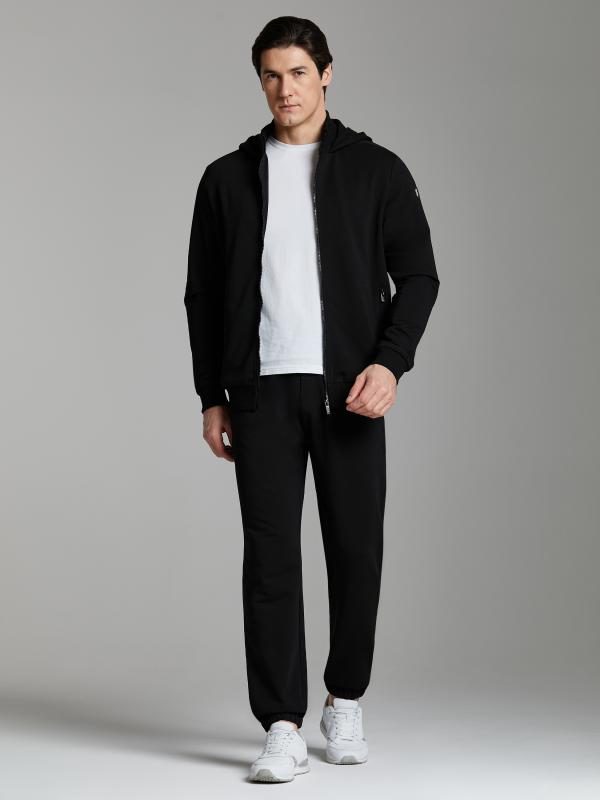 Мужской спортивный костюм из хлопкового трикотажного полотна с эластаном. Костюм базового прямого силуэта состоит из куртки и брюк. Куртка на поясе с капюшоном, застегивается на молнию. Удобные боковые прорезные карманы так же застегиваются на молнии. Рукава втачные, низ рукава собран на трикотажную манжету. Лицевой край удобного двухшовного капюшона регулируется шнуром. Карманы брюк прорезные, застегиваются на молнии. На задней половинке брюк справа дополнительный прорезной карман, так же снабженный застежкой молнией. Брюки прямого силуэта. Пояс брюк по линии талии с эластичной резинкой, дополнительно регулируется шнуром. Слева на плечевой части рукава– нашивка с фирменным логотипом.