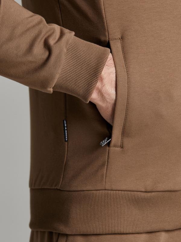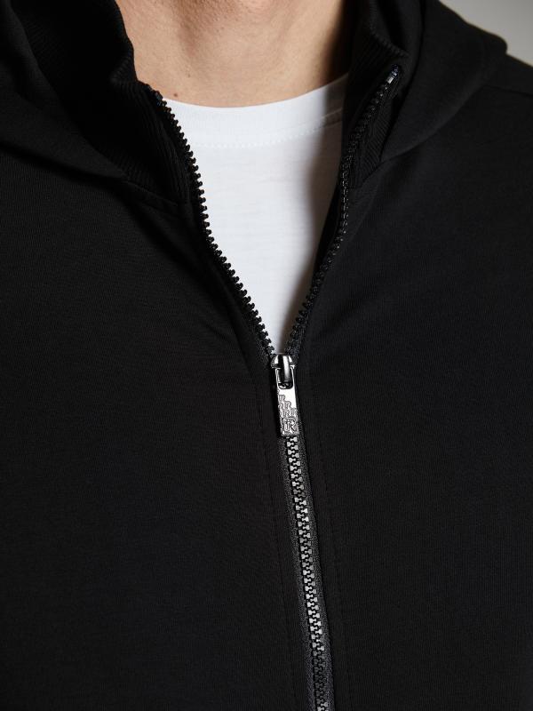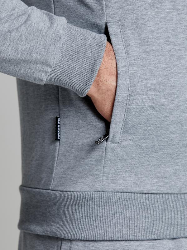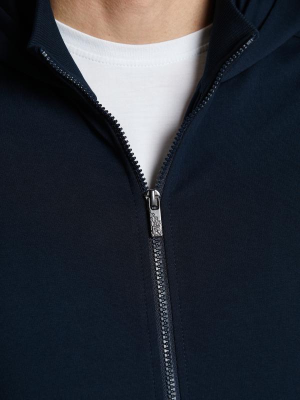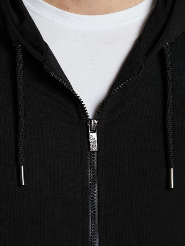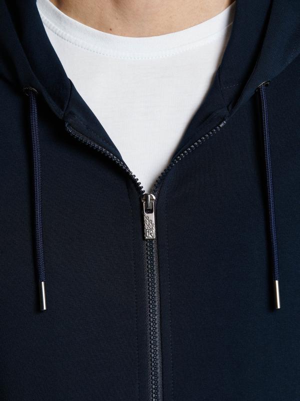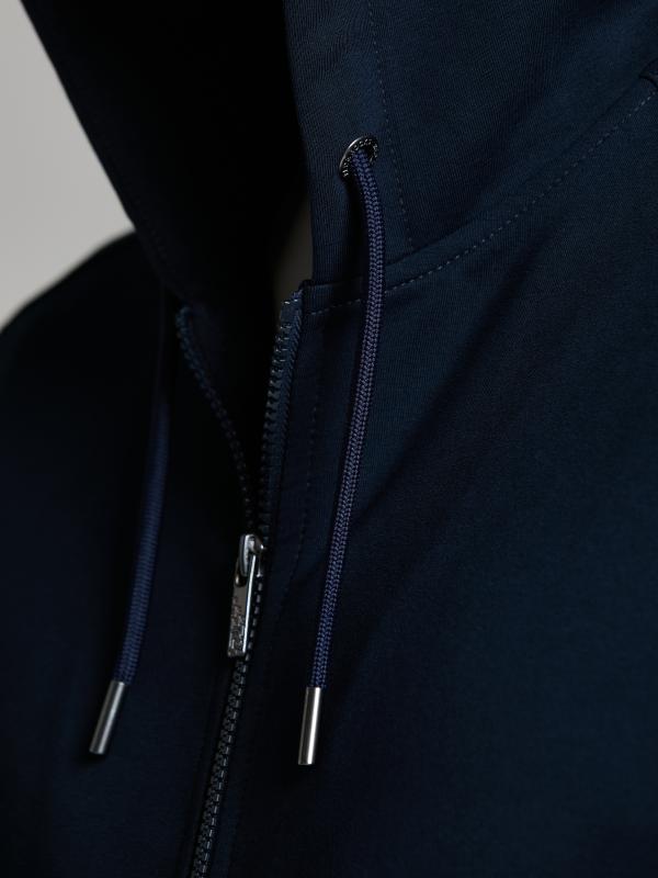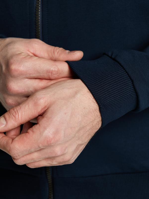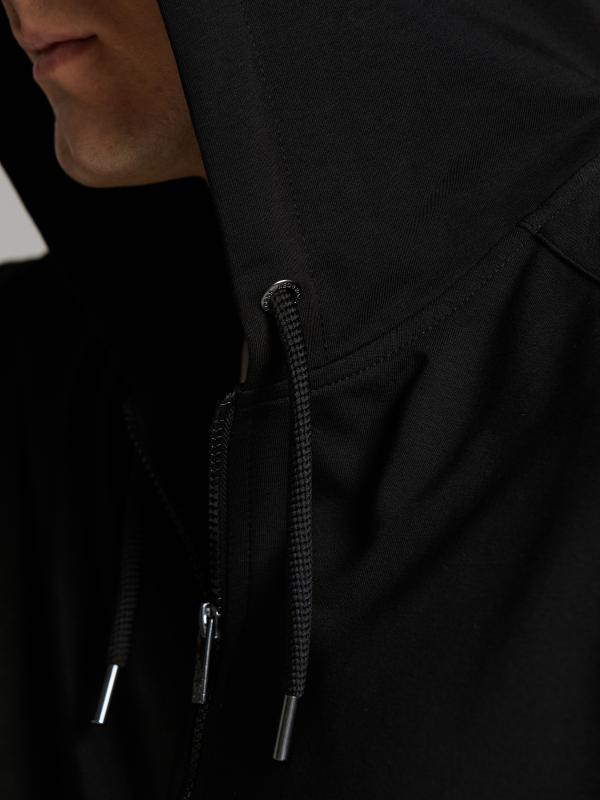 Мужской спортивный костюм из хлопкового трикотажного полотна с эластаном. Костюм базового прямого силуэта состоит из куртки и брюк. Куртка на поясе с капюшоном, застегивается на молнию. Удобные боковые прорезные карманы так же застегиваются на молнии. Рукава втачные, низ рукава собран на трикотажную манжету. Лицевой край удобного двухшовного капюшона регулируется шнуром. Карманы брюк прорезные, застегиваются на молнии. На задней половинке брюк справа дополнительный прорезной карман, так же снабженный застежкой молнией. Брюки прямого силуэта. Пояс брюк по линии талии с эластичной резинкой, дополнительно регулируется шнуром. Слева на плечевой части рукава– нашивка с фирменным логотипом.