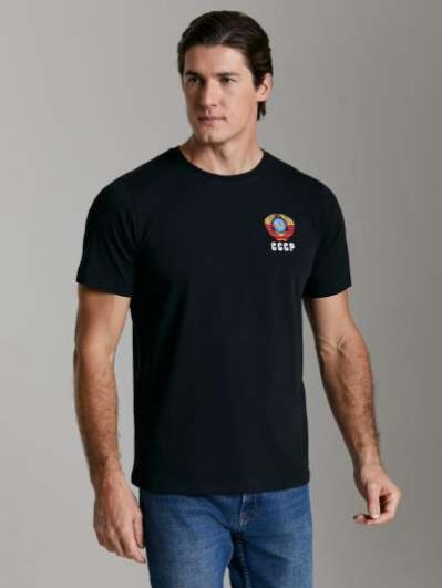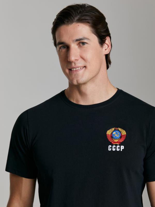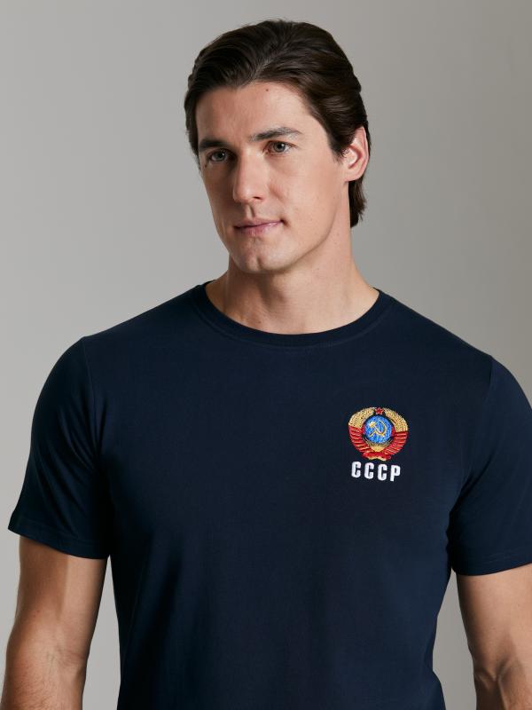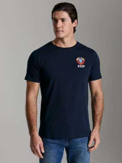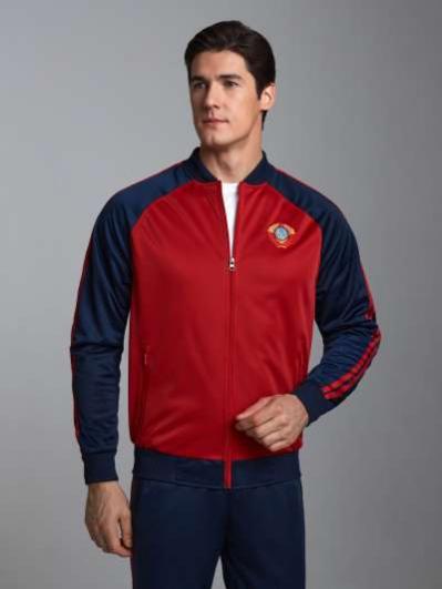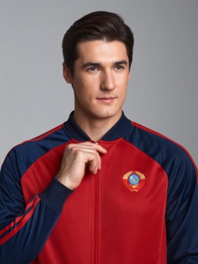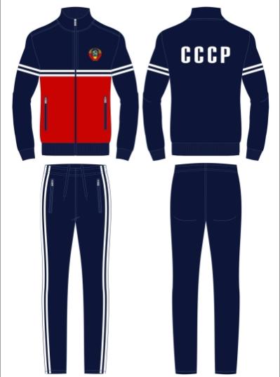 с символикой СССР. Куртка свободного силуэта, застегивается на молнию. Перед куртки горизонтально разделен на синюю и красную части, разделенные лампасом. Рукава куртки - втачные, с лампасами по плечевой части. Слева на груди вышивка - герб СССР. На спине белая вышивка-аппликация СССР..Воротник-стойка. Карманы куртки и брюк прорезные с молниями. Брюки прямого силуэта с лампасами вдоль бокового шва Пояс брюк на широкой резинке, по линии талии дополнительно регулируется шнурком.