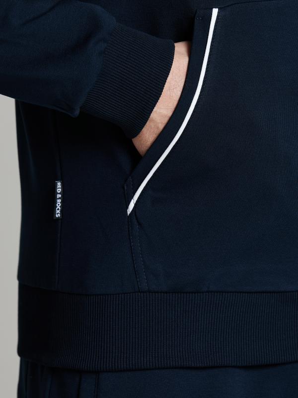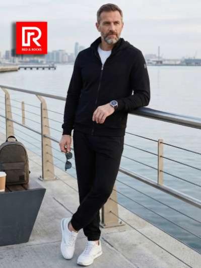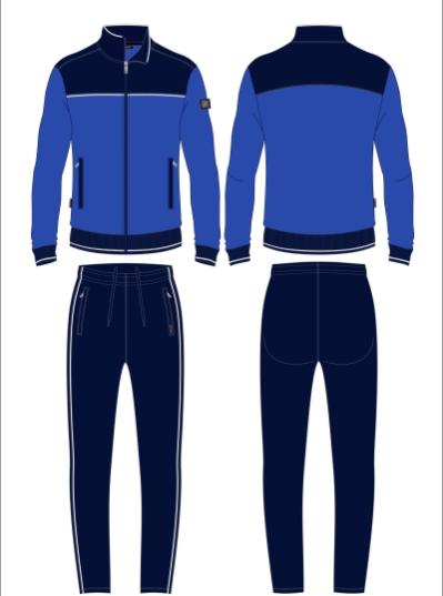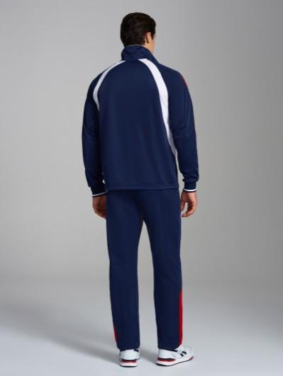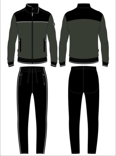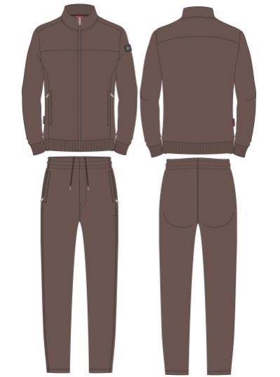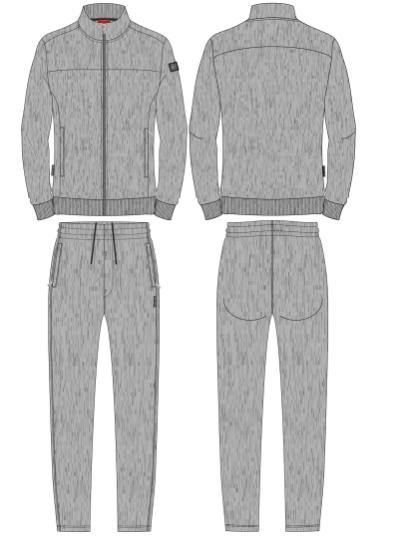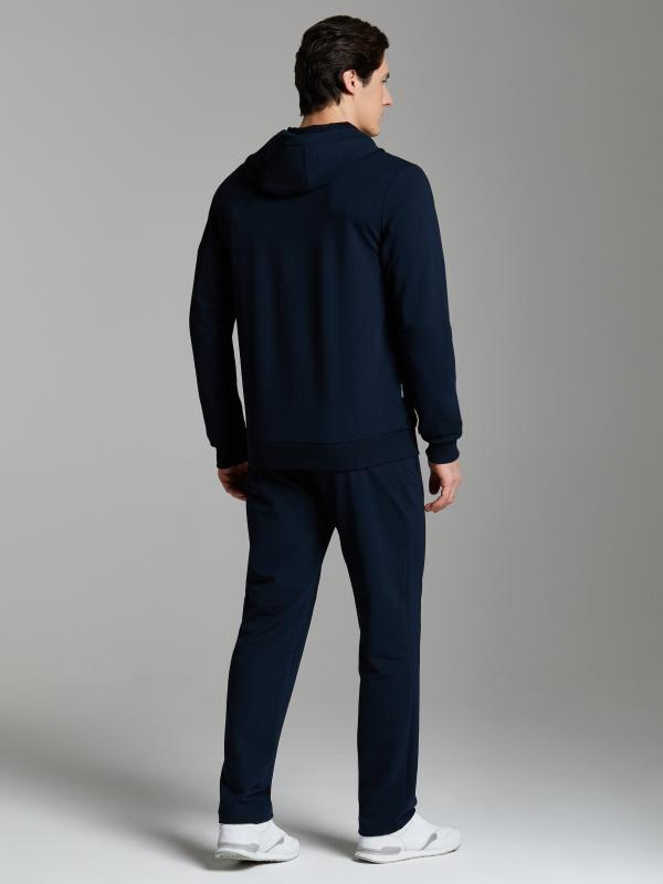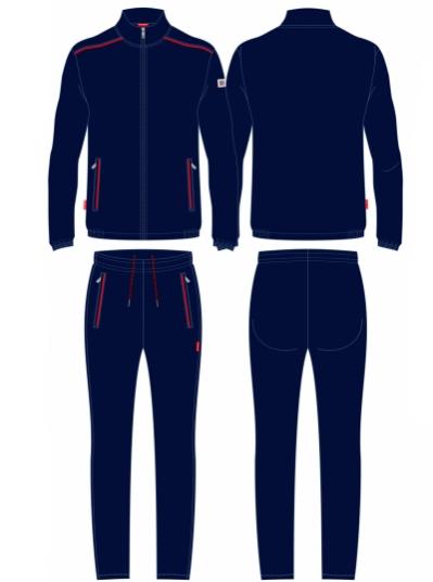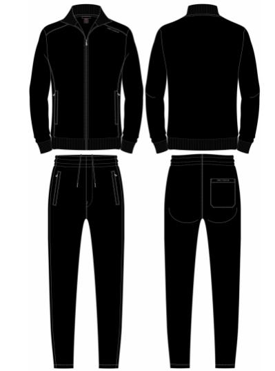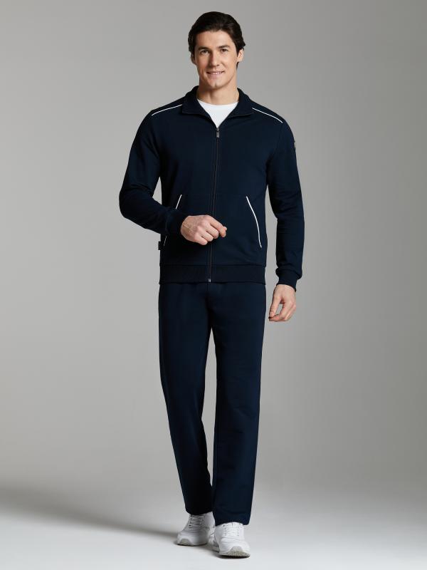 Мужской спортивный костюм из хлопкового трикотажного полотна с эластаном. Костюм базового прямого силуэта состоит из куртки и брюк. Куртка на поясе с воротником, застегивается на молнию. Карманы куртки –вместительные накладные «кенгуру». Рукава втачные, низ рукава собран на трикотажную манжету. Карманы брюк прорезные, застегиваются на молнии. На задней половинке брюк справа дополнительный накладной карман. Брюки прямого силуэта. Спортивная стилистика костюма подчеркнута белыми кантами, вставленными в обтачки карманов куртки, кокетки и боковые швы брюк. Пояс брюк по линии талии с эластичной резинкой, дополнительно регулируется шнуром. Левая плечевая часть рукава украшена шевроном с фирменным логотипом.