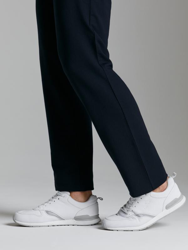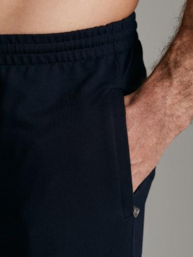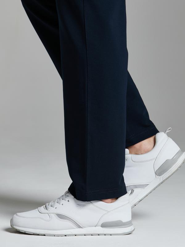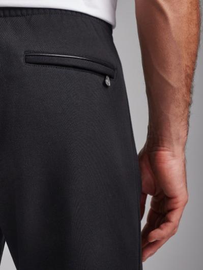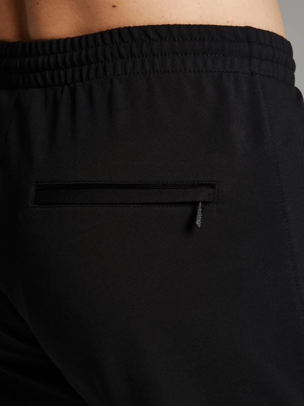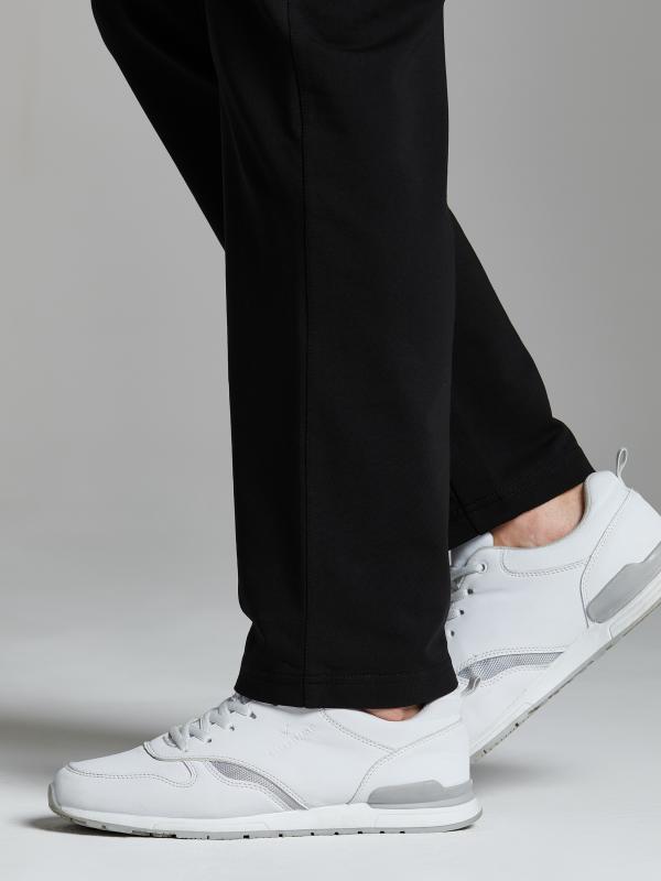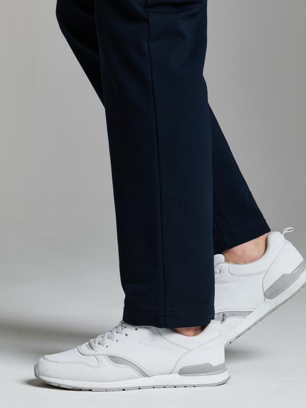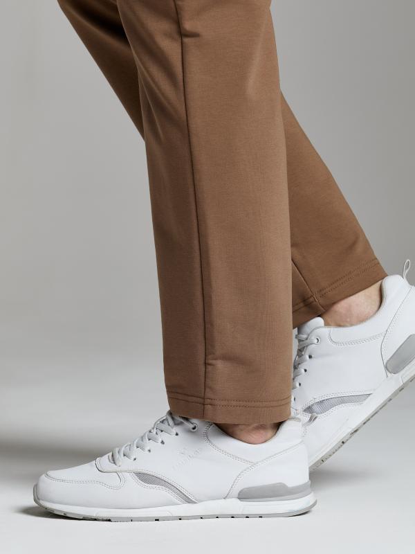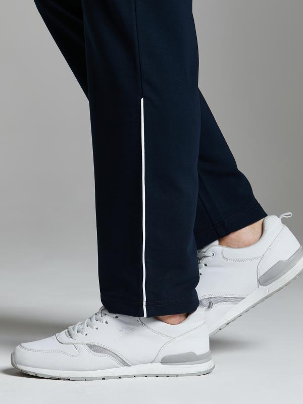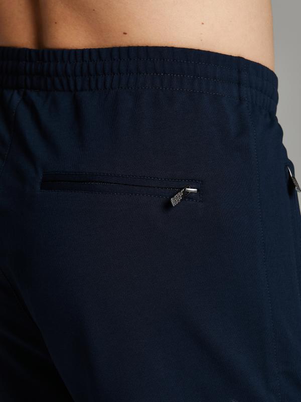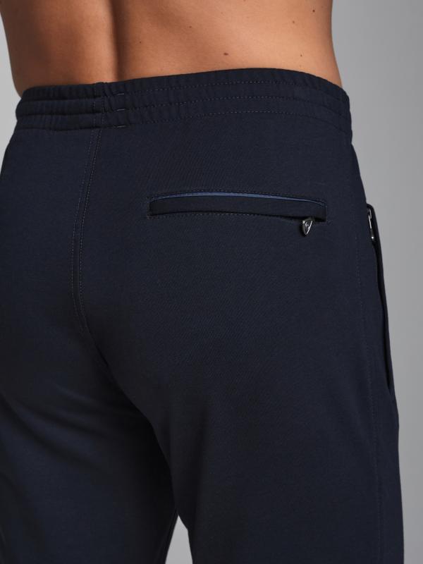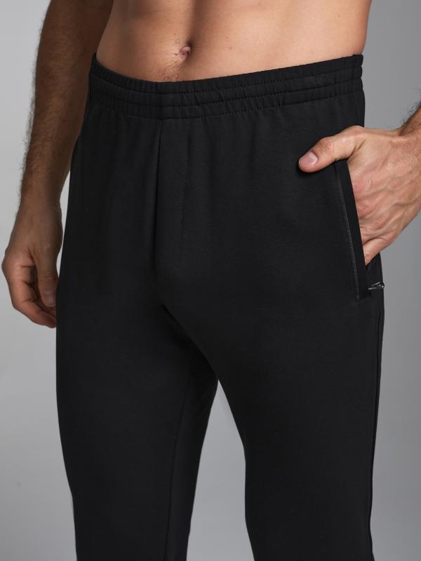 Брюки мужские из хлопкового трикотажа, брючины зауженные книзу, на манжете. Передние карманы прорезные, на молниях, с листочками. Справа есть дополнителный задний карман, так же застегивается на молнию. Ширина пояса брюк регулируется шнуром.