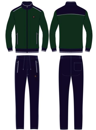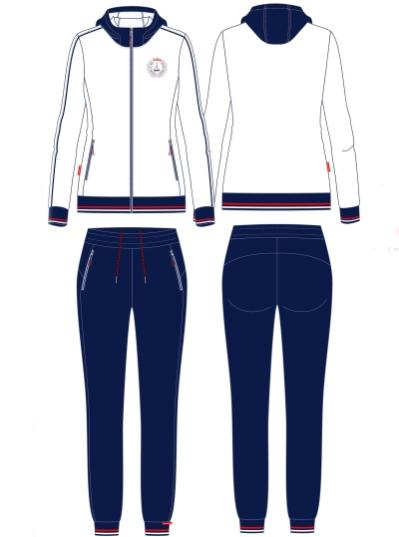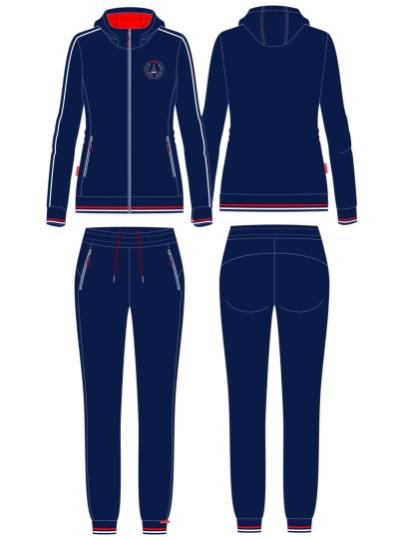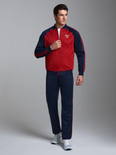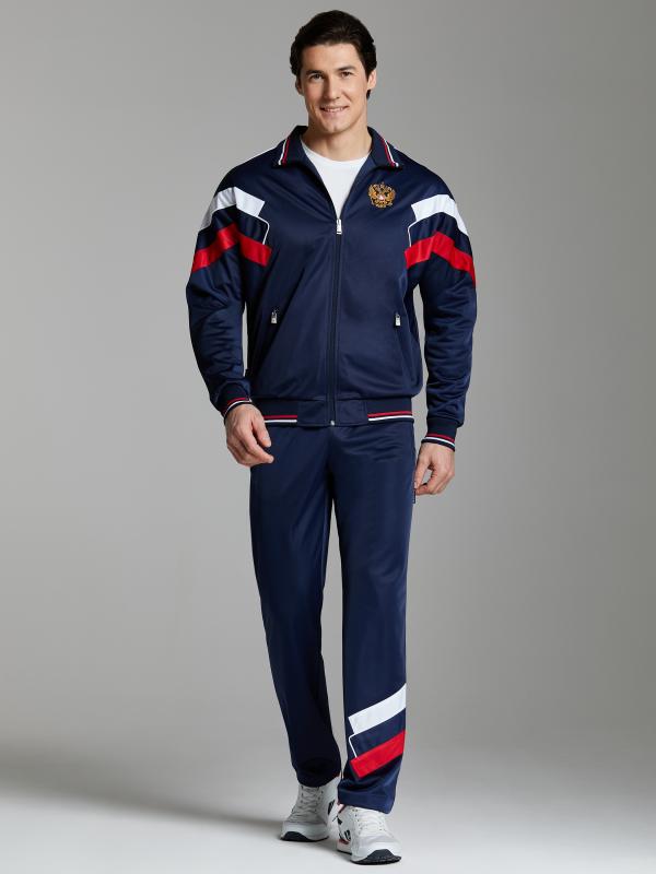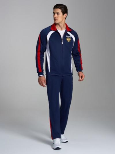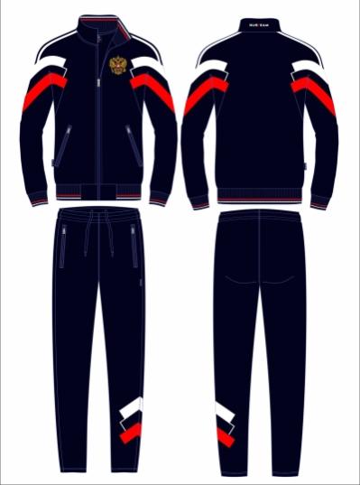Спортивный костюм выполнен из полиэстеровой ткани с изнаночным начесом в классической цветовой расцветке. Карманы куртки и брюк с открытыми молниями. Посадку по фигуре обеспечивает эластичная трикотажная рибана с двумя цветными полосками по воротнику, поясу и рукавам куртки. Брюки с фигурной кокеткой на задних половинках брюк. Пояс по линии талии регулируется шнурком. По боковому шву брюк проложен двухцветный лампас. Полочка украшена вышивкой герба. На спинке куртки контурная вышивка.
