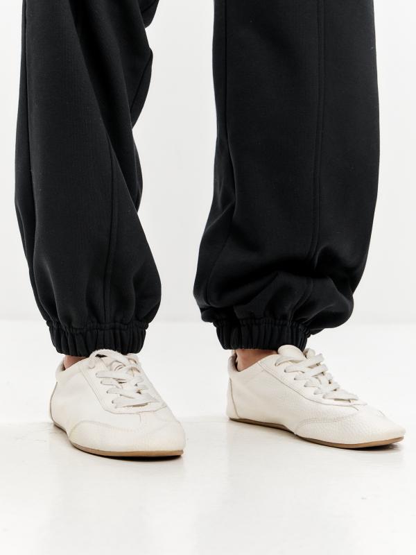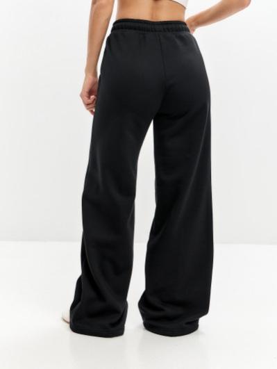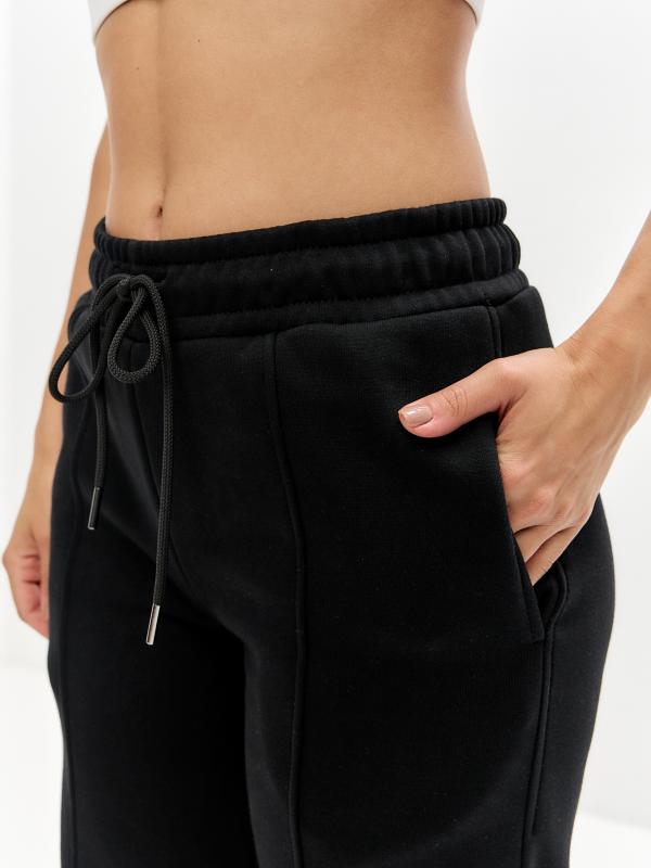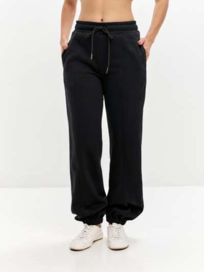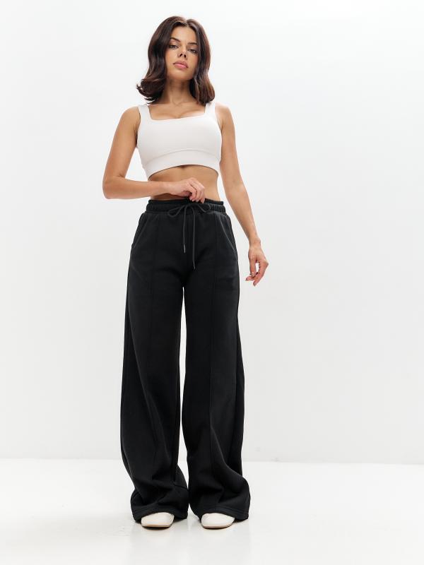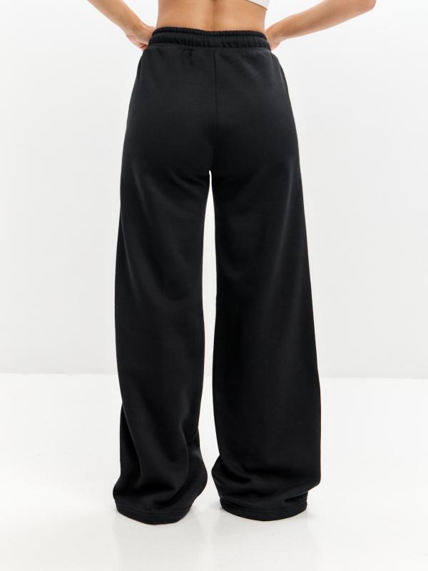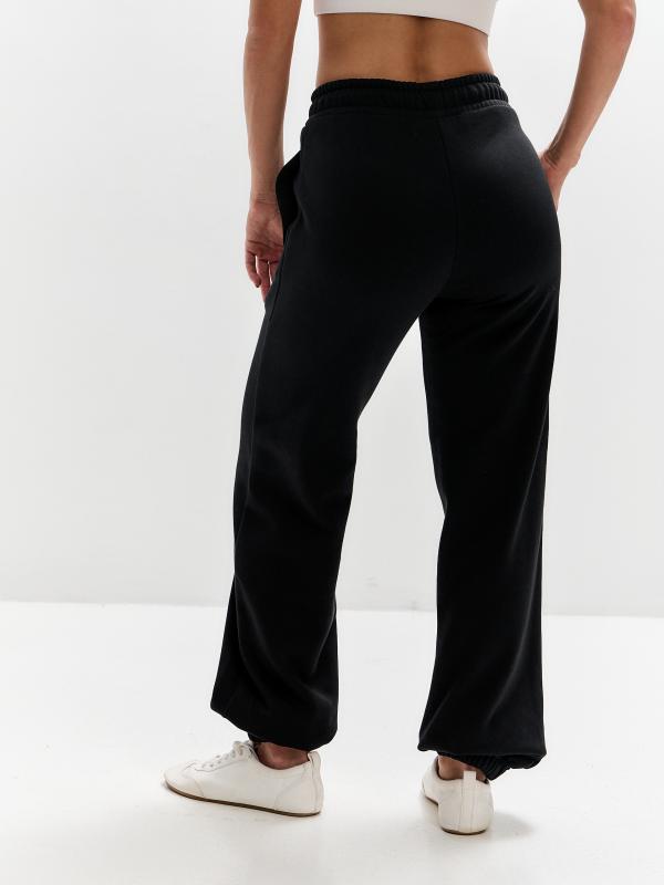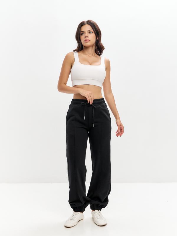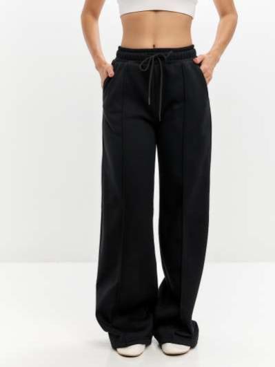Женские артикул 22L-RR-1873 черного цвета брюки изготовлены из хлопкового трикотажного полотна с изнаночным начесом. Широкие брючины заужены книзу на эластичную тесьму. Строчка по передним половинкам, имитирующая стрелку, выгодно вытягивает силуэт брюк. Удобные карманы выполнены в боковых швах. Пояс брюк широкий, по линии талии собран на эластичную резинку, длина пояса дополнительно регулируется шнуром.