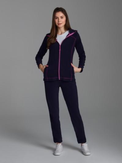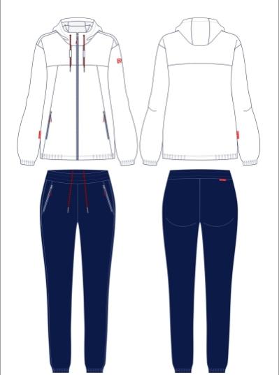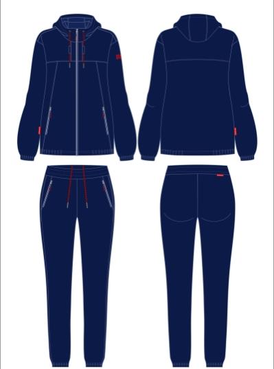 Спортивный костюм выполнен из полиэстеровой ткани с изнаночным начесом в классической цветовой расцветке с капюшоном. Капюшон на подкладке из сетки, ширину капюшона по краю можно регулировать с помощью шнура. Карманы на куртке и брюках прорезные с листочками на молнии. Идеальную посадку по фигуре обеспечивает эластичная трикотажная рибана по низу куртки и низу рукавов. По линии реглана, на полочках и на рукавах в области локтя цветные вставки из основного контрастного полотна, которые позволяют костюму создать яркий образ фирменного стиля. Брюки прямые. Пояс по линии талии регулируется шнурком. На левой полочке выполнена вышивка "