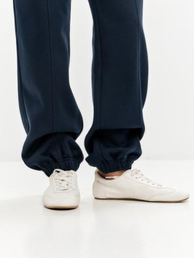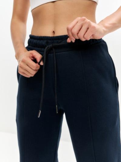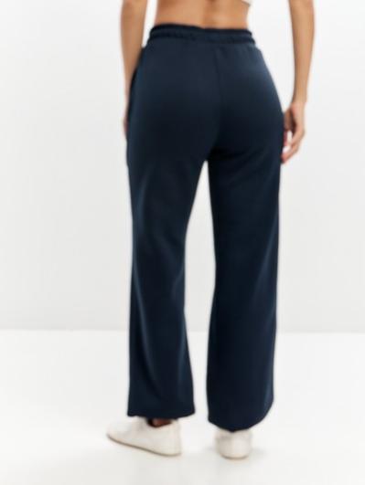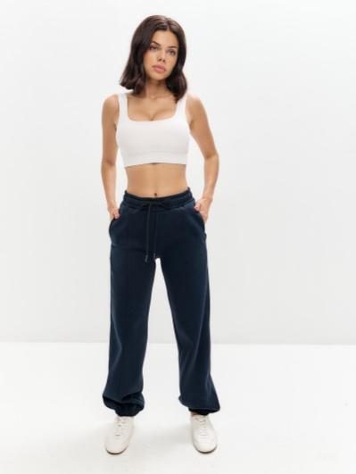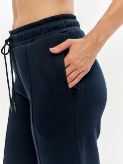 Женские артикул 22L-RR-1873 темно-синего цвета брюки изготовлены из хлопкового трикотажного полотна с изнаночным начесом. Широкие брючины заужены книзу на эластичную тесьму. Строчка по передним половинкам, имитирующая стрелку, выгодно вытягивает силуэт брюк. Удобные карманы выполнены в боковых швах. Пояс брюк широкий, по линии талии собран на эластичную резинку, длина пояса дополнительно регулируется шнуром.