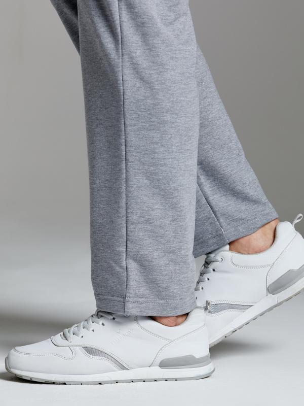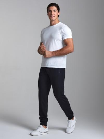 Брюки мужские из хлопкового трикотажного полотна на манжетах из рибаны. Карманы выполнены в боковых швах, застегиваются на молнии. Пояс по талии регулируется шнурком.