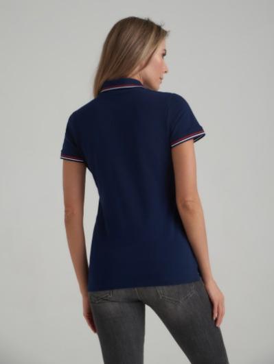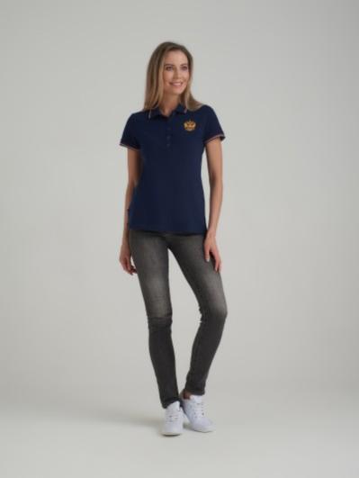 . Воротник и манжеты на коротких рукавах из эластичной трикотажной рибаны синего цвета с бело-красной полосой . На полочке удлиненная застежка-планка на пуговицах. На полочке вышивка "