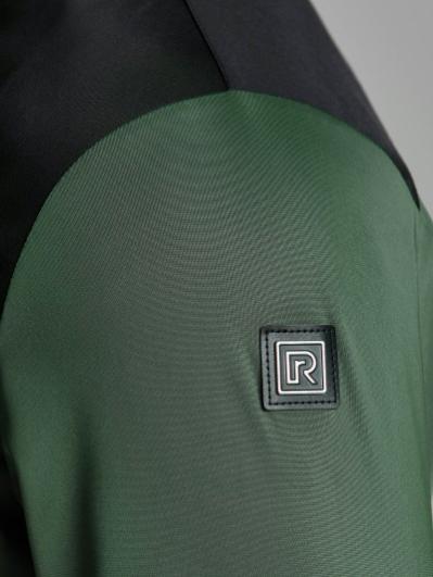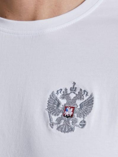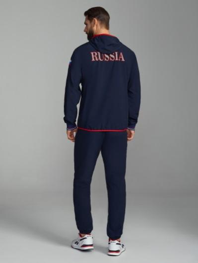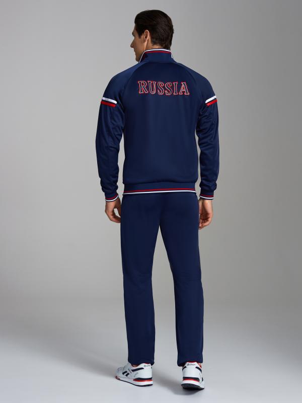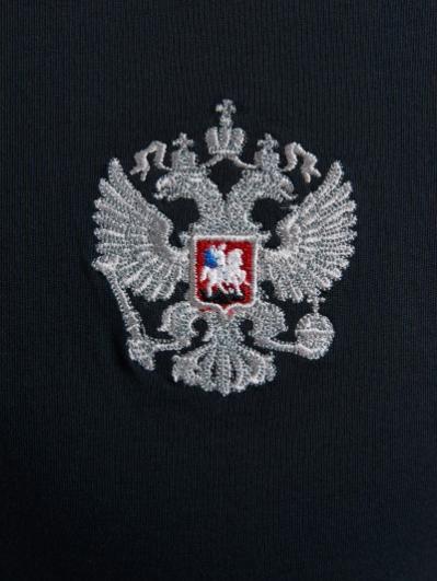 , На левом рукаве вышивка аппликация - флаг России, на спине надпись RUSSIA. Все вышивки выполнены цветными шелковыми нитями. Брюки костюма на сетчатой подкладке, слегка заужены книзу за счет эластичной резины. Карманы брюк прорезные с открытыми молниями. Слева под карманом настрочен шеврон с фирменным логотипом.
