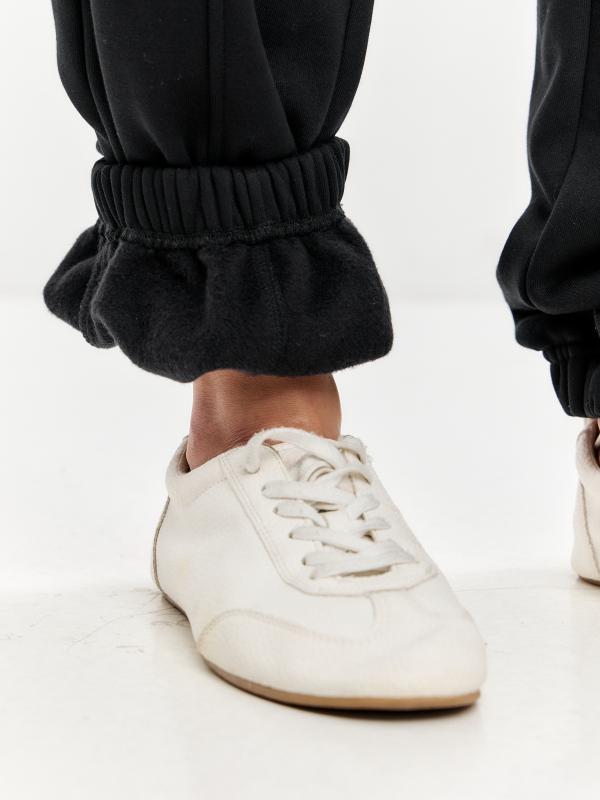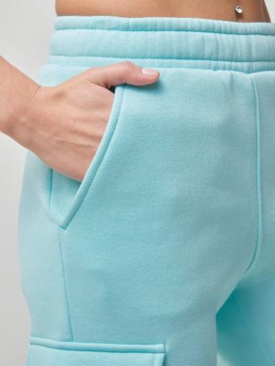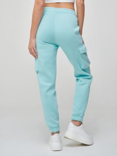 из плотного и мягкого хлопкового трикотажного полотна с изнаночным начесом. Карманы верхние прорезные с бочком. Есть дополнительные боковые накладные карманы, объемные, с клапанами. Низ брюк заужен и присобран на манжету с эластичной резиной. Пояс брюк дополнительно регулируется шнуром.