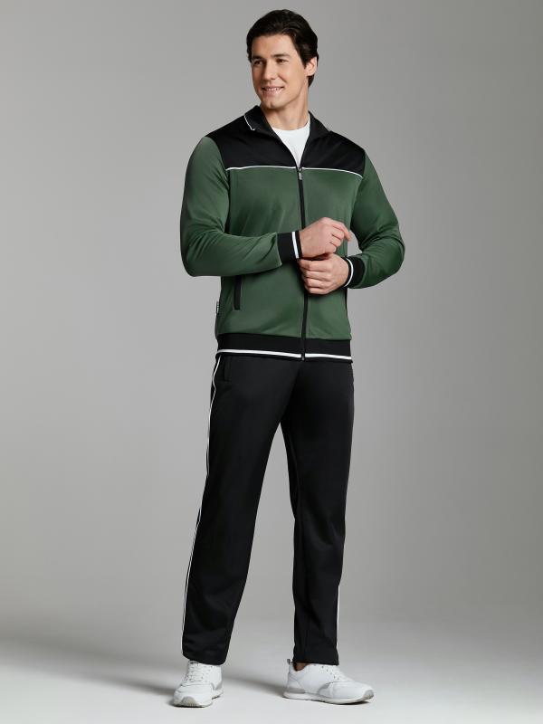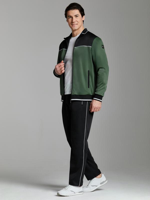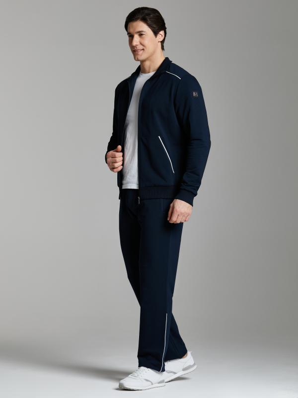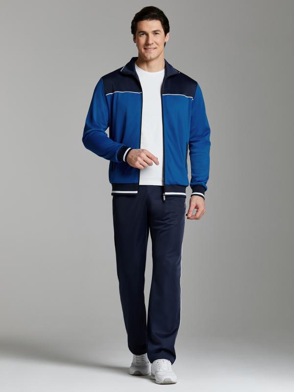 Мужской спортивный костюм из эластичного хлопкового трикотажного полотна. Куртка прямая с воротником, застегивается на молнию. Рукава втачные.Воротник, манжеты и пояс куртки выполнены из эластичного трикотажа. Брюки прямого силуэта. Прорезные карманы куртки и брюк застегиваются на молнии. Пояс брюк эластичный, по линии талии дополнительно регулируется шнуром.