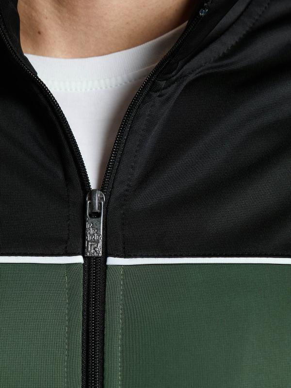 Спортивный мужской костюм изготовлен из легкой плащевой ткани с добавлением лайкры, которая при носке обладает упругим растяжением подобно трикотажному полотну. Куртка на молнии с капюшоном, с подкладкой из легкой трикотажной сетки. Силуэт куртки прямой, низ окантован трикотажной тесьмой. Карманы прорезные, с открытыми молниями. Крой рукава - втачной, низ рукава слегка заужен трикотажным манжетом в контрастными полосами. Слева на груди вышивка "