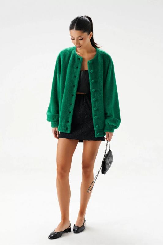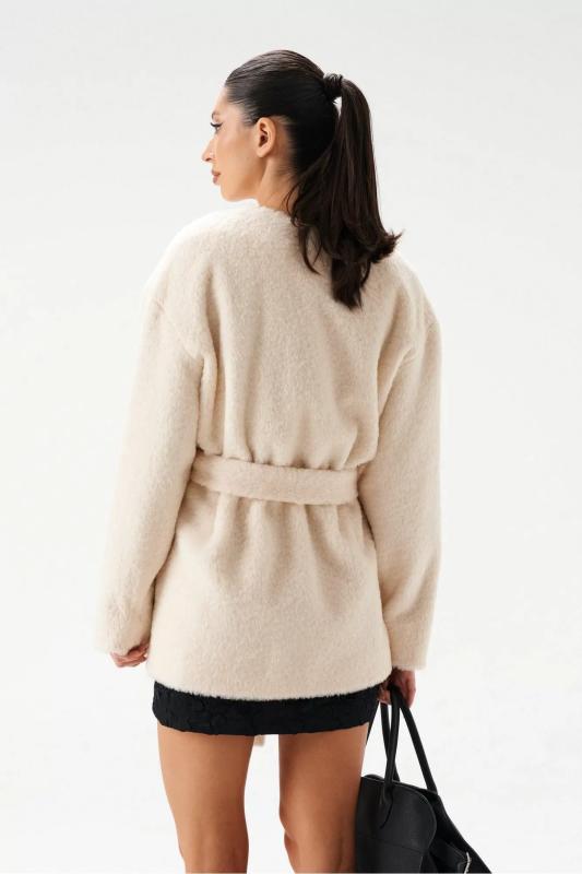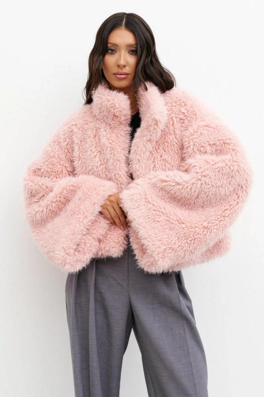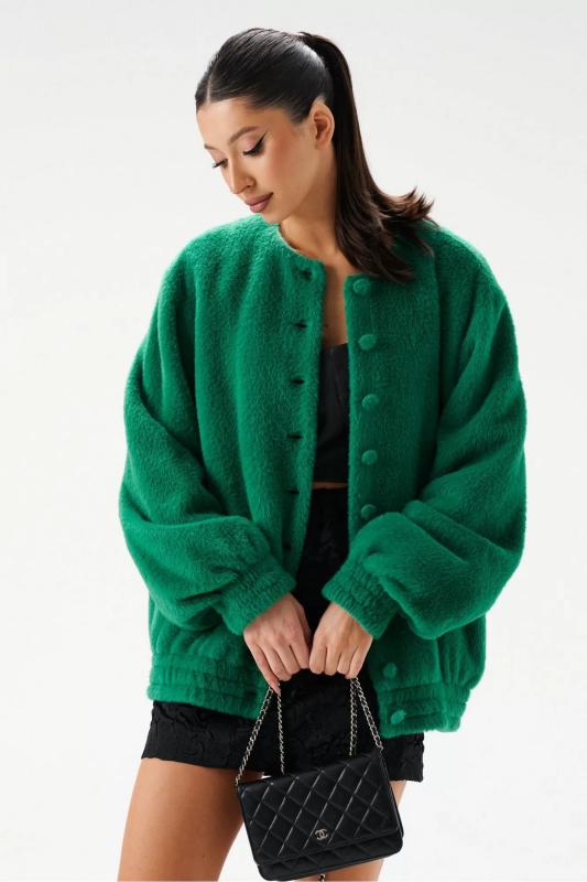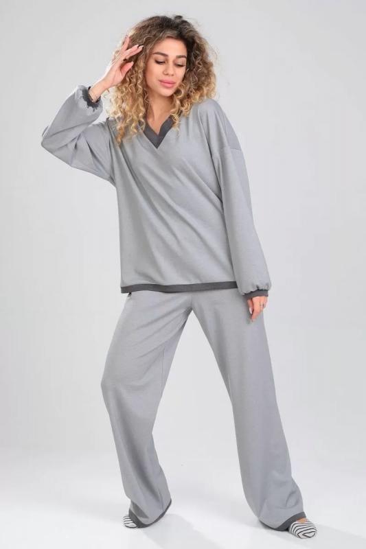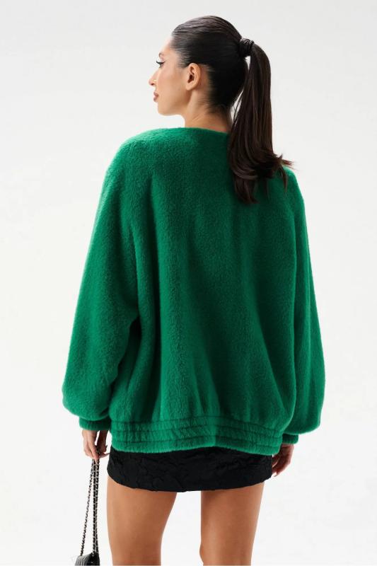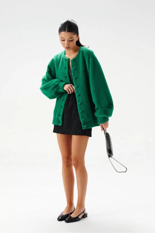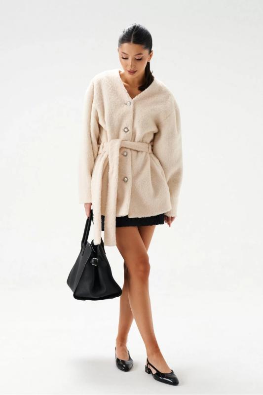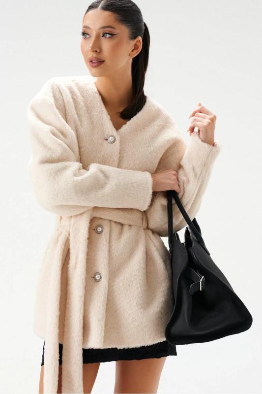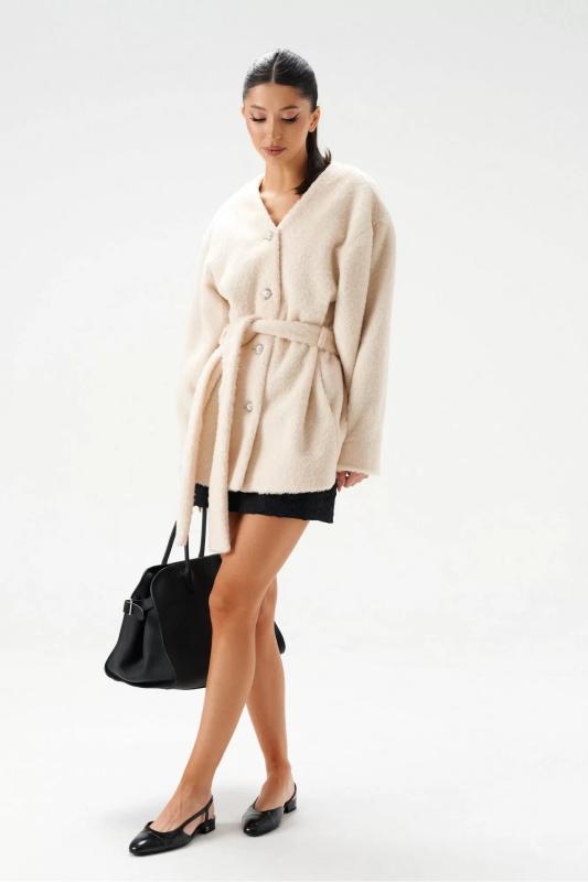 Свободного силуэта с длинным рукавом покроя реглан и воротником - хомутиком. С отстрочками из метанити, тесьмой и фурнитурой на манжетах. По низу - на притачном поясе. Полотно - однотонная «ангора» (имитация). Рост 170.