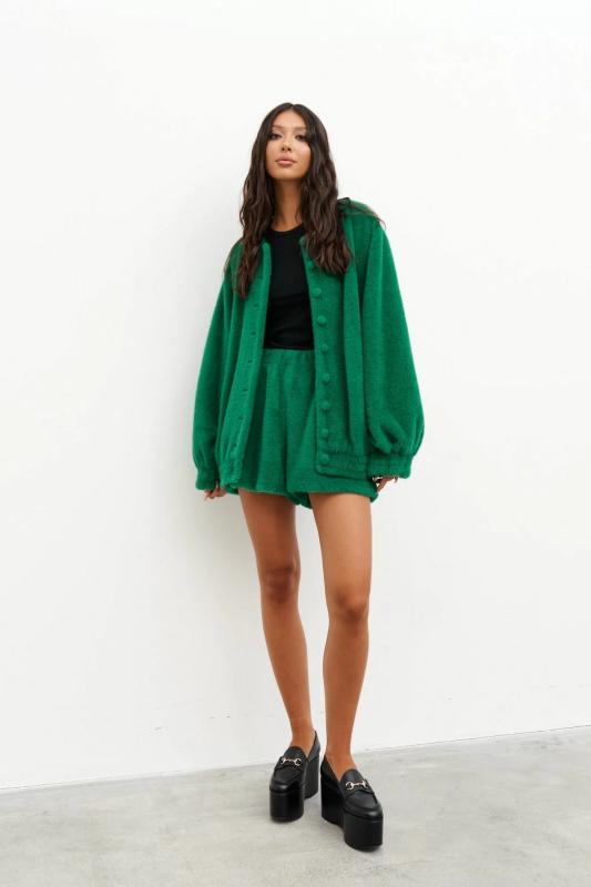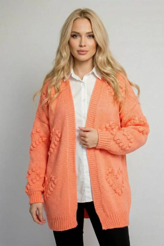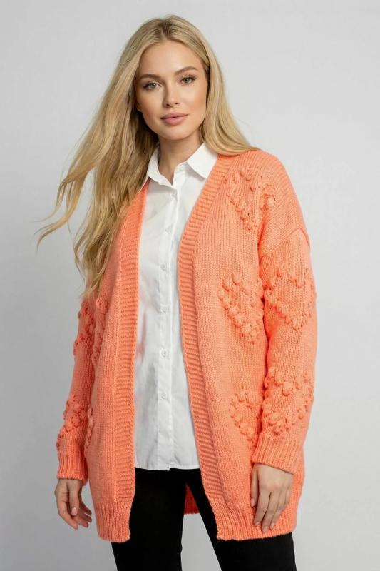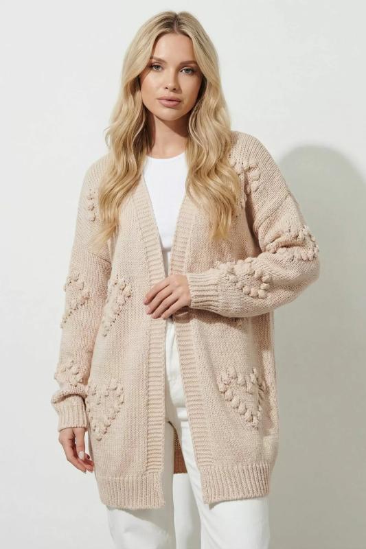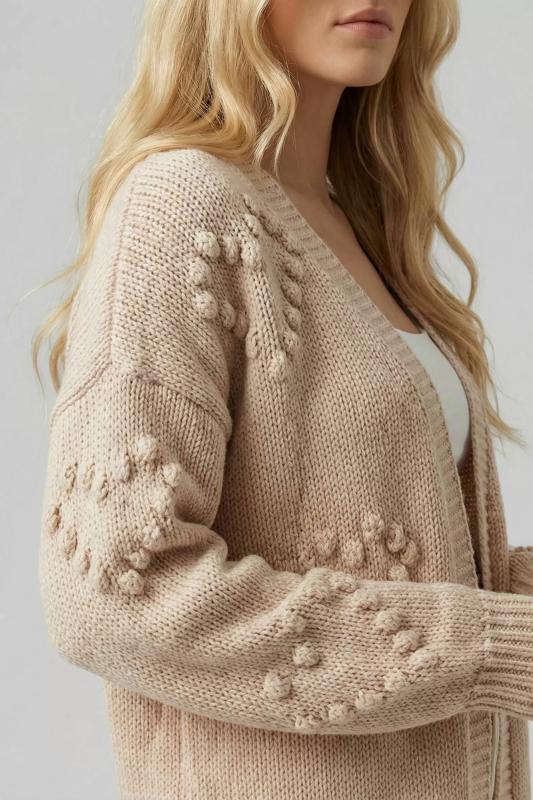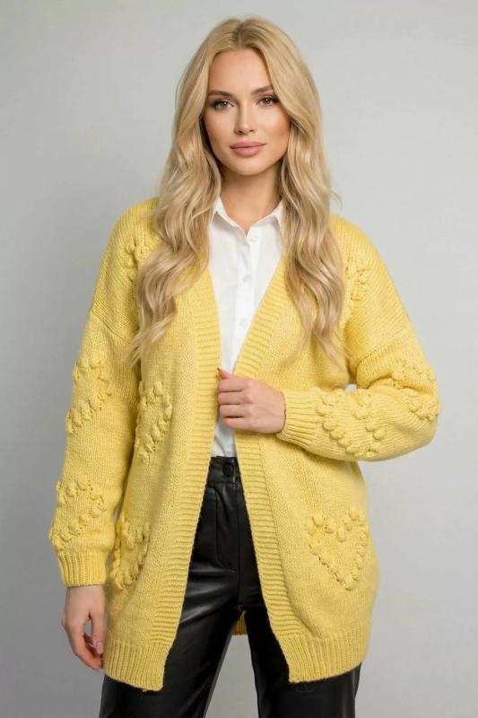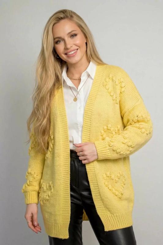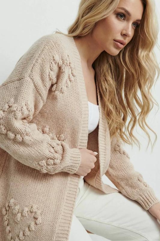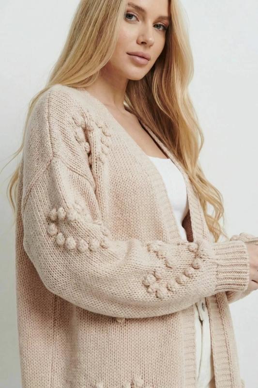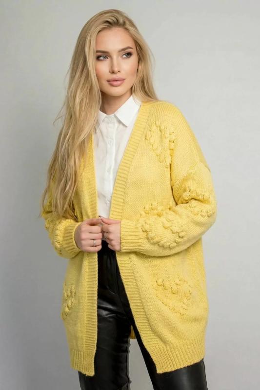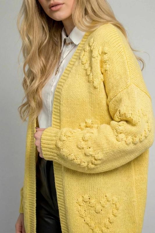 Жакет женский вязаный желтый удлиненный кардиган оверсайз Стильный удлиненный женский жакет в нежном бежевом оттенке — уютная и элегантная модель для создания комфортных образов в прохладную погоду. Вязаный кардиган выполнен из качественной пряжи с содержанием шерсти и PAN (полиакрил), благодаря чему он мягкий, теплый, хорошо держит форму и отличается износостойкостью. Свободный крой oversize, глубокий V-образный вырез и отсутствие застежки делают модель универсальной для многослойных образов. Объемные рукава и фактурная вязка с декоративным узором придают жакету особую выразительность и трендовый акцент. Удлиненная длина визуально вытягивает силуэт и обеспечивает дополнительный комфорт. Жакет отлично сочетается с брюками, джинсами, юбками, топами и базовыми лонгсливами. Подходит для повседневной носки, офиса в стиле casual, прогулок, путешествий и уютных осенних и весенних образов.