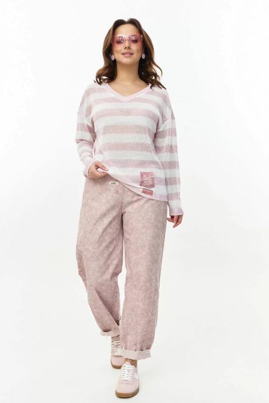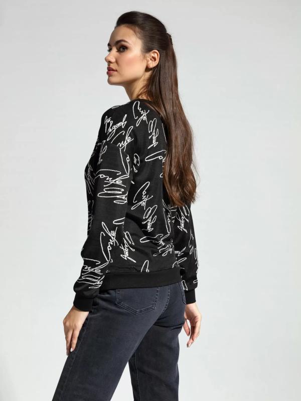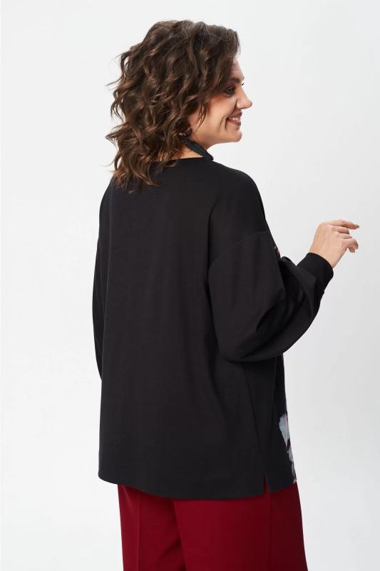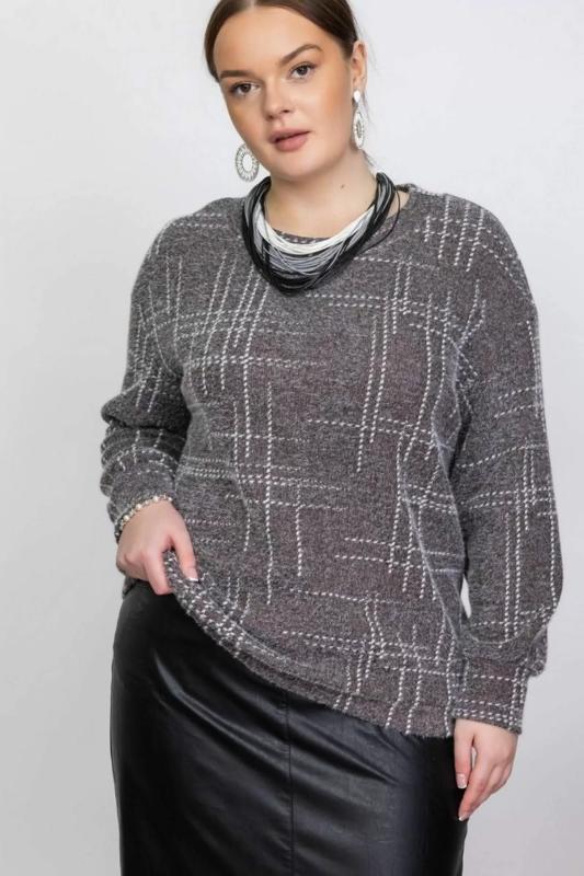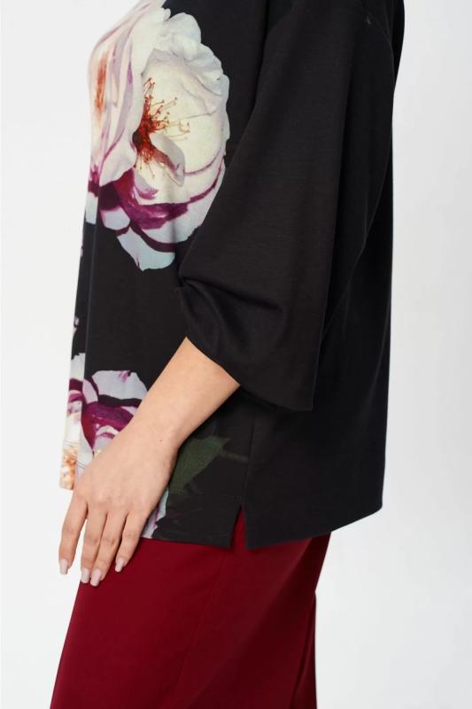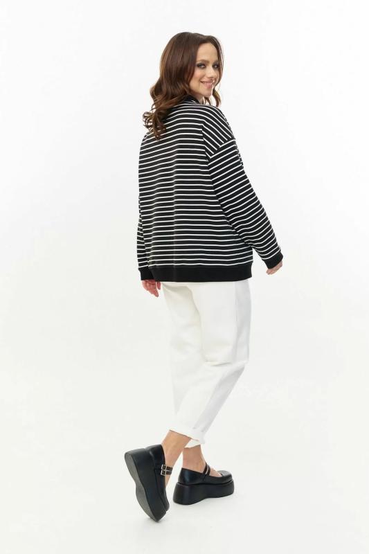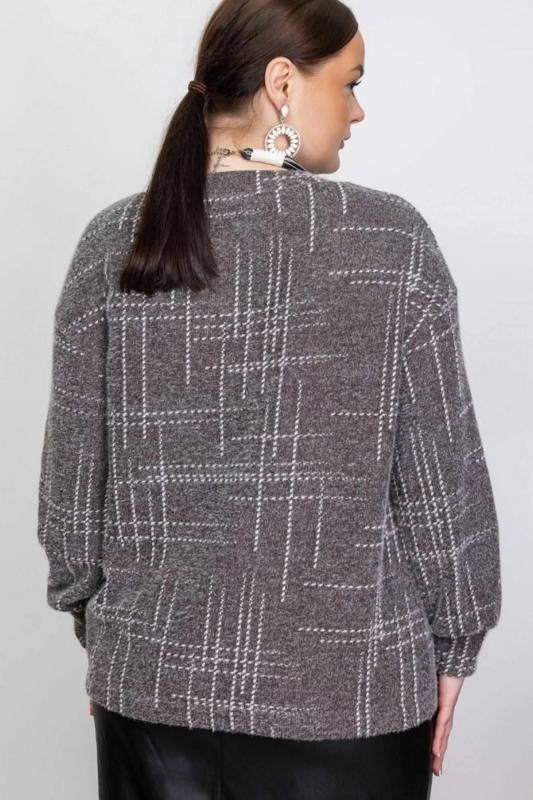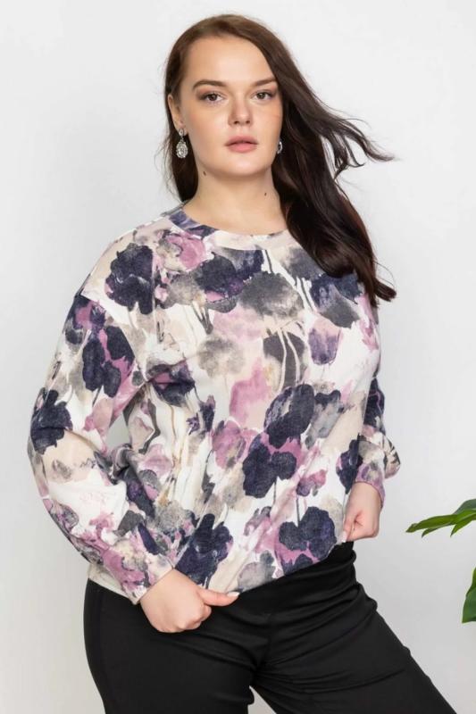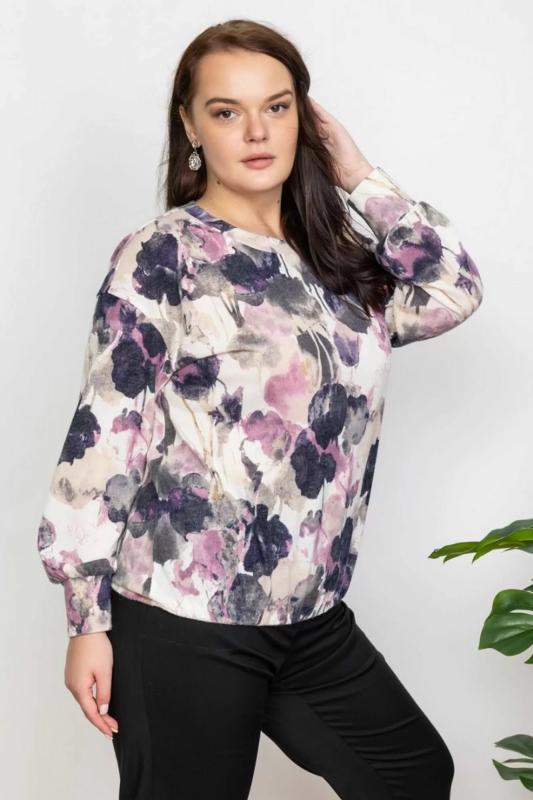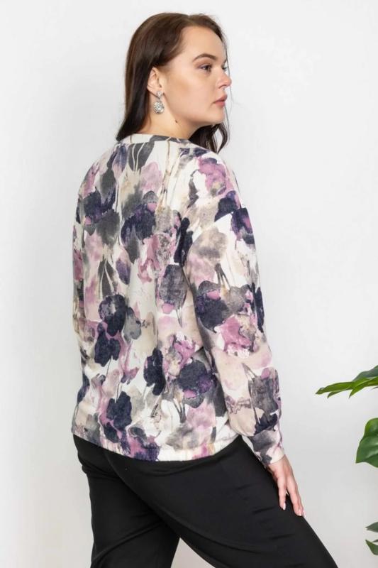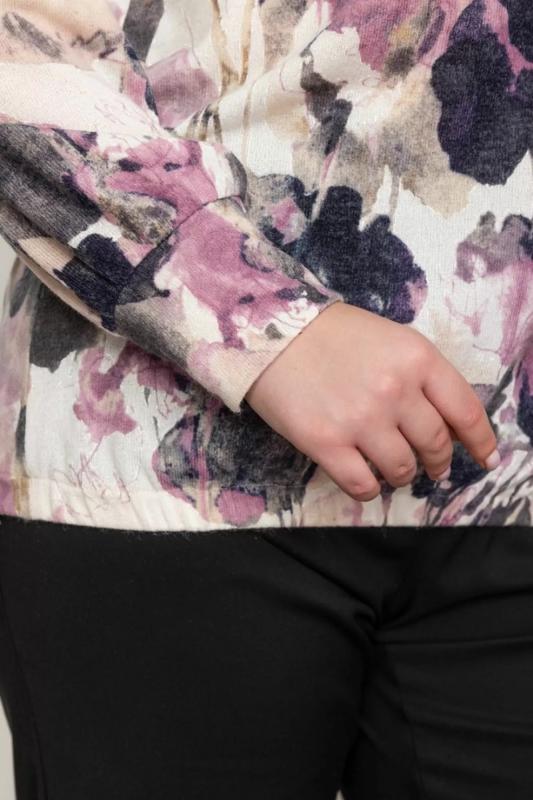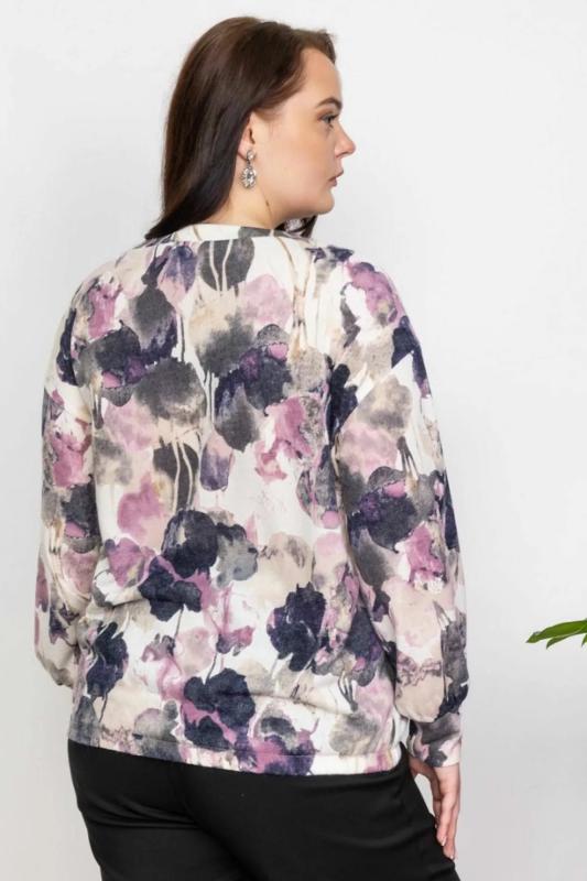 Джемпер свободного силуэта из трикотажной ткани с принтом. Рукав втачной одношовный со складками по низу и манжетой. Горловина лодочкой обработана планкой. В боковых швах по низу разрезики. Длина джемпера - 68 см, длина рукава джемпера - 53 см.