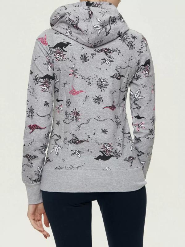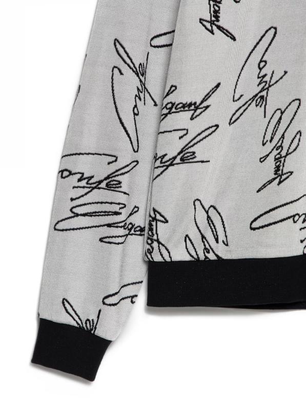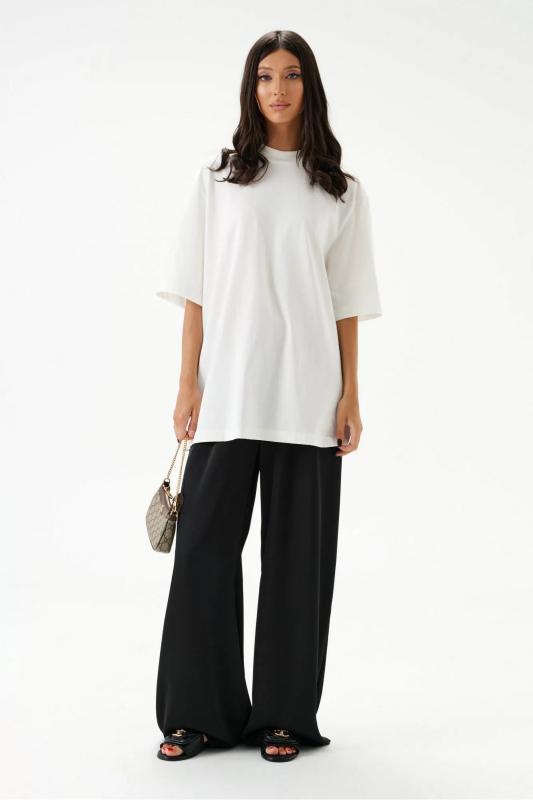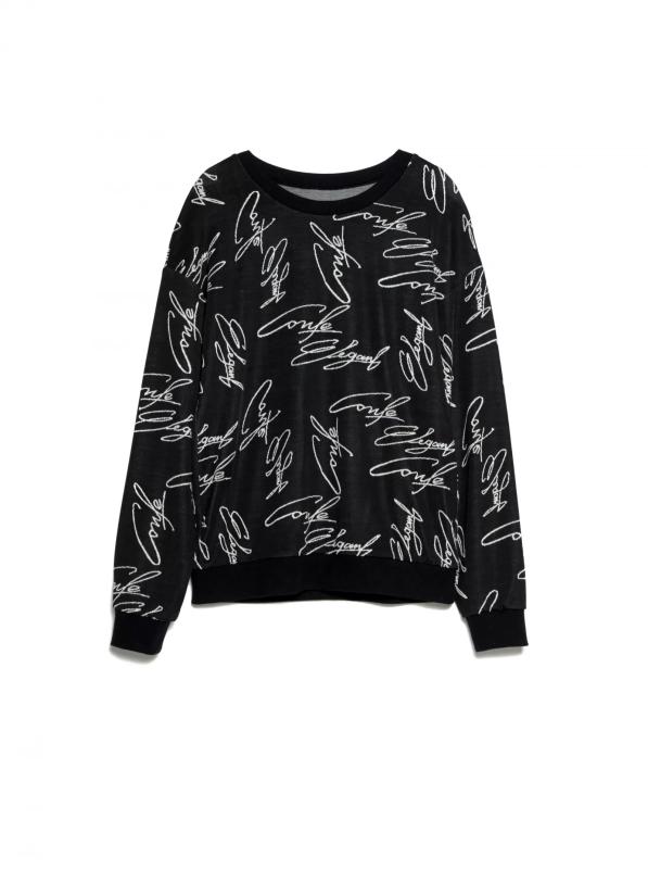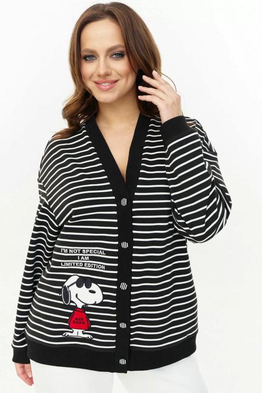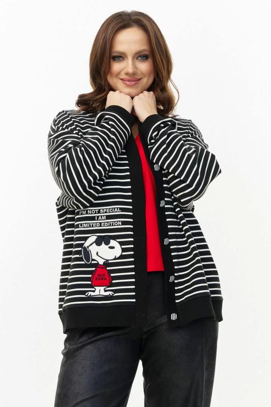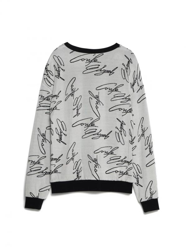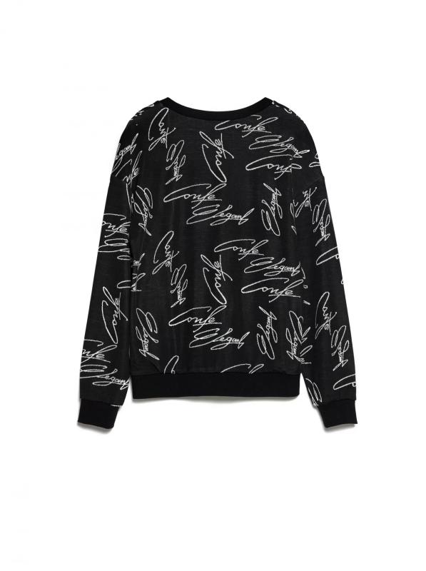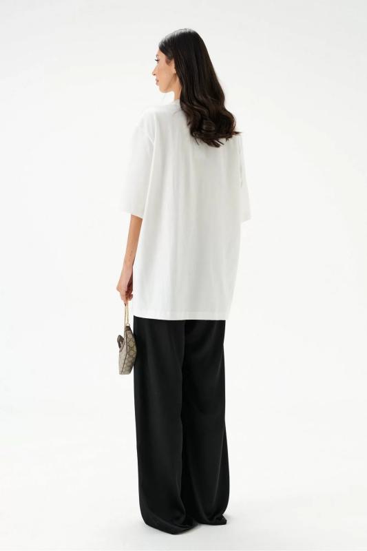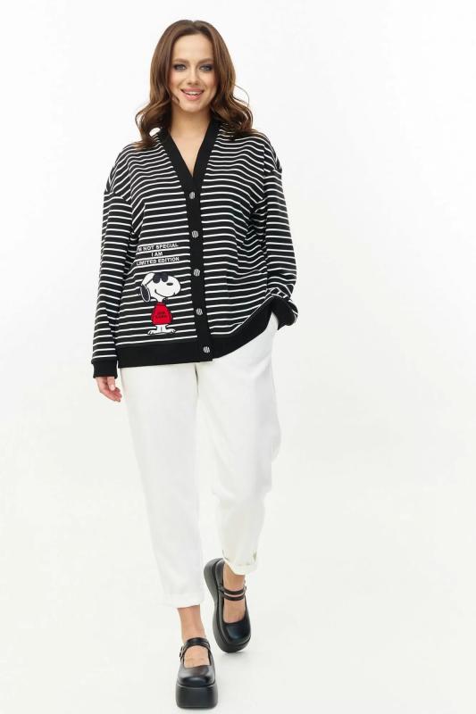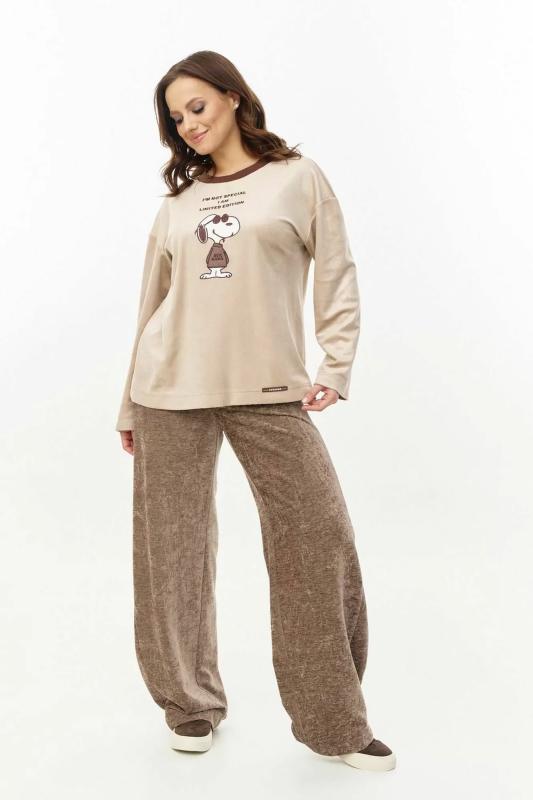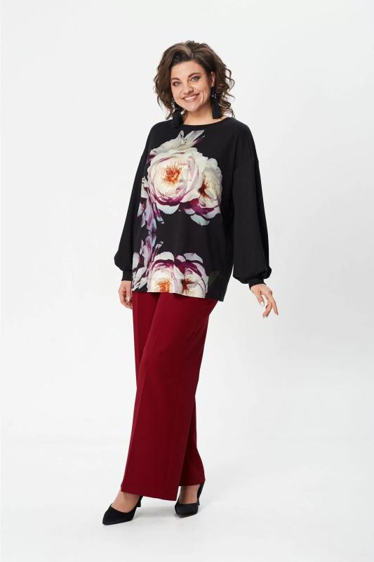 Джемпер свободного силуэта из трикотажной ткани с принтом. Рукав втачной одношовный со складками по низу и манжетой. Горловина лодочкой обработана планкой. В боковых швах по низу разрезики. Длина джемпера - 68 см, длина рукава джемпера - 53 см.