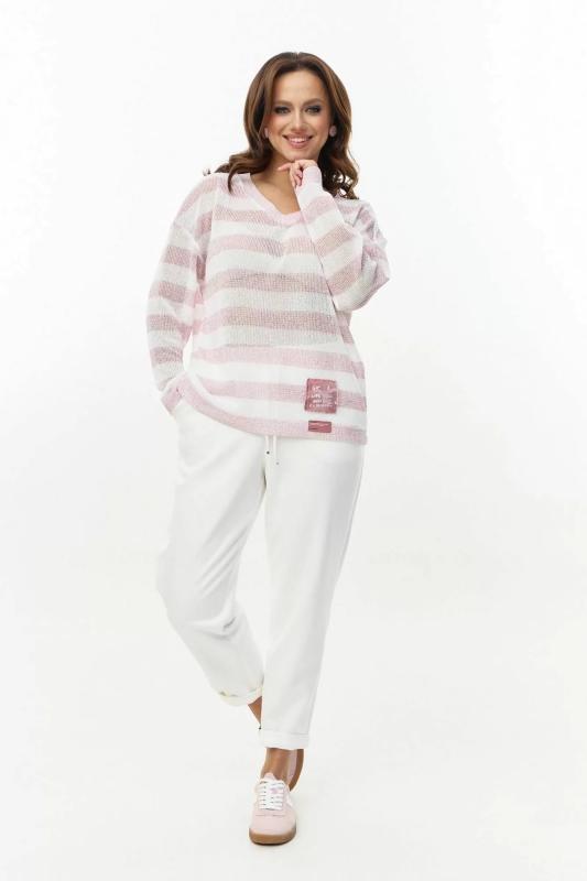 В универсальном джемпере свободного кроя из приятного на ощупь трикотажа будет комфортно в любое время года. Крой джемпера подарит комфорт, уют и свободу движений. Он будет отлично смотреться с джинсами, легинсами или широкими брюками палаццо. V-образный вырез горловины удлинит шею и визуально вытянет силуэт. Рукав втачной длинный со спущенной линией плеча, по низу рукава широкая манжета. Низ изделия и манжеты рукава выполнены из трикотажа контрастной расцветки, создающие акценты в нужных местах. Длина джемпера: 67 см Длина рукава от горловины: 75 см