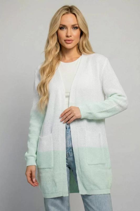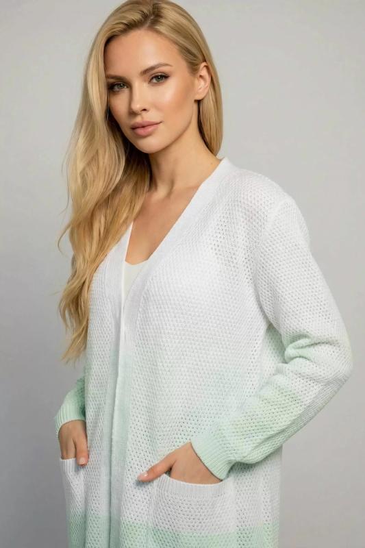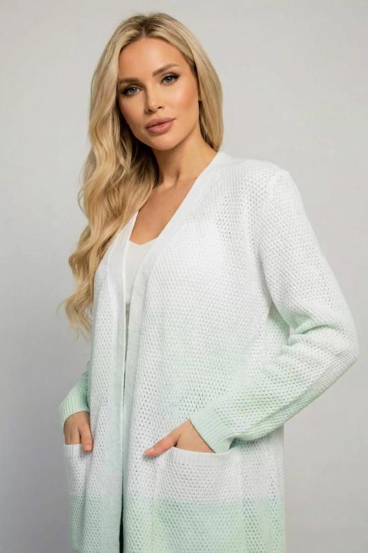 Жакет женский вязаный из хлопка, удлиненный кардиган с карманами Стильный женский жакет в нежном мятно-белом оттенке — легкая и универсальная модель для весенне-летнего и демисезонного гардероба. Удлиненный кардиган выполнен из качественной пряжи с содержанием хлопка и PAN (полиакрил), что обеспечивает отличную воздухопроницаемость, мягкость и износостойкость. Натуральный хлопок дарит комфорт и приятные тактильные ощущения, а PAN помогает изделию сохранять форму и цвет после стирки. Свободный прямой силуэт, отсутствие застежки и лаконичный V-образный вырез делают модель удобной для многослойных образов. Фактурная вязка придает жакету стильный объем и визуальную глубину. Накладные карманы добавляют практичности и создают расслабленный casual-образ. Кардиган отлично сочетается с джинсами, брюками, юбками, платьями и базовыми топами. Подходит для повседневной носки, работы в офисе, прогулок, путешествий и создания стильных образов в стиле casual и smart casual.
