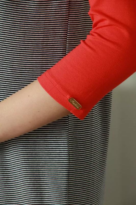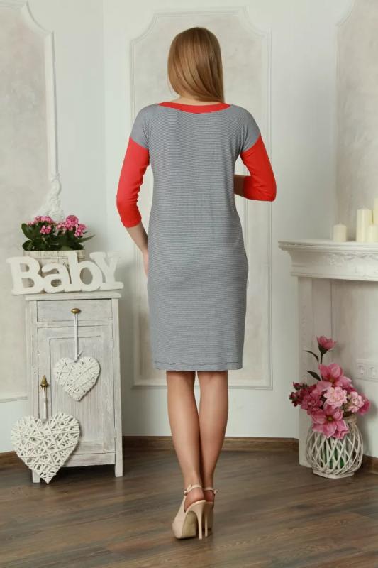 из эластичного полотна в мелкую полоску деликатного свободного кроя, который красиво подчеркнет изменяющиеся формы животика от первых до последних дней беременности. Платье без молнии. Рукав втачной, приспущенный, 3-4. Платье прекрасно подойдет и после родов. Длина платья: р.44-48 - 89см, р.50-54 - 91см. Длина рукава от среза горловины - 46см