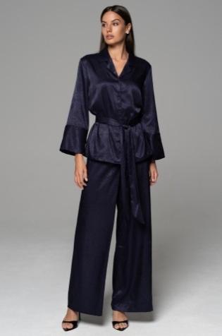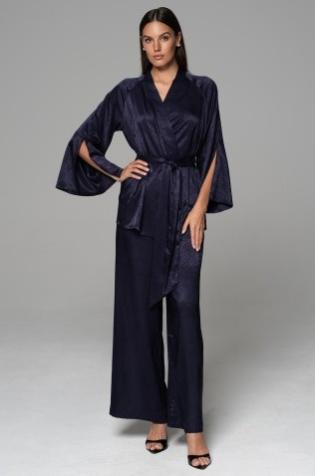 Комплект Mia-Amore состоит из рубашки с рукавами длиной 7-8, с центральной застежкой на пуговицы и брюк, выполнен из принтованного смесового шелка. Борт, воротник, рукава по низу украшены контрастным кантом. Рубашка запахивается на пояс с золотыми декоративными кисточками.