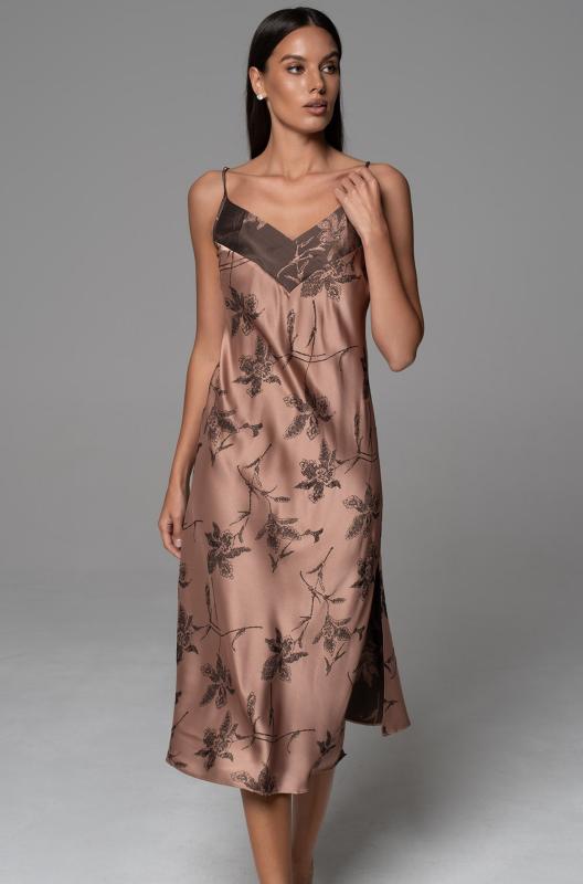 Длинная сорочка Mia-Amore без подреза на тонких регулируемых бретелях выполнена из жаккардового двухцветного смесового шёлка. Спереди лиф украшен обтачкой из тёмного компаньона.