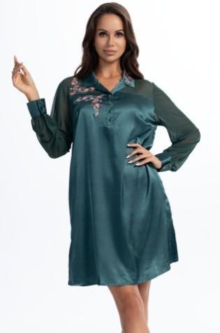 Платье-рубашка Mia-Amore с длинным рукавом, вставками на плечах из сетки и с разрезами по бокам. Цветочная вышивка на воротнике и плече украшена традиционной европейской вышивкой гладью. Ворот застегивается на пуговицы в тон платью, с металлическим ободком под бронзу.