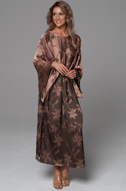 Комплект Mia-Amore состоит из блузы свободного силуэта с длинными рукавами и ассиметричной декоративной застёжкой на пуговицы и широких брюк. Комплект выполнен из жаккардового двухцветного смесового шёлка. Блуза выполнена в цветовом сочетании тёмного и светлого жаккарда. Брюки тёмного оттенка с эластичным поясом и с боковыми карманами.