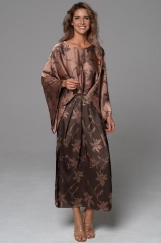 Длинный запашной халат Mia-Amore с длинными рукавами выполнен из принтованного смесового шёлка. Рукава декорированы по низу широким кружевом. Халат комплектуется широким поясом, в боковых швах карманы.