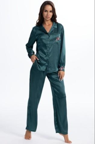 Комплект Mia-Amore из рубашки с длинным рукавом и брюк. Карман и манжеты рубашки украшены цветочной вышивкой, по низу брюк — вставка из кружева под мережку.