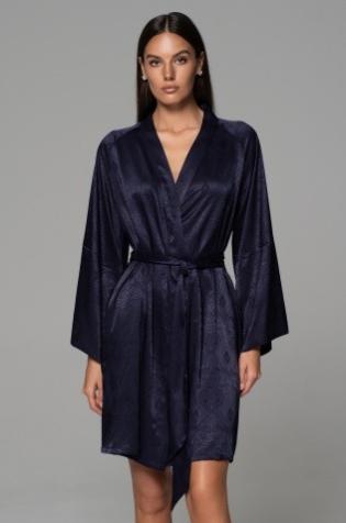 Короткий запашной халат Mia-Amore с длинным рукавом. Рукава дополнены разрезами. По бокам расположены карманы. Изделие выполнено из смесового шелкового жаккардового полотна. В комплекте широкий пояс.